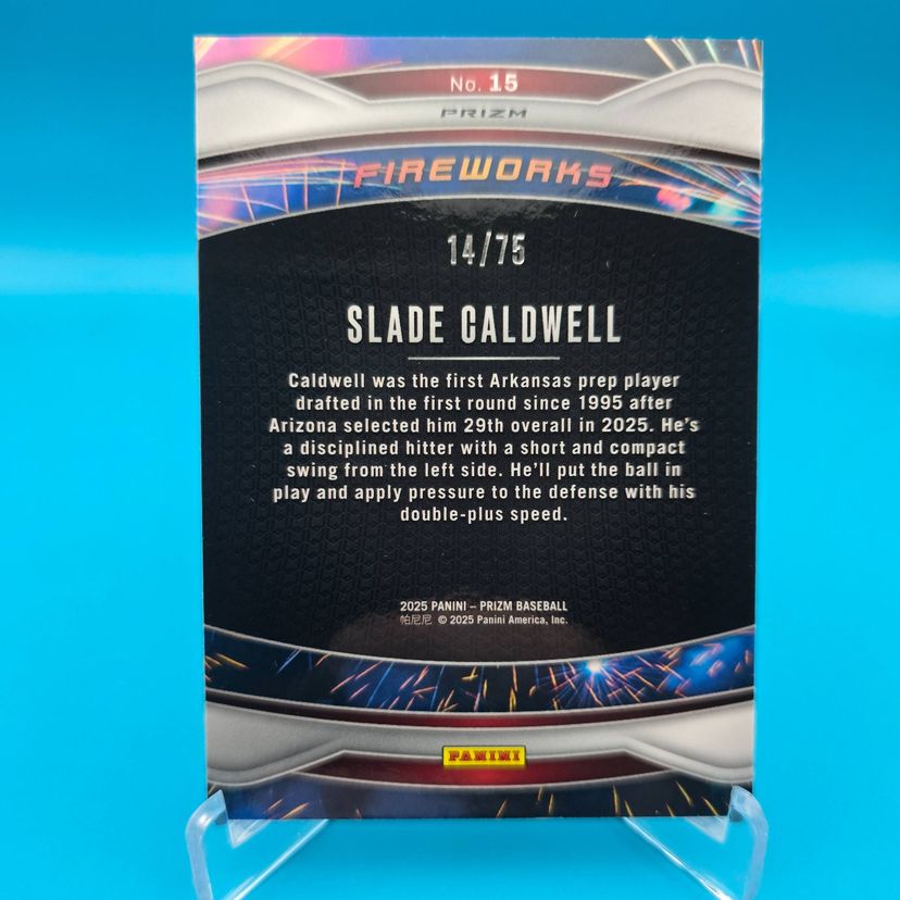 Top Diamondbacks prospect Slade Caldwell 2025 Prizm blue pulsar Fireworks numbered /75. NM or better condition. Shipped BMWT.