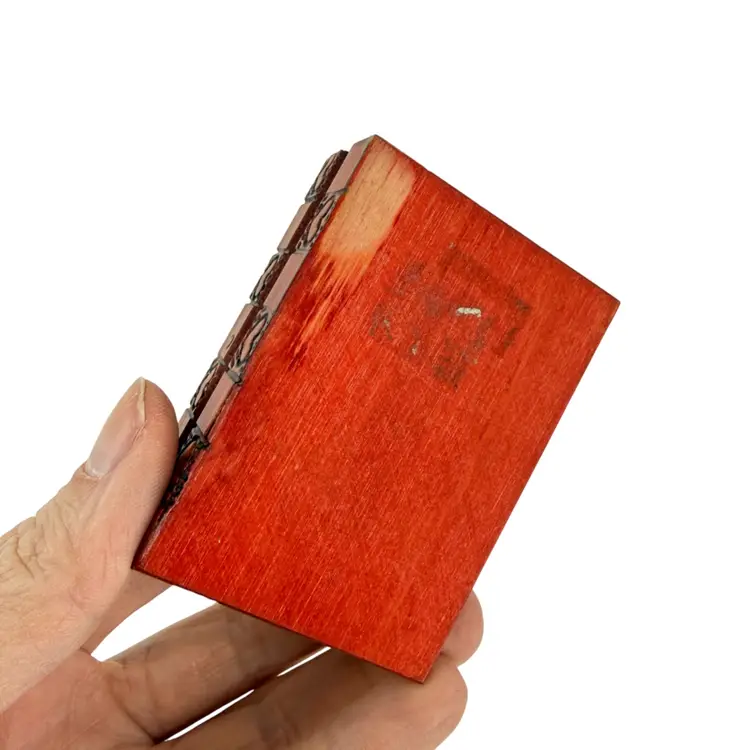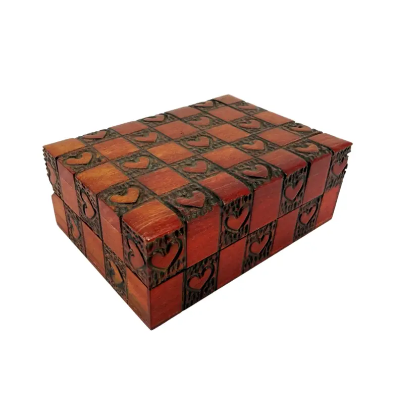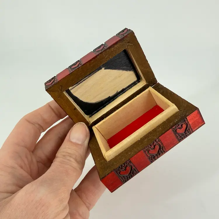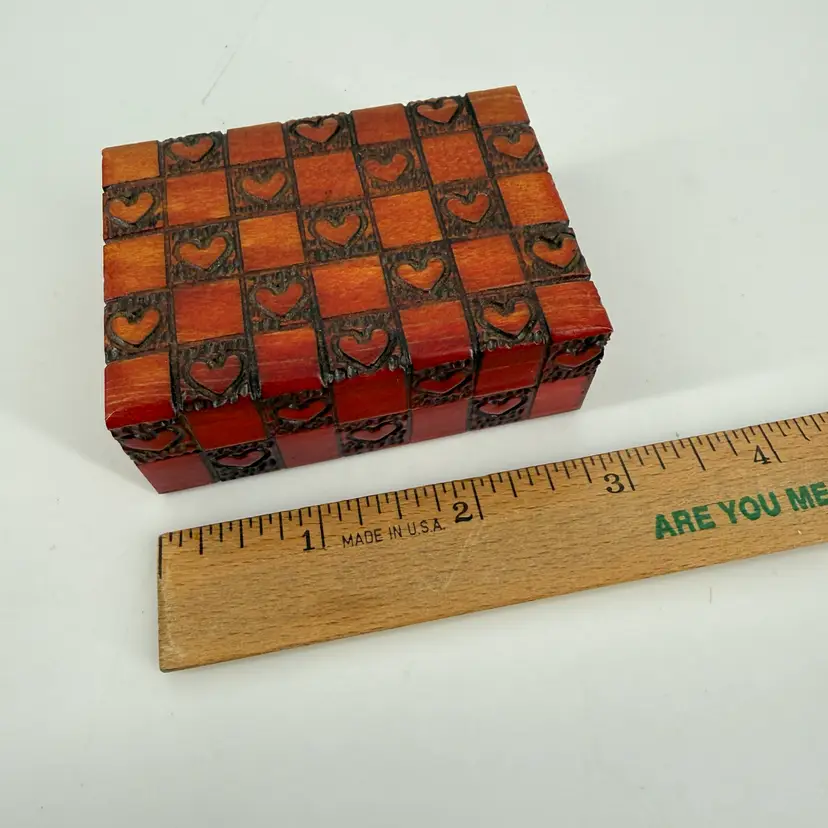 This carved, hinged wooden box measures approximately 3” wide. There are no markings or signatures on it.