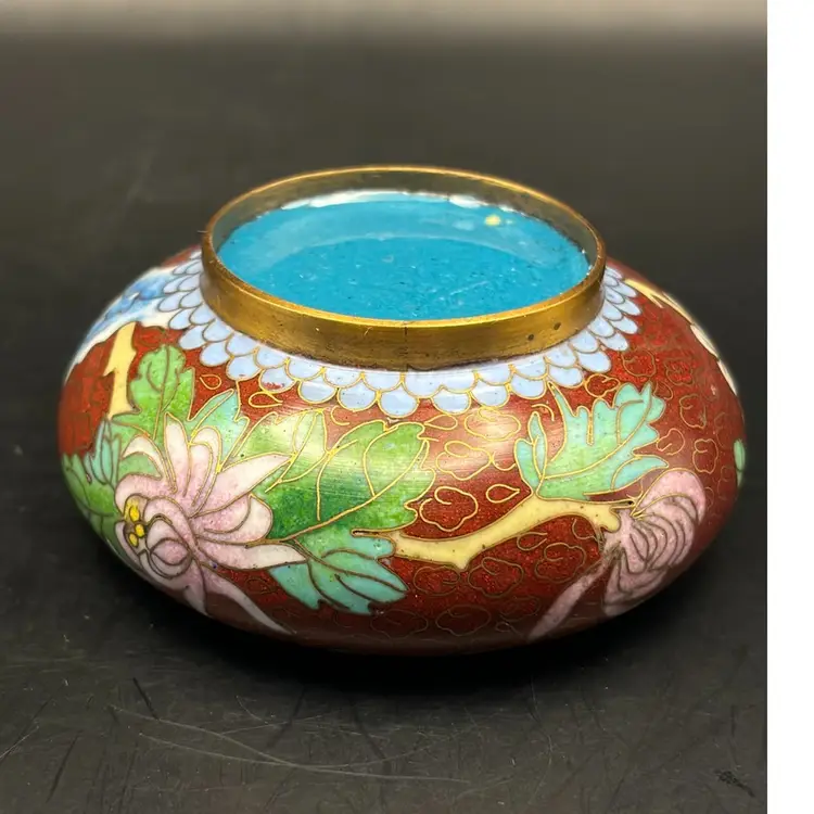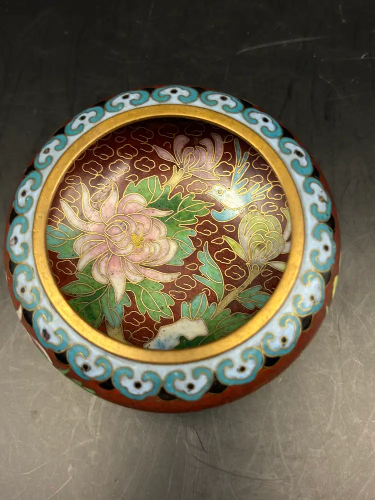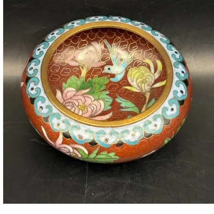 Pretty little cloisonné trinket dish beautifully decorated with flowers and blue birds. No chips or cracks 3” diameter