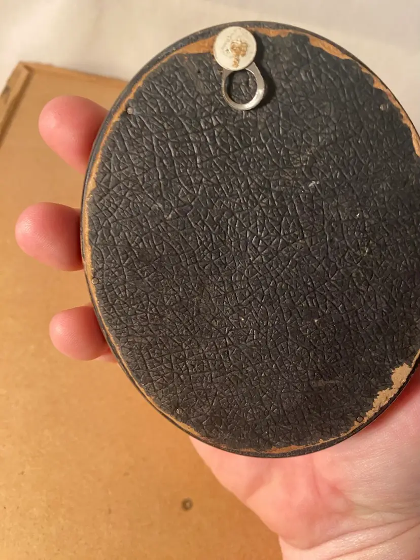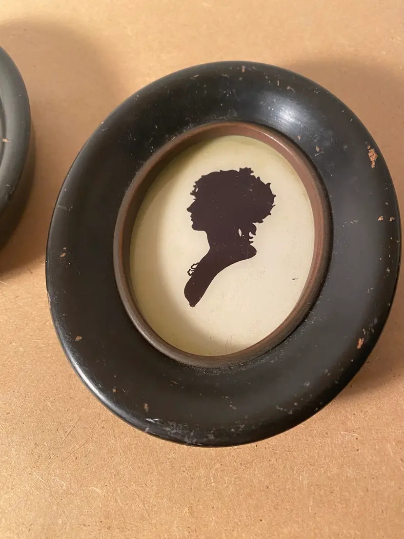 Black silhouette of man & woman on cream color inside black frame Frames have signs of wear 4.5 inches tall and 3.75 inches wide