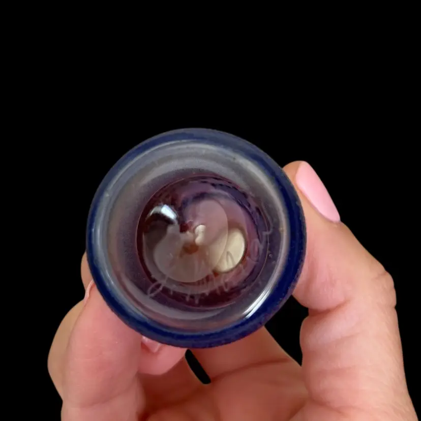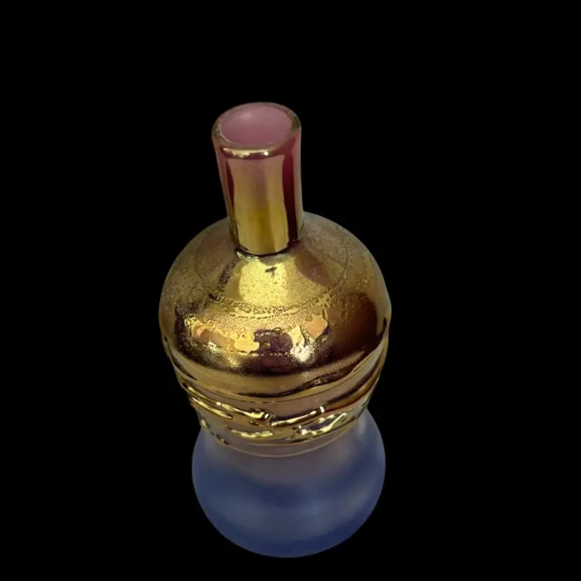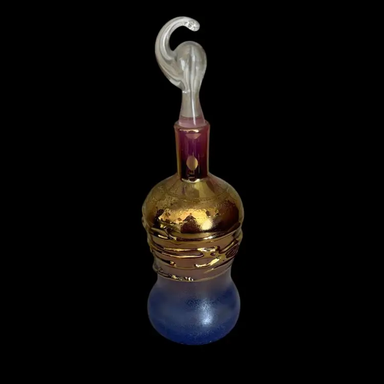 Beautiful and delicate tiny perfume bottle. Blue with a hint of purple and gold accent. Signed by artist No chips or cracks 1.25x4” Stopper 3.5”