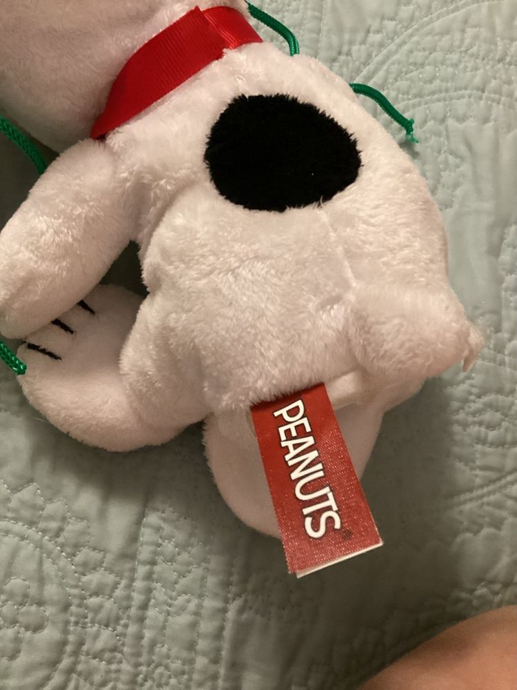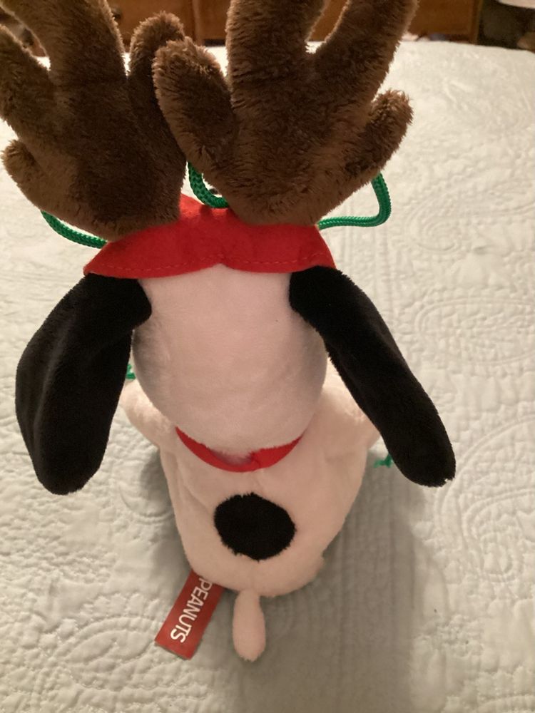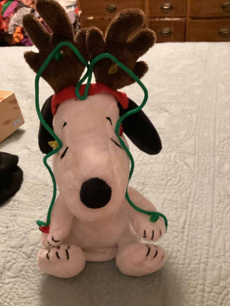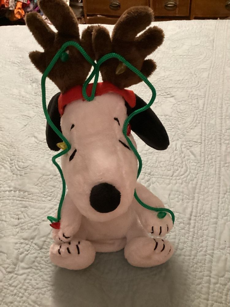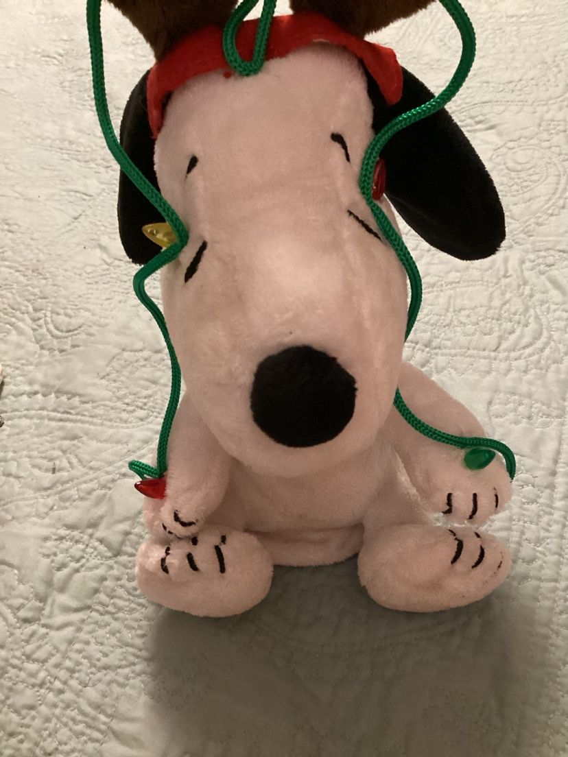 Snoopy Christmas light up stuffed animal. He does have a little of little bit of dirt on the bottom of him, but can be cleaned says peanuts. See video