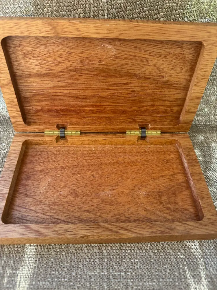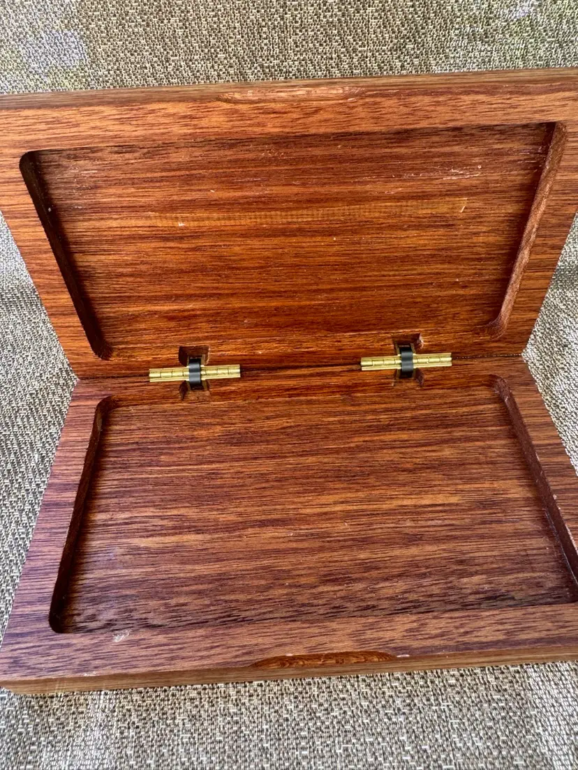 This solid wood box was previously used to hold some type of commemorative coins, but I think it would make a great decor piece to sit on a shelf, perhaps on top of a small stack of books. 7.5” X 4.5” X 1.5”
