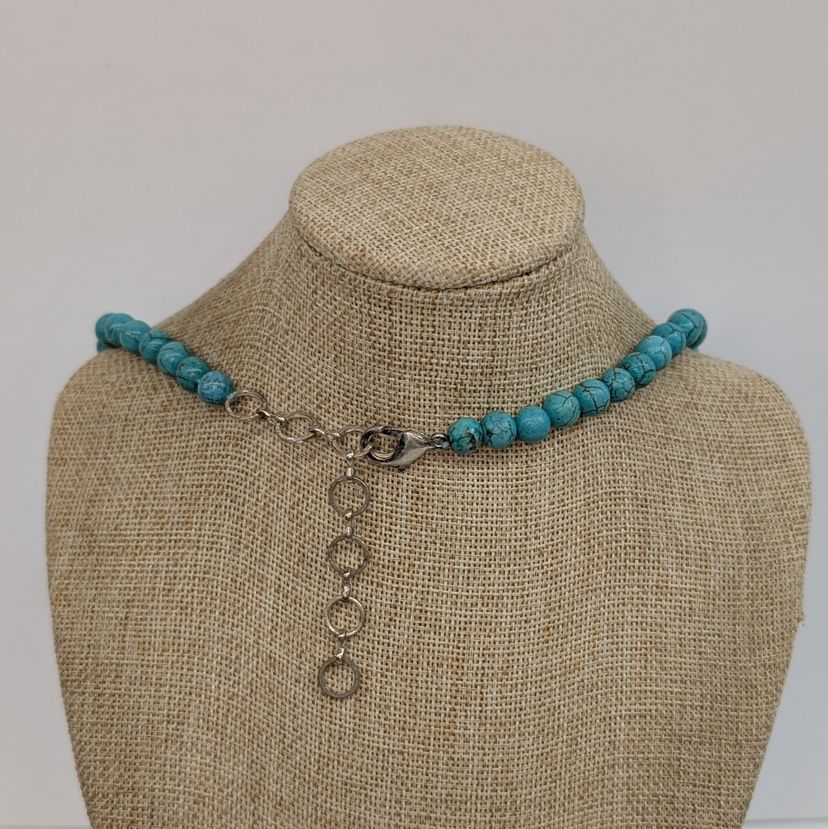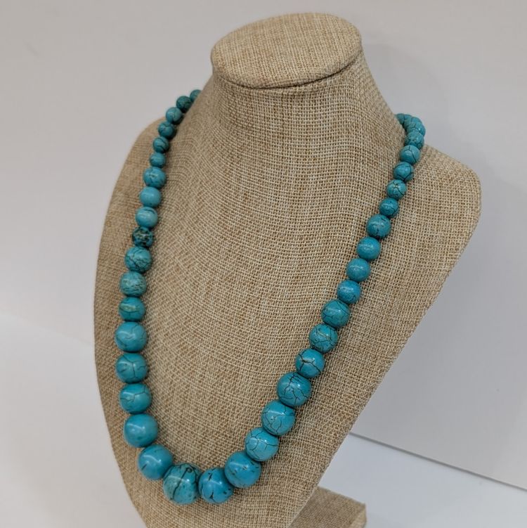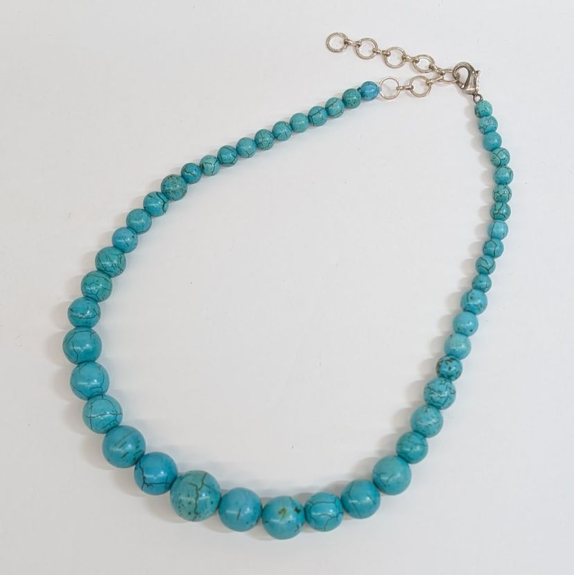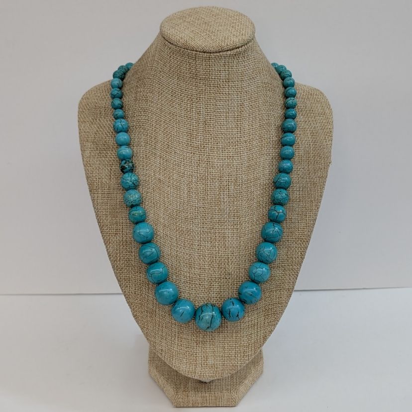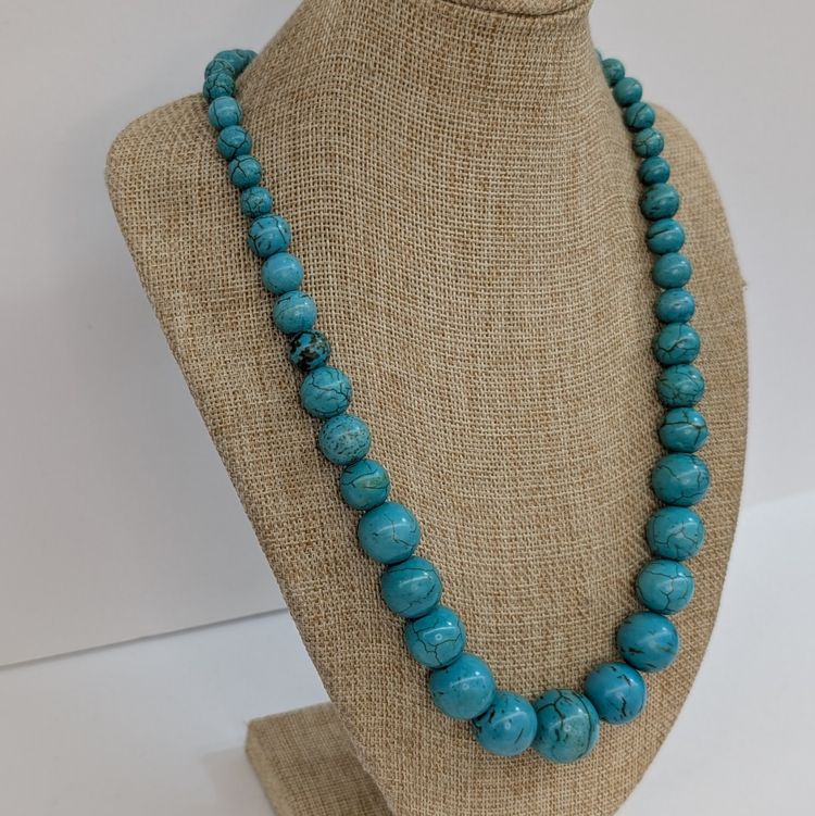 Lovely, graduated faux turquoise stone bead necklace. Some tarnish on the clasp/extender. Measurements ~ 23" long