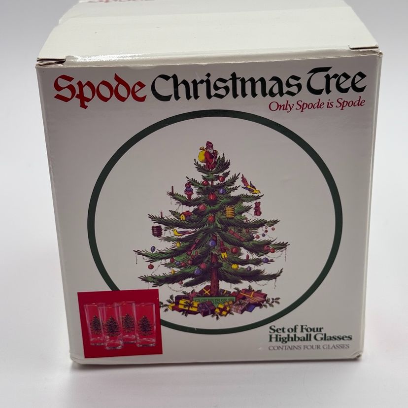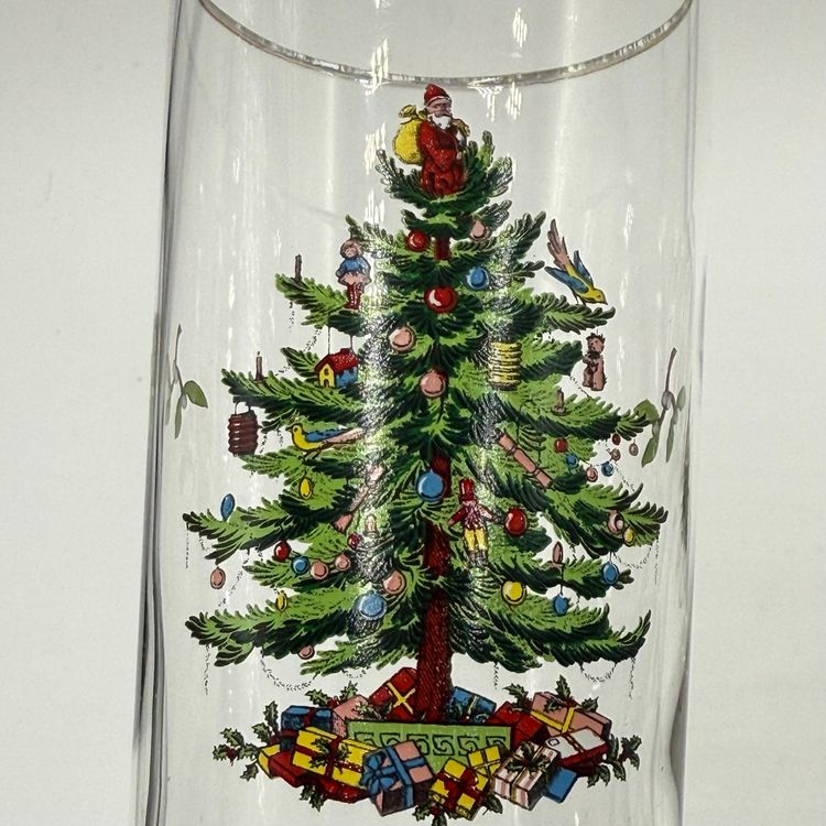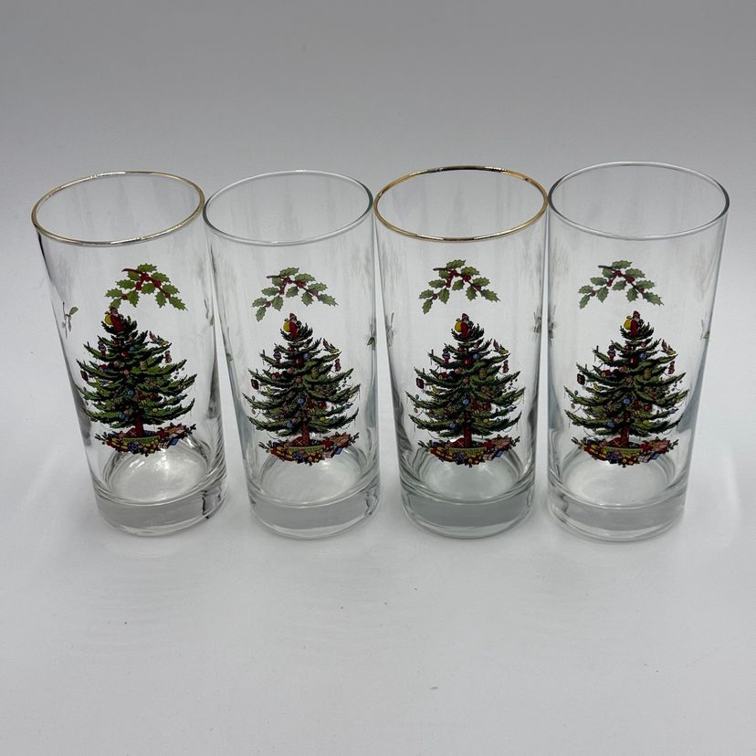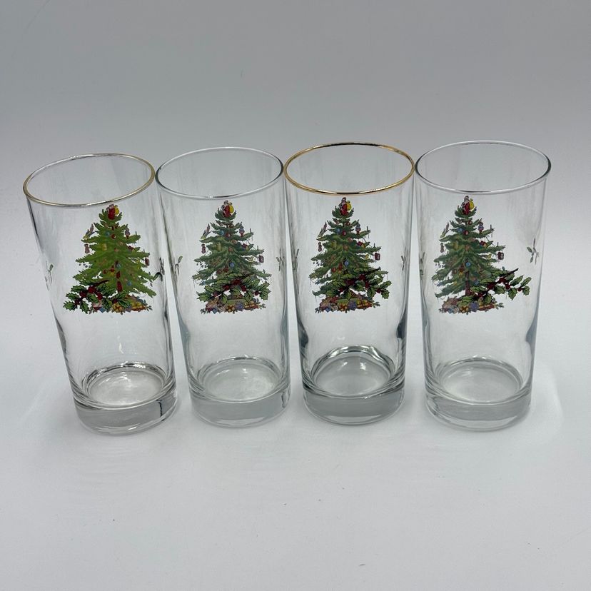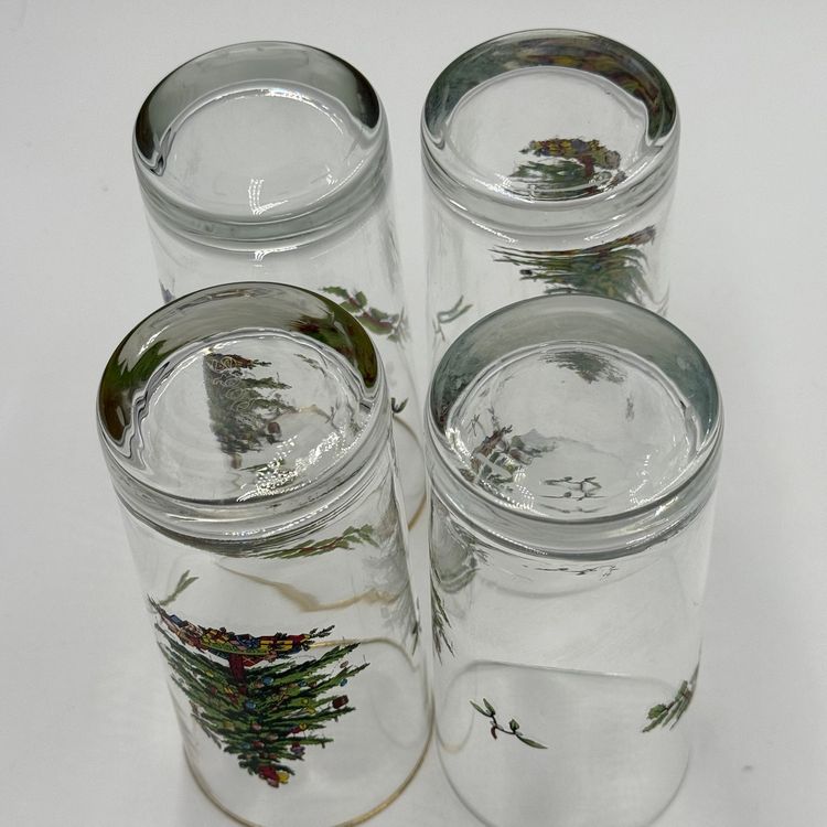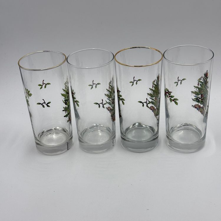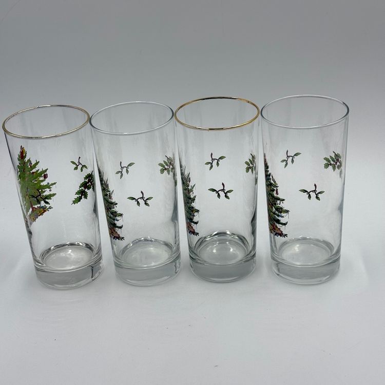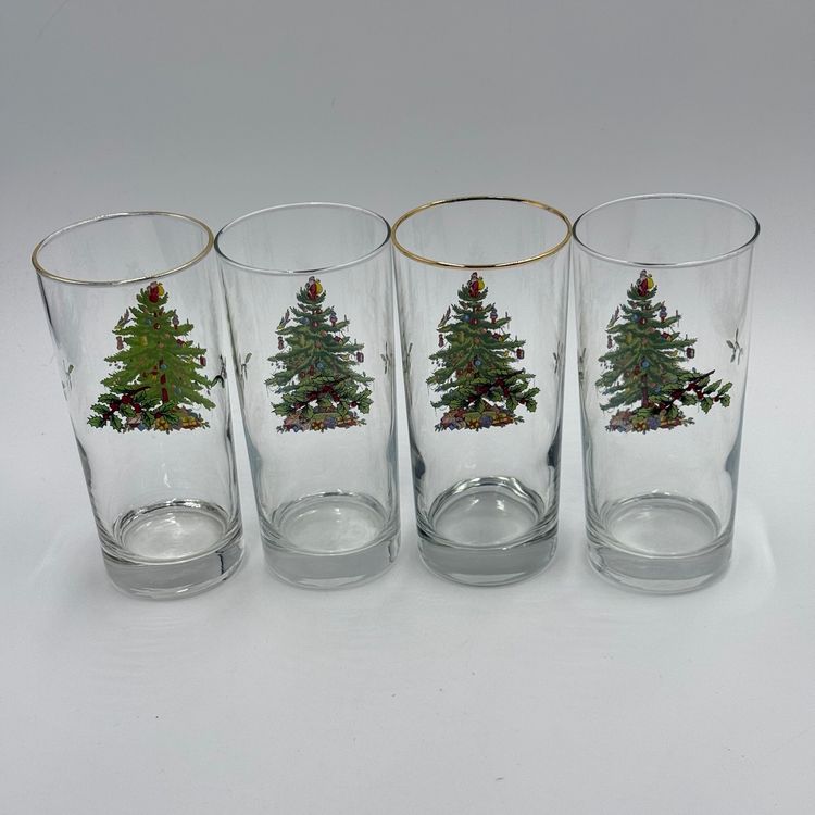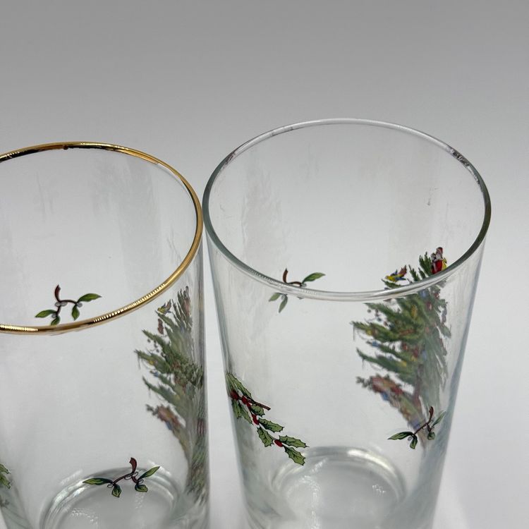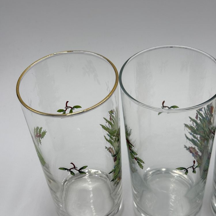 In good condition. Does not have any chips or cracks. Two of the glasses do not have the gold rim and they have slight water staining on the inside. Measures 6 1/4 inches tall and 2 7/8 inches in diameter. Has the original box.