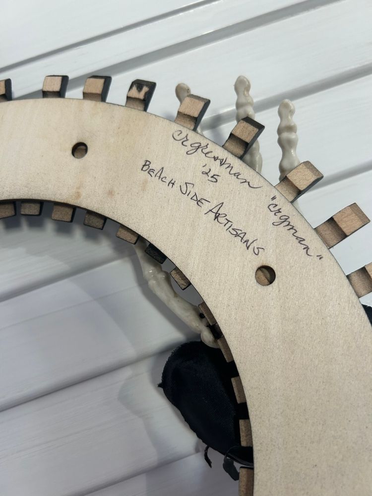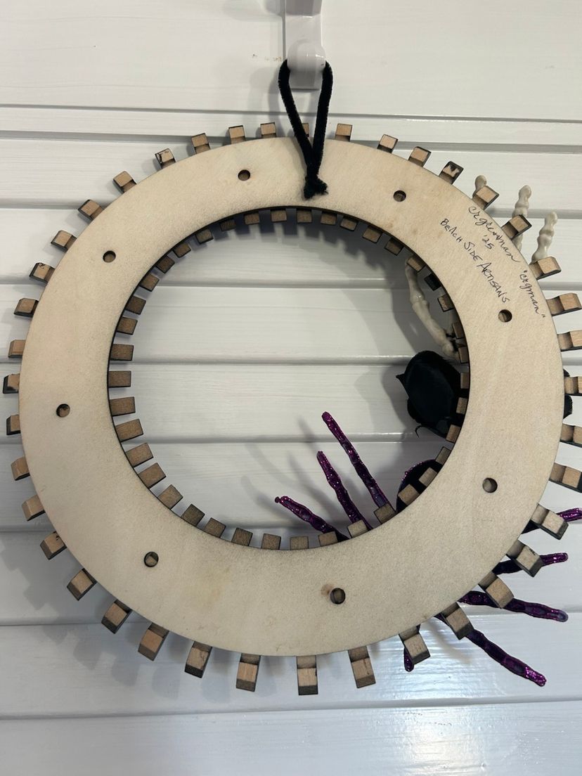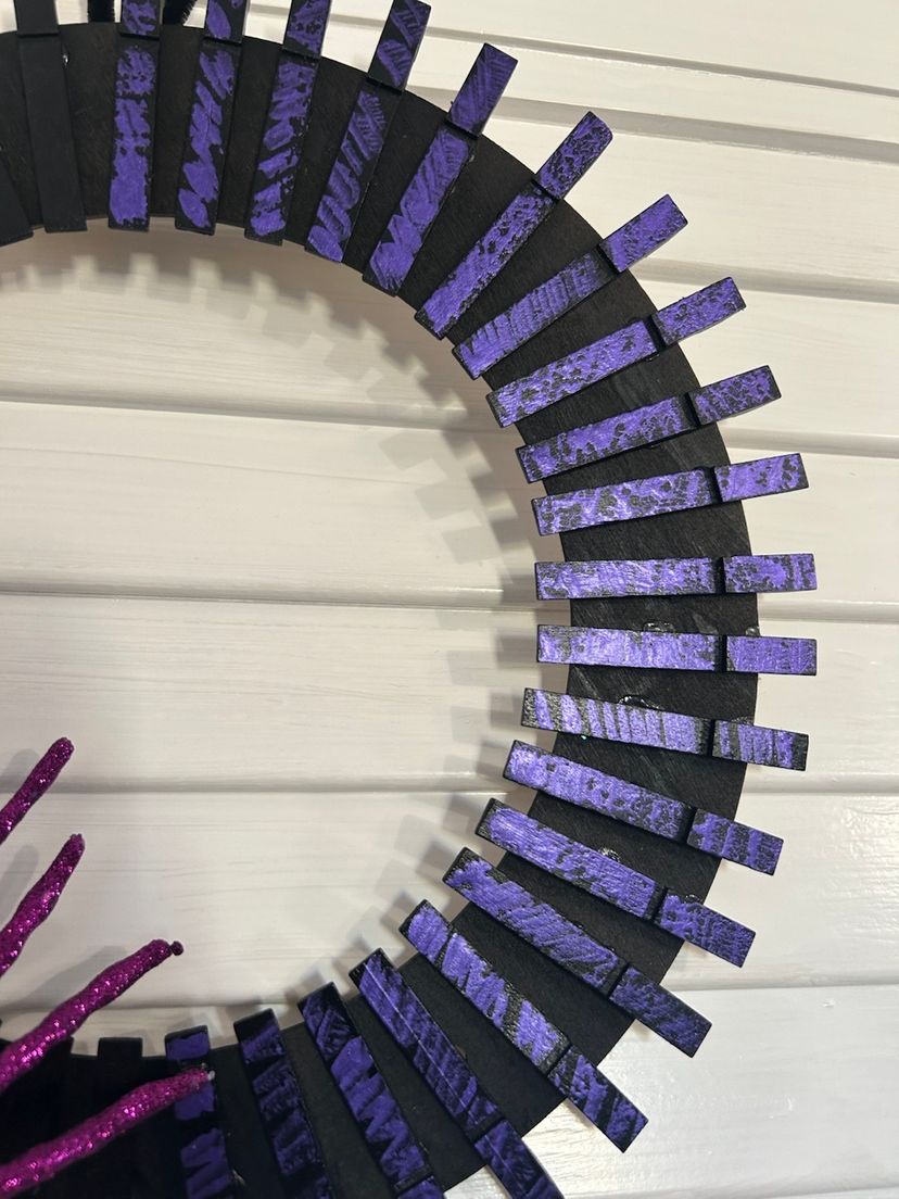 Repurposed clothes pins that I found thrifting. Took them apart, painted them and added to a wooden ring. Added a few spooky things and here you go! One of a kind wreath