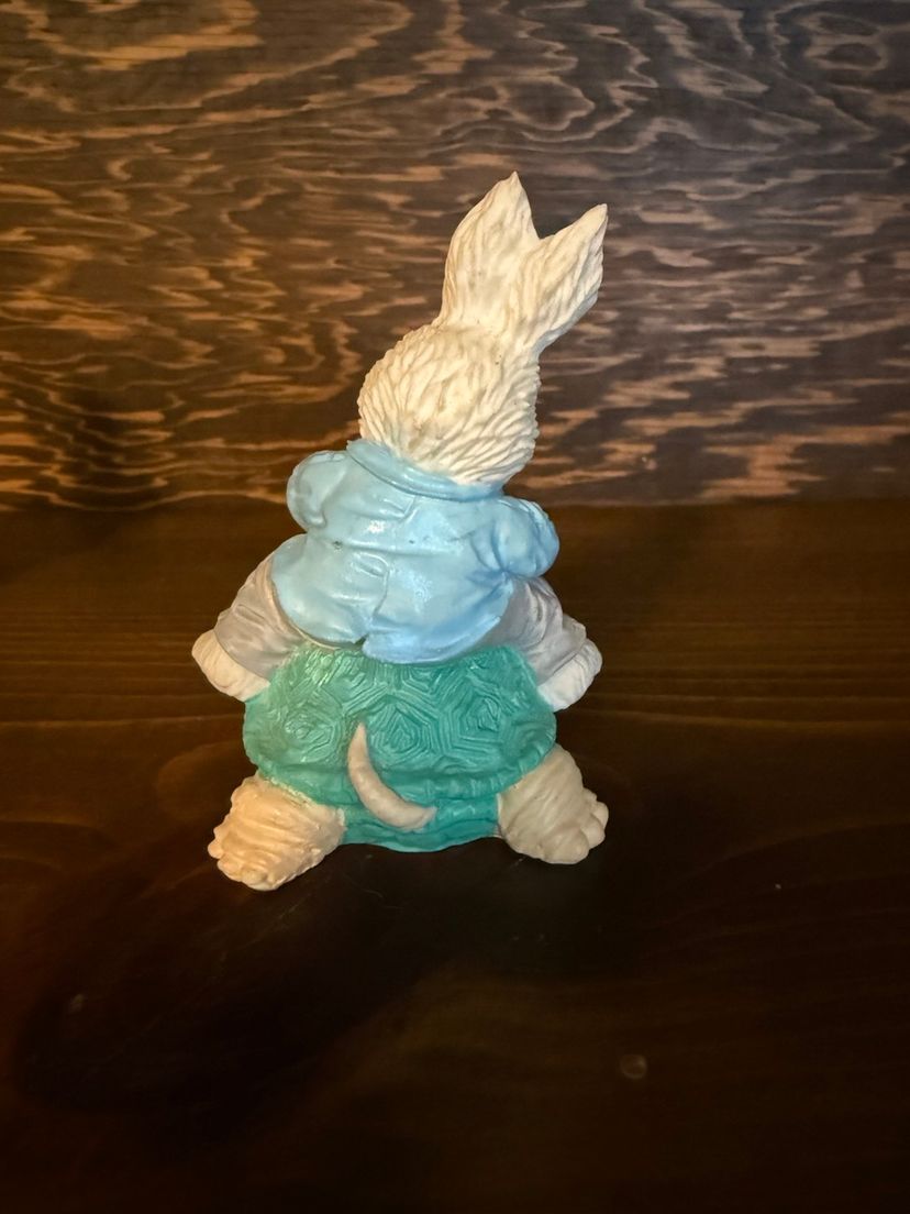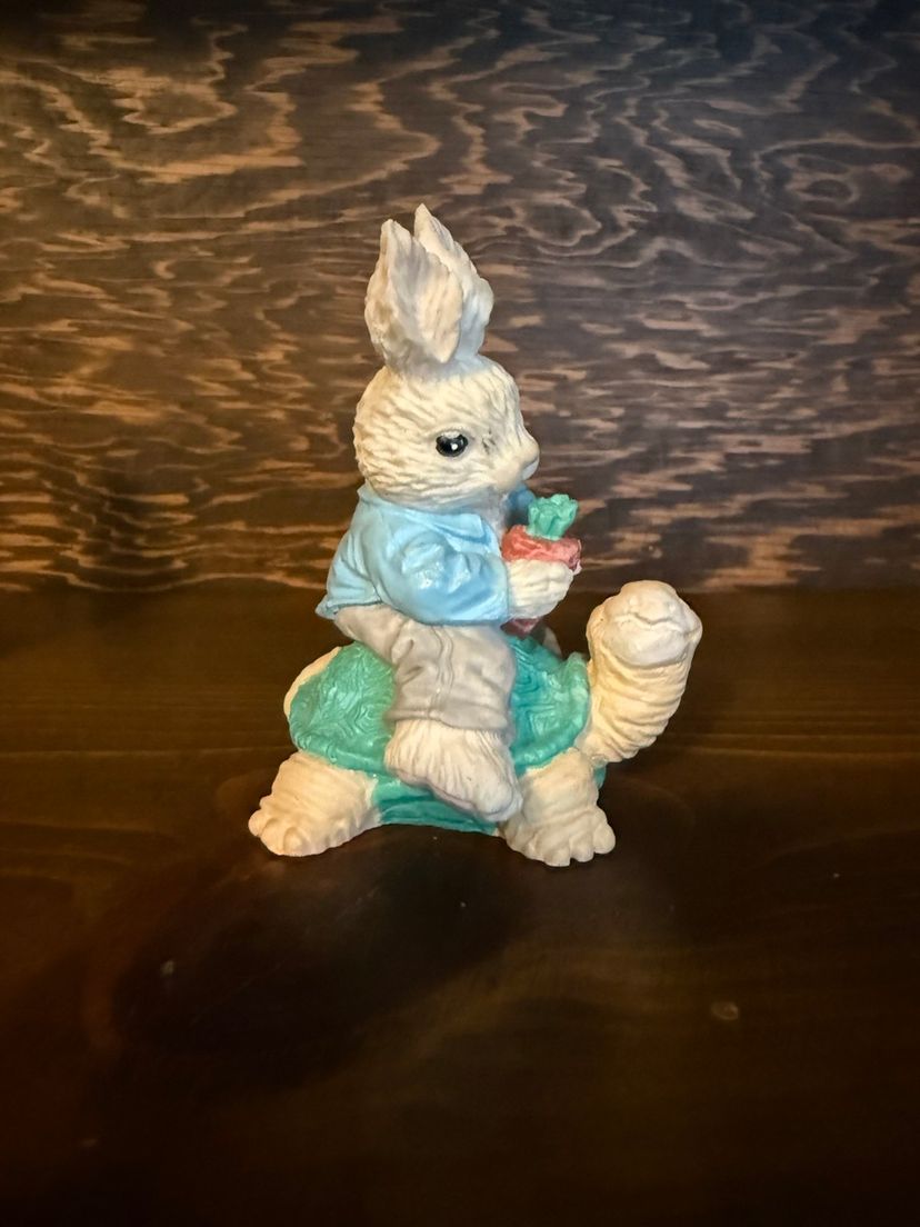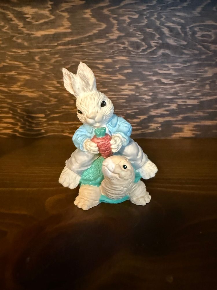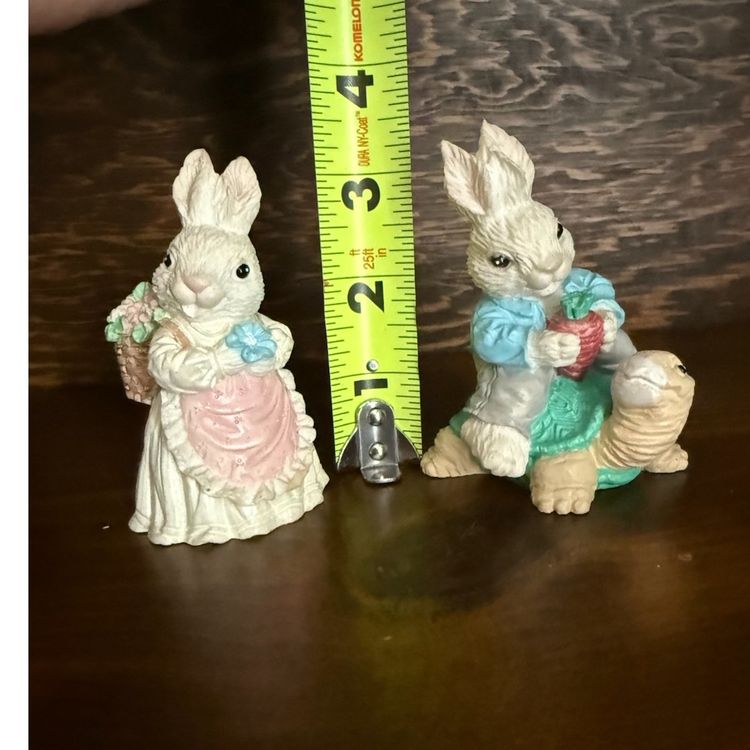 Cute bunny pair for spring/Easter! One bunny wears an apron and carries a basket of flowers. The other rides a friendly turtle carrying a carrot. Beautiful pastel coloring! No chips, cracks or paint wear. Both are a little over 3 inches high.