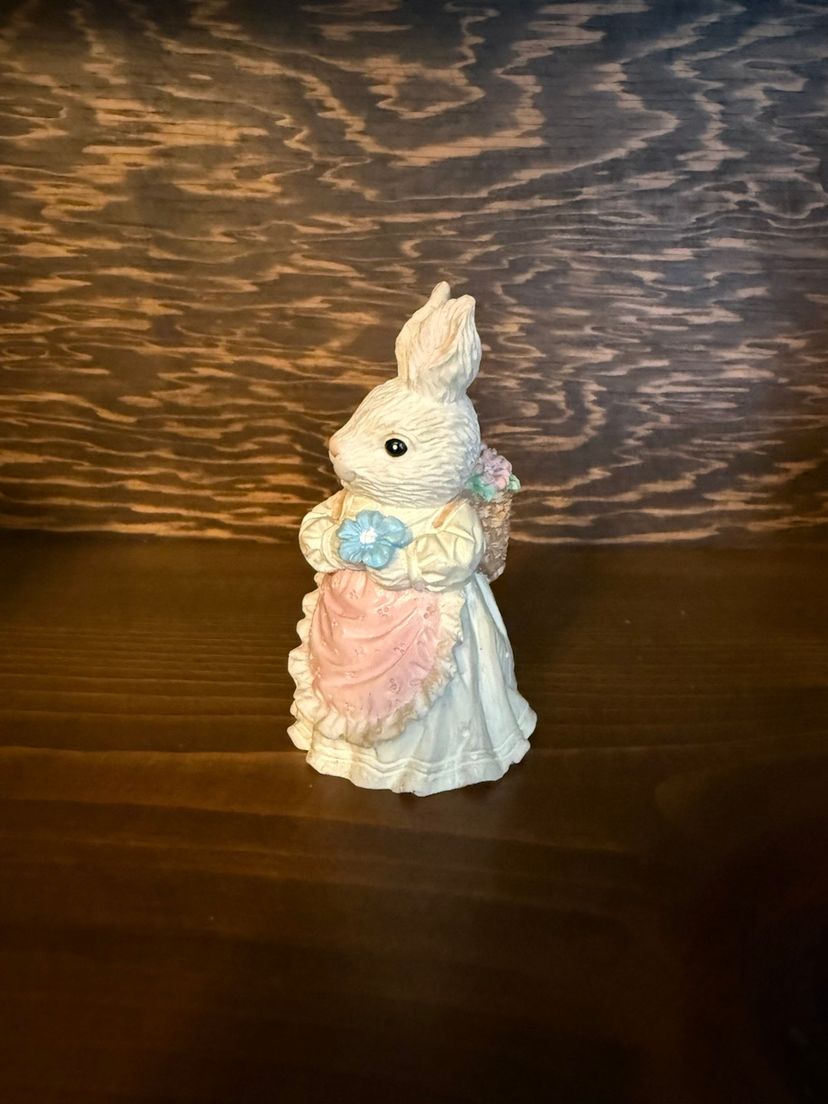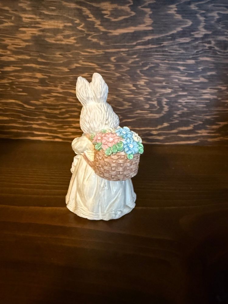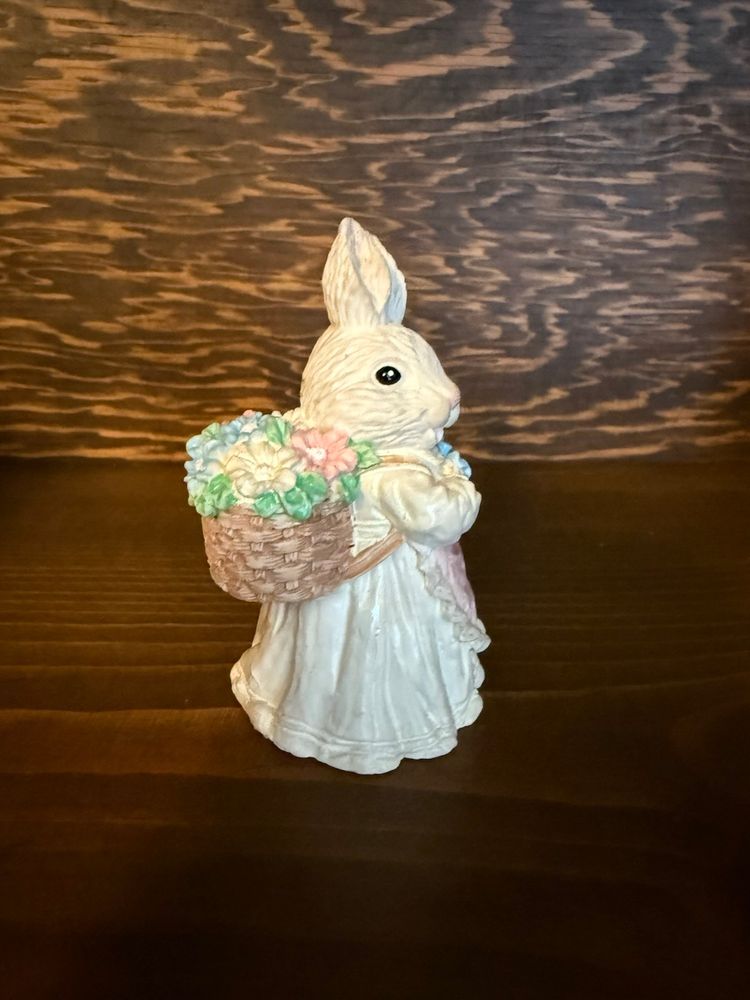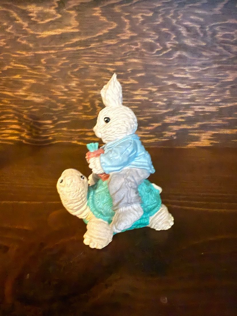 Cute bunny pair for spring/Easter! One bunny wears an apron and carries a basket of flowers. The other rides a friendly turtle carrying a carrot. Beautiful pastel coloring! No chips, cracks or paint wear. Both are a little over 3 inches high.