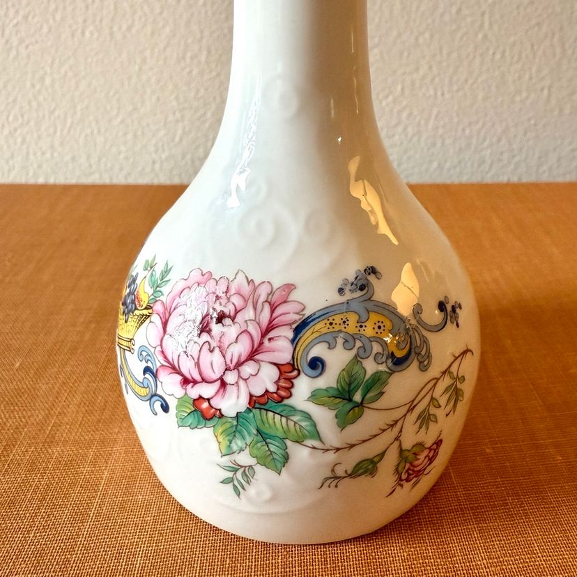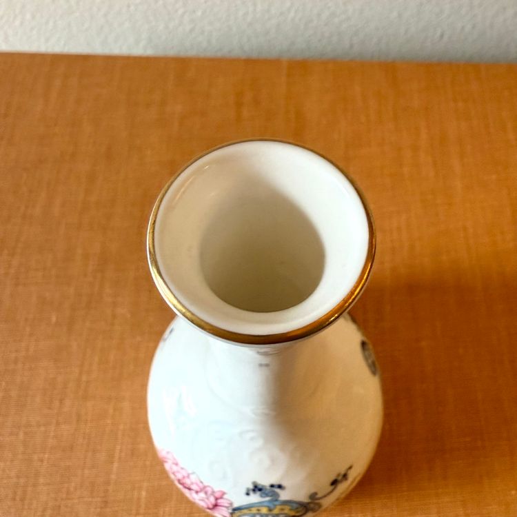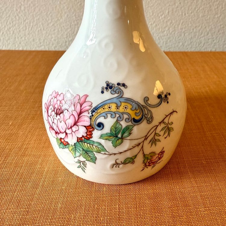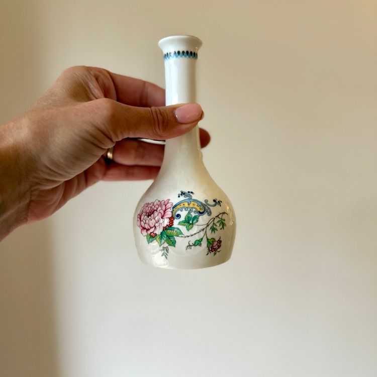 Isn't this little vase just a darling? It’s a genuine piece of vintage fine bone china from Staffordshire, England, in the beloved Chelsea Manor pattern. It has a beautiful, delicate presence that’s just perfect for that single special bloom or a tiny bouquet of garden clippings. This isn’t just a vase; it’s a little slice of English history for your shelf!