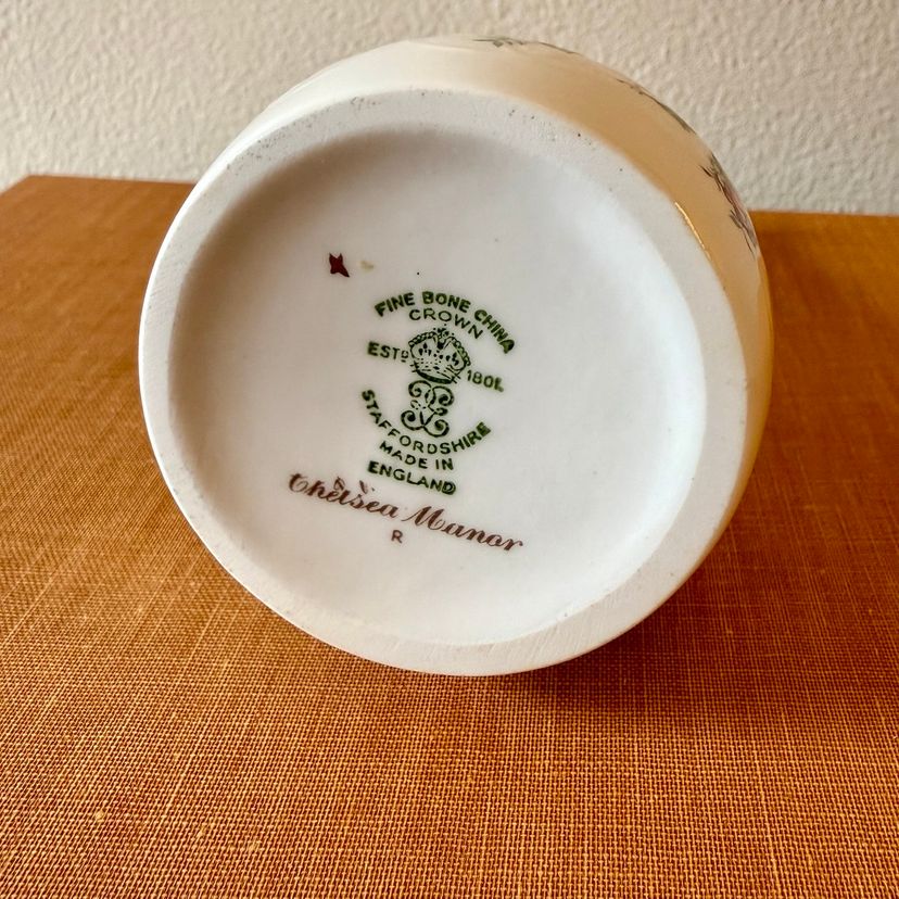 The Maker: The base proudly shows the mark for Crown Staffordshire (Est. 1801), one of England's most famous potteries. It’s marked "Fine Bone China, Made in England" and "Chelsea Manor."