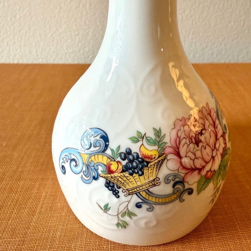 The Look: It features a vibrant, classic pattern of a basket overflowing with fruit (grapes, pears, apples) next to a lush, colorful peony or rose. All of this artistry is set on a bright white vase with a subtle, all-over embossed texture.