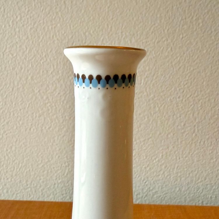 The Details: Look closely at the neck! It's crowned with a lovely gold rim, and right beneath it is a delicate band of hand-painted blue and brown dots. These small details really show the quality of the china.