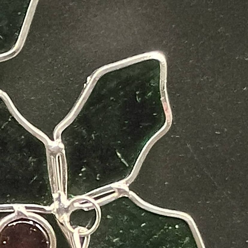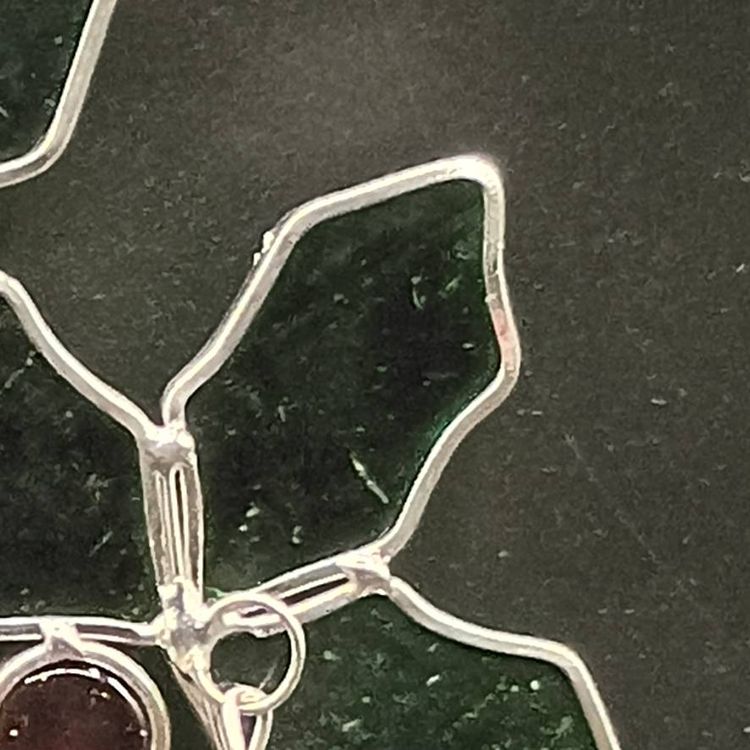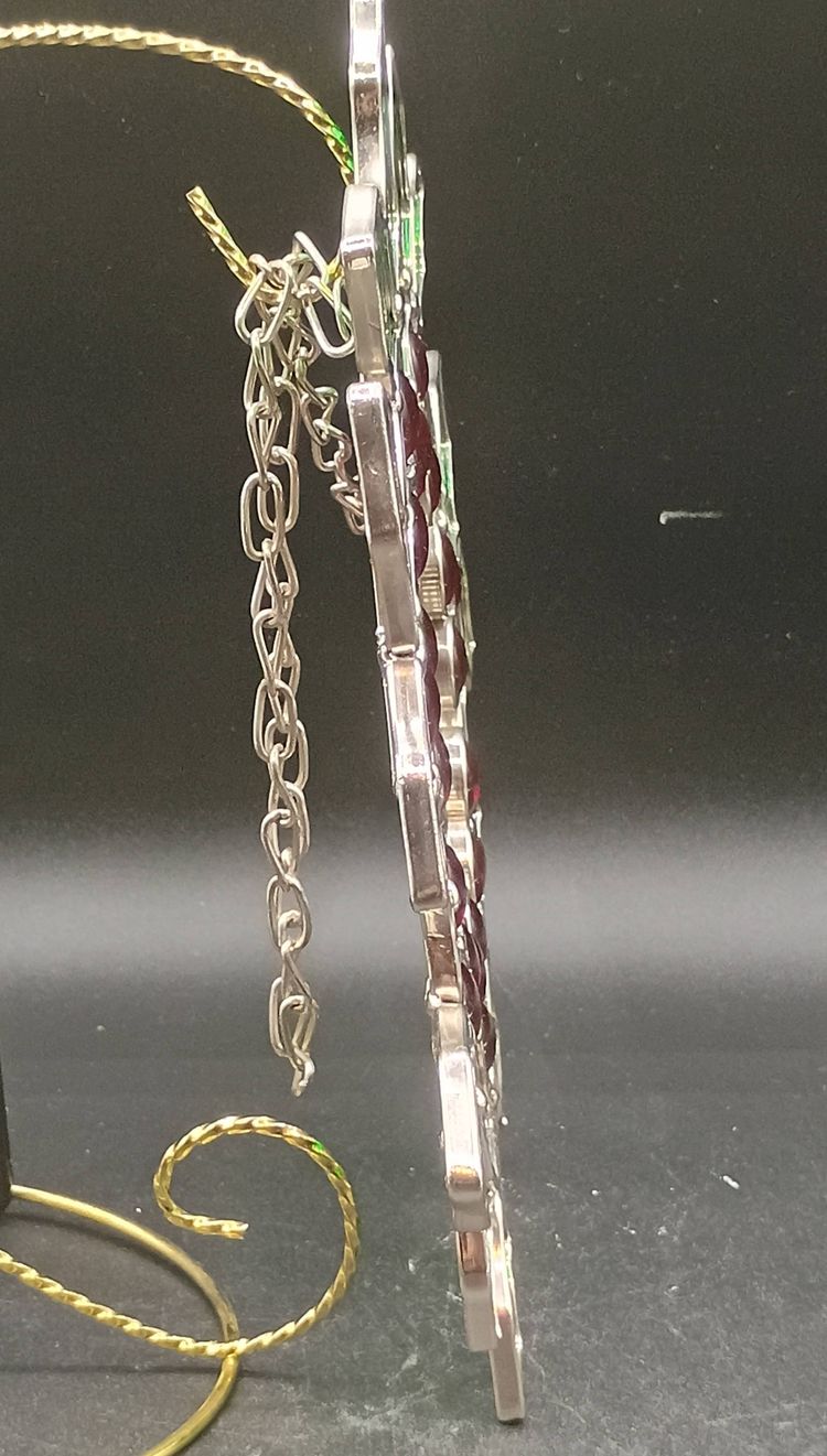 This Stained Glass Holly and Berries Christmas Wreath with Chain is a beautiful and festive decoration for the holiday season. Measuring 10 inches in diameter, this medium-sized wreath features a multicolor design with a pattern of leaves. Made of glass with a vintage production style, this hanging decoration from the ornaments collection adds a touch of Christmas spirit to any space.
