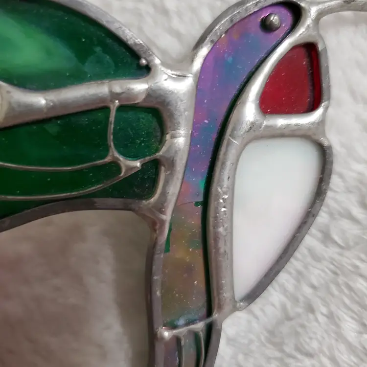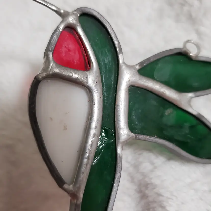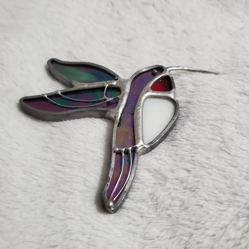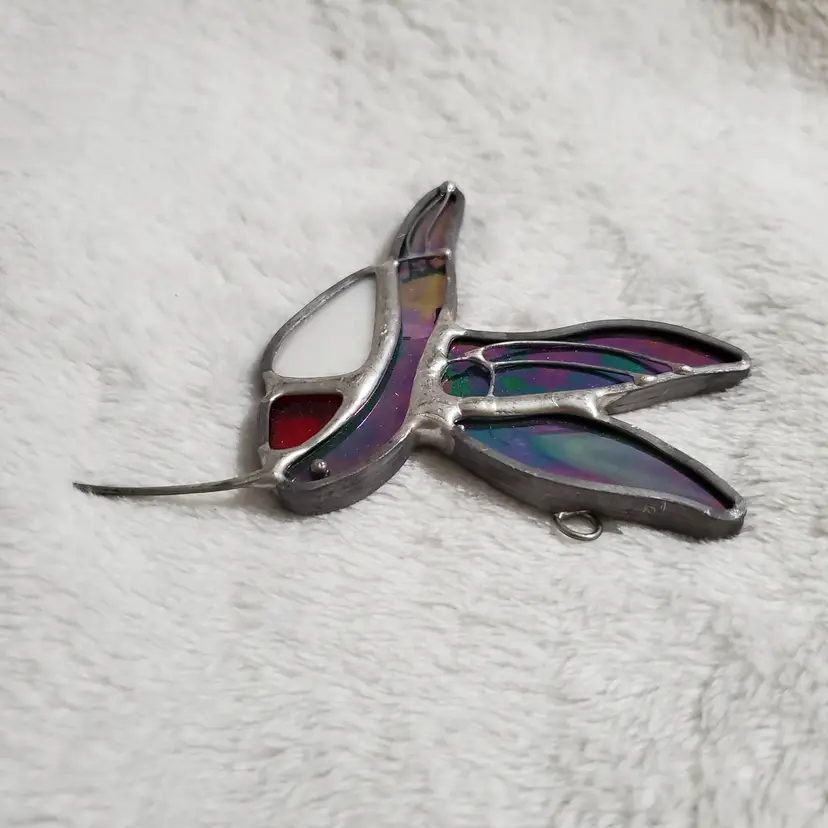This adorable stained glass hummingbird suncatcher features white, red, and purpley-green hues.