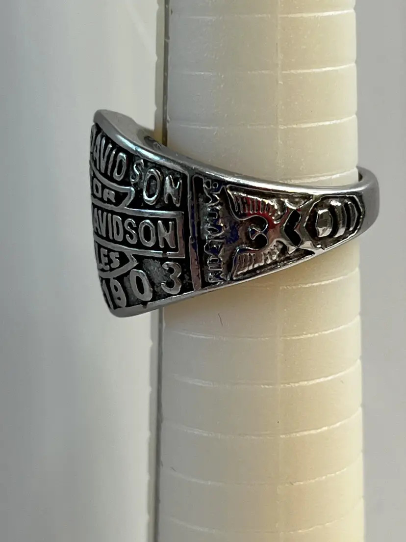 This Harley Davidson Ring is marked Harley Davidson Motor Harley Davidson Cycles. Since 1903 all on face of ring. On side inscriptions read Live to Ride, Ride to Live. Also one side has a skull the other side has an eagle.