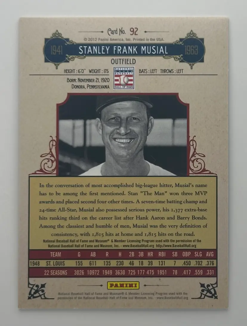 Celebrate the legendary Stan Musial with this Cooperstown induction card, capturing his iconic career and timeless legacy.