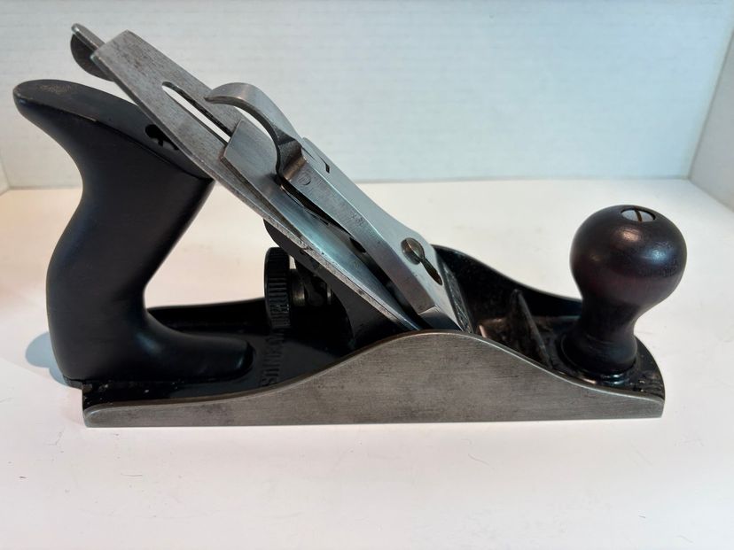 Stanley Bailey No 4 smoothing plane. WWII era type 17. Very clean, sharp and tuned. Bottom flattened. Lever cap is shiny. This plane is ready to make shavings. Tote is beech, knob is hardwood. Varnish on them was shot so I redid them a deep red. The depth adjuster is gutta percha (hard rubber) and is in excellent shape. It does not have the frog adjustment screw - which is common for the war production planes.