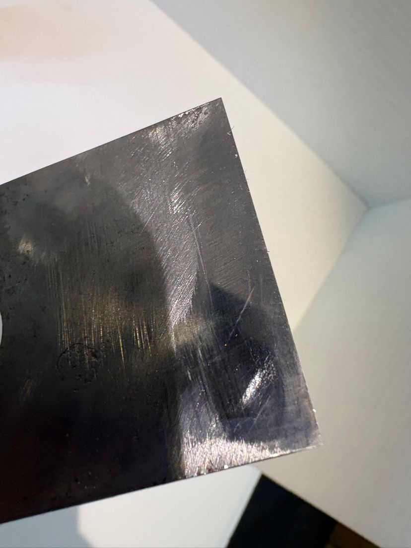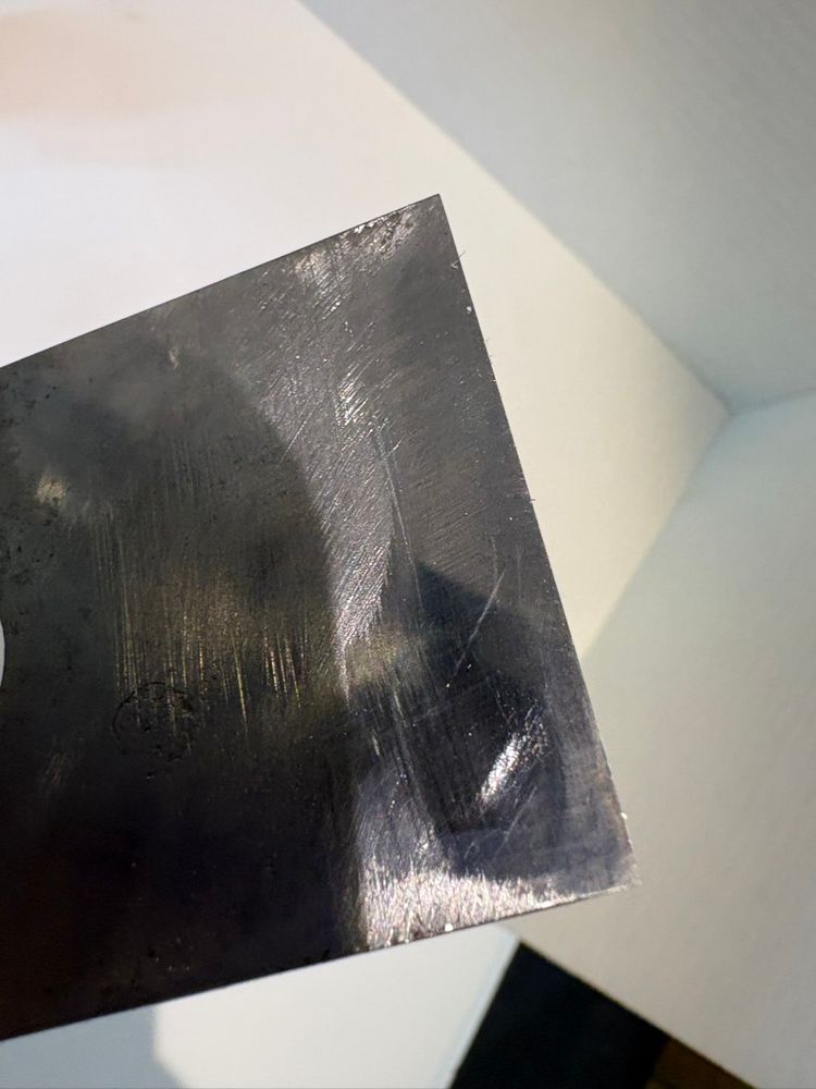 See the pictures. Japanning is very good. There is tiny chip on the trailing edge of the mouth but it will have no functional impact. Tote had a mid body break that I repaired. It's solid and with the re-finished you can't even see it.