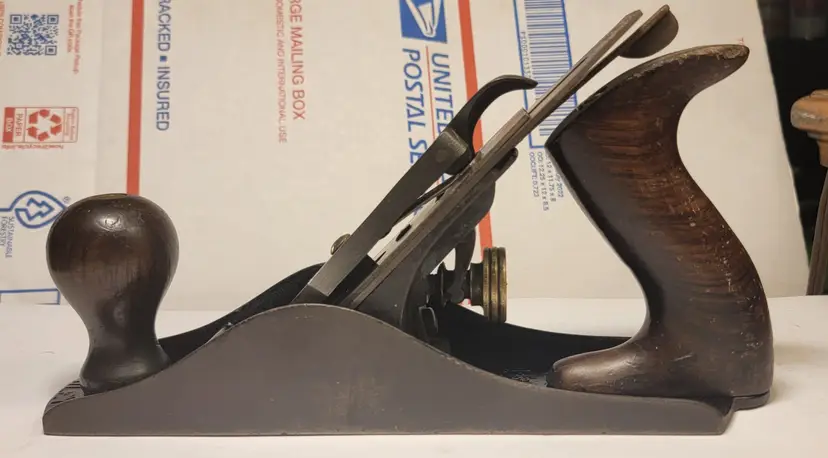 Up for sale is a nice Stanley #4 type 11 hand plane. This one has the smooth sole. I have re-Japanned the plane using Stanley's factory recipe and baked it on low heat 5 times to set the Japanning. I have also sharpened the iron going through the grits up to 8000. I have lap the sole and it is flat. The rosewood tote and knob are crack free and show their original patina. The plane does have the BB logo replacment iron. It also has a nice Shelton lever cap that fit perfectly.