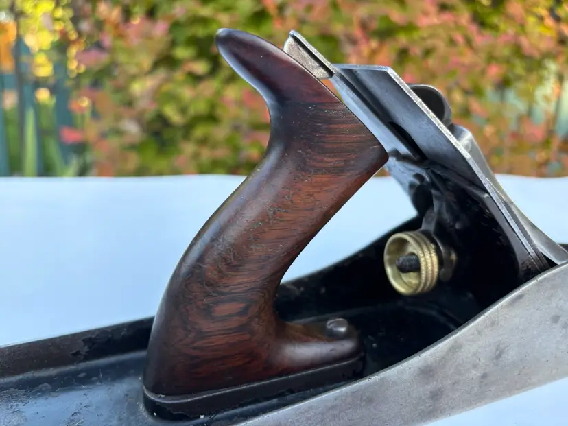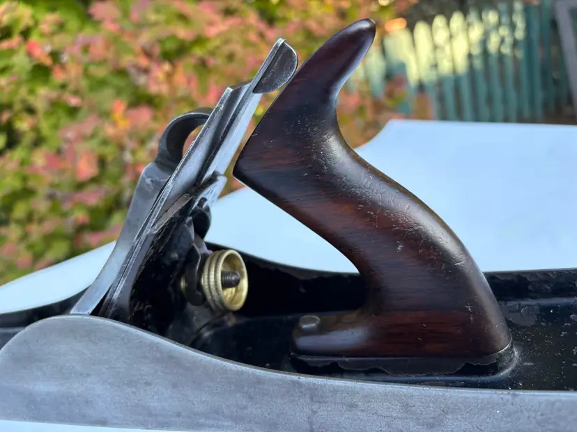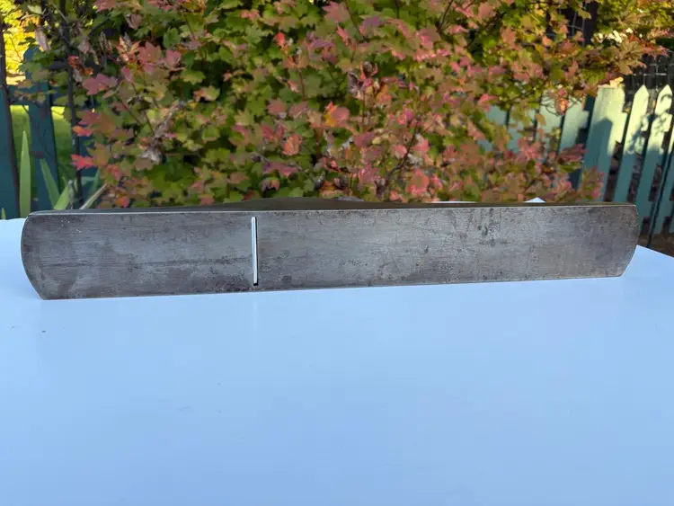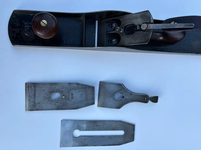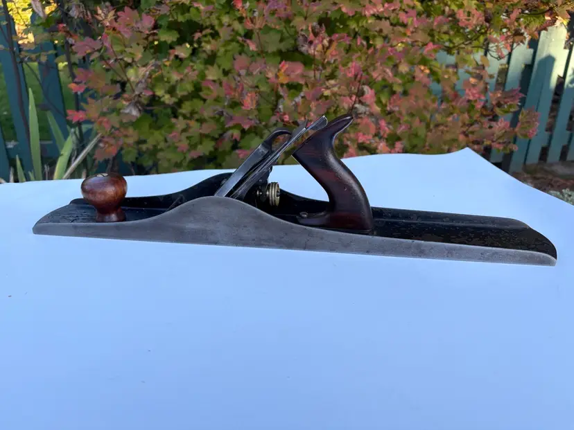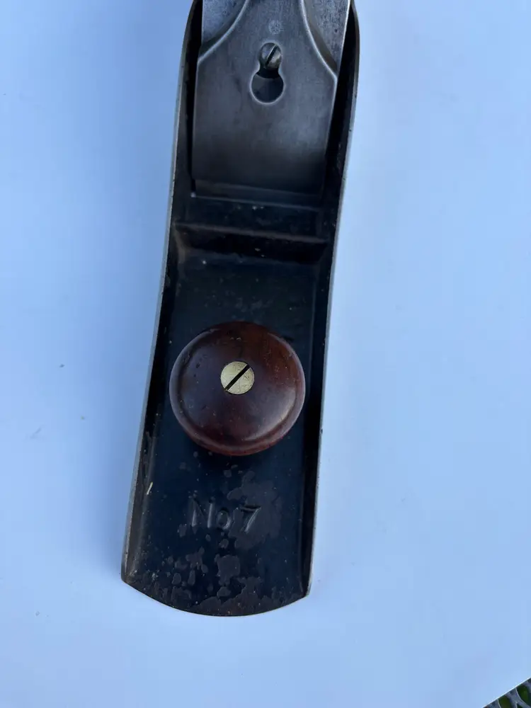 Stanley #7 jointer plane. 1899-1902 - a type 8. 21 inches long with a 2 3/8" wide iron. Has a SW iron. Clean and sharp. Knob and tote look great - the horn repair blends well. This one tested out fine so I left the bottom as is.