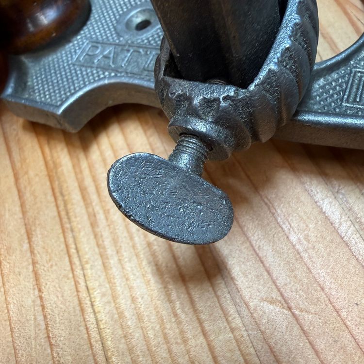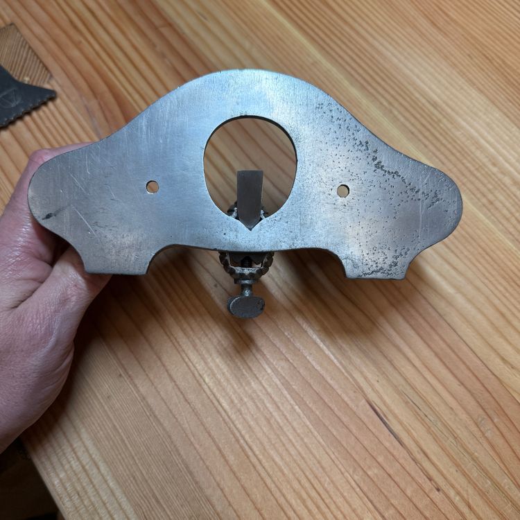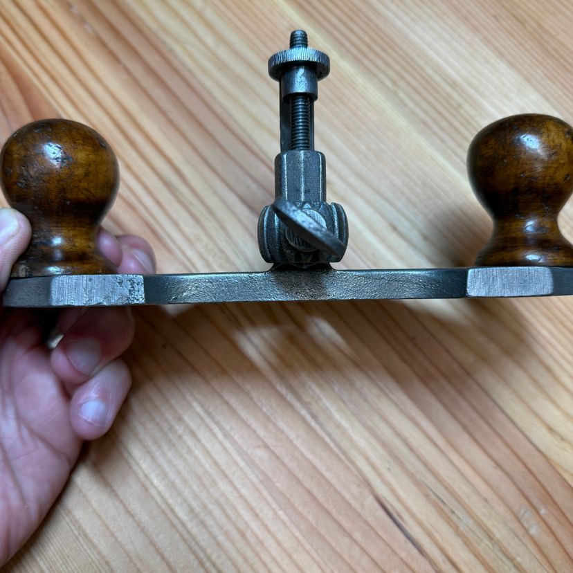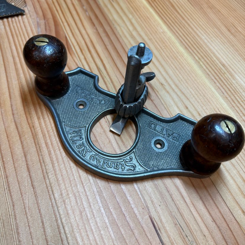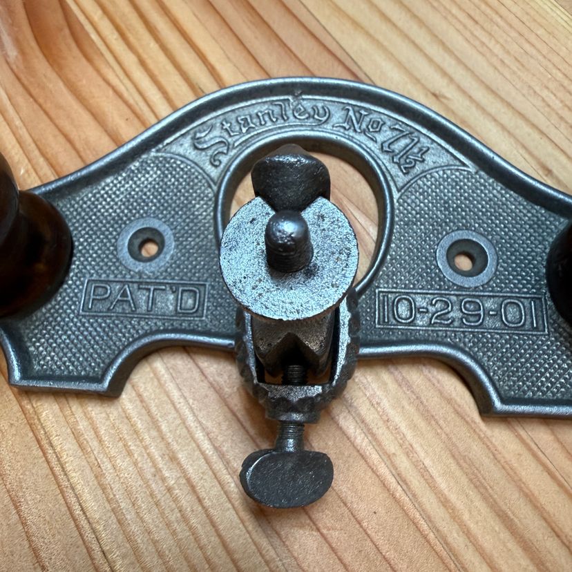 Well-loved, workhorse router plane. Nickel plating is missing on most of the base. Some pitting on thumbscrew, adjustment wheel, and base. See photos. #T1016