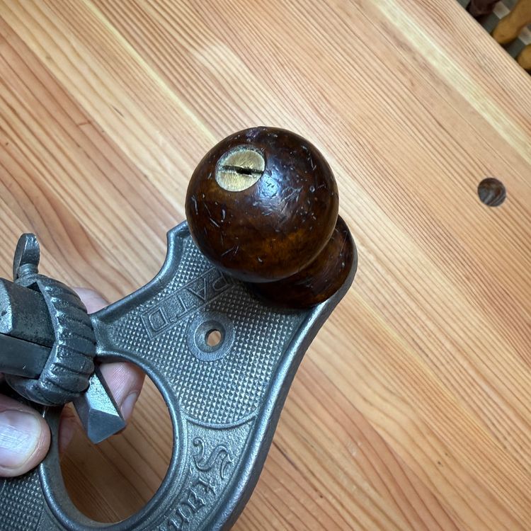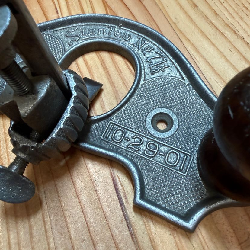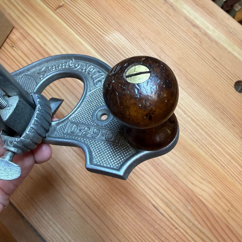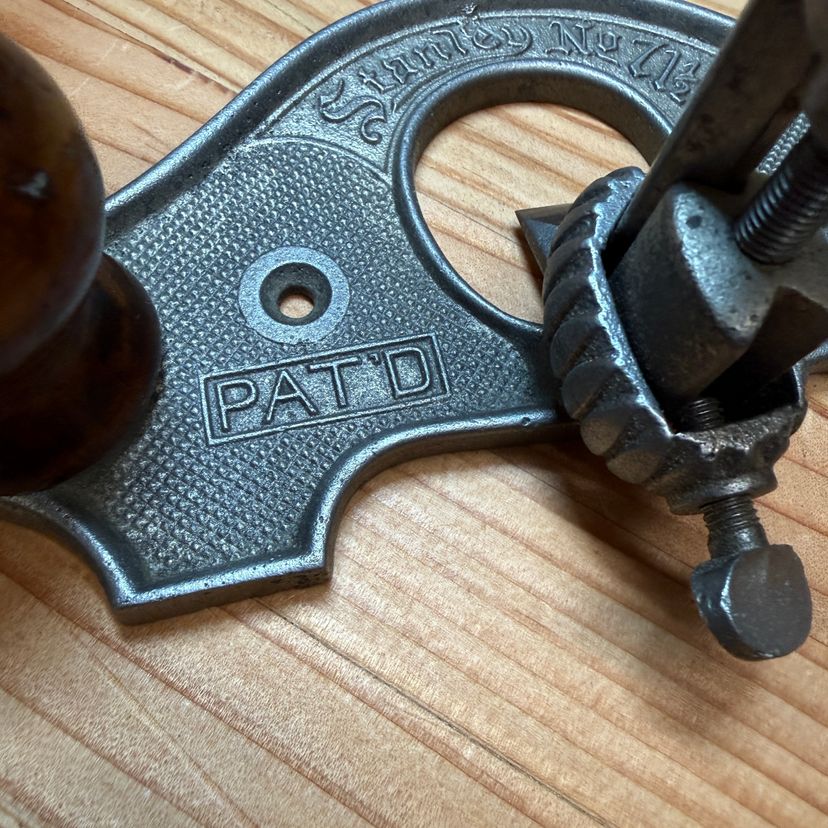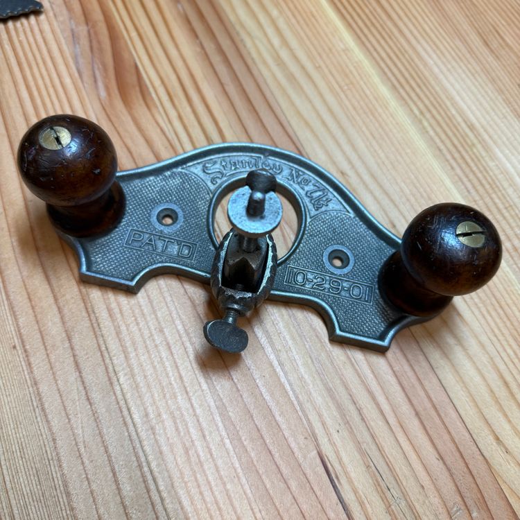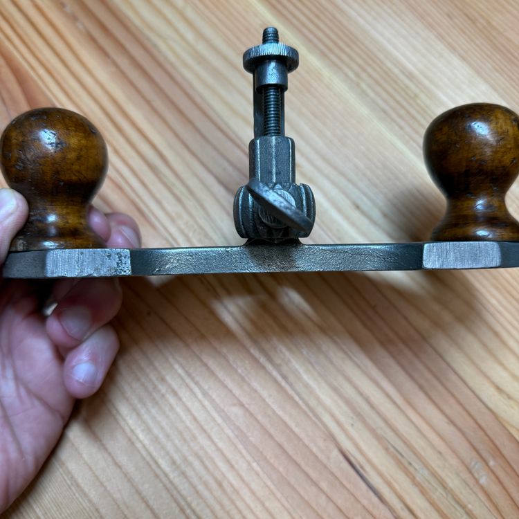 Well-loved, workhorse router plane. Nickel plating is missing on most of the base. Some pitting on thumbscrew, adjustment wheel, and base. See photos. #T1016