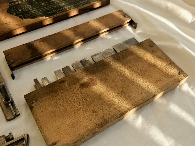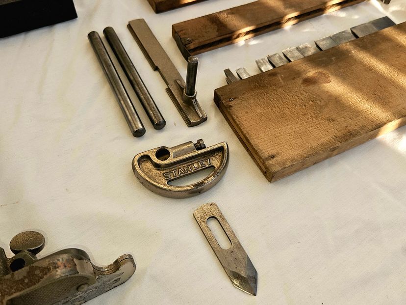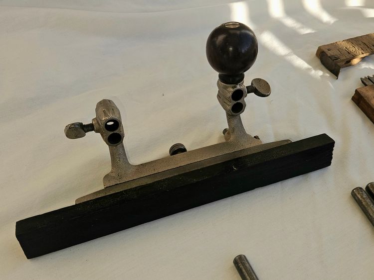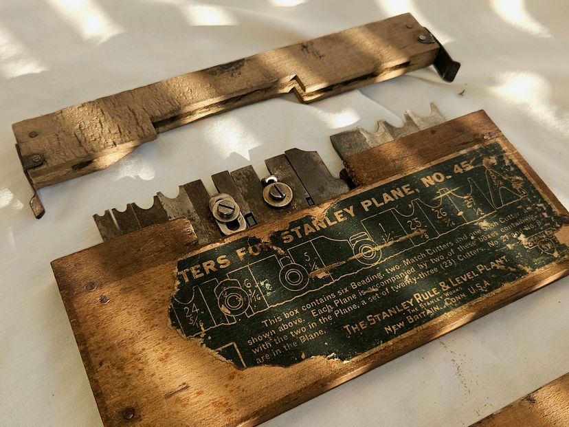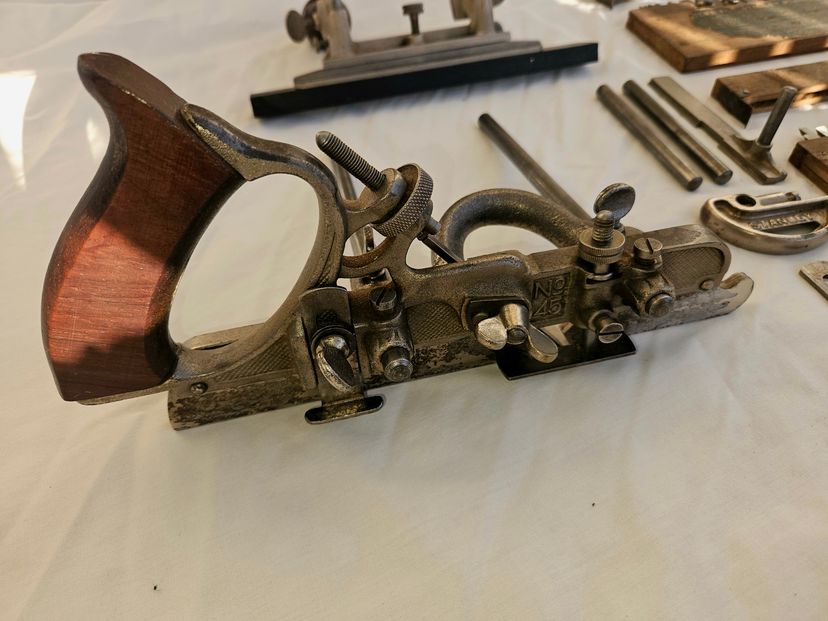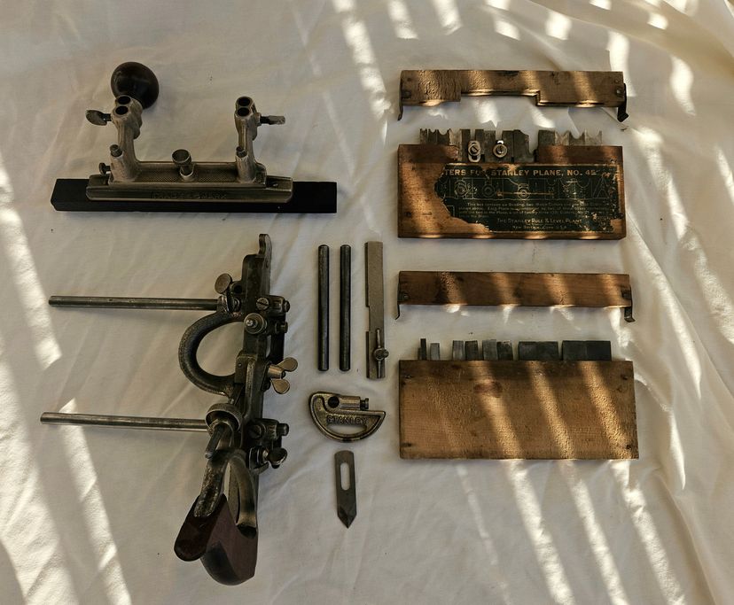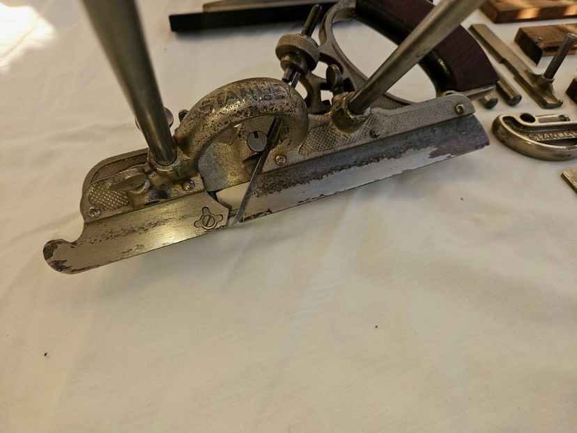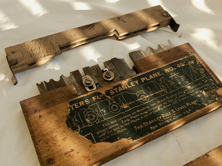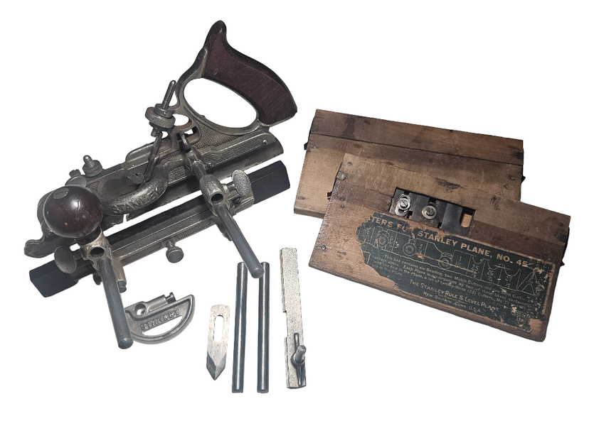 SW era combination plane with 2 boxes of cutters. Includes - Long and short rods. All 3 stops. Cam rest. The elusive slitting cutter.