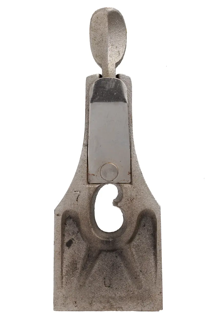 A solid 2" wide replacement lever cap for Stanley's No. 4, 4C, 5, & 5C metallic bench planes. It has some wear in the original nickel plating, as well as some surface scuffs. It was salvaged from a type 19 plane and has a "U" cast in the recess. It will also work fine with types 16-18 as the specs are the same - only the markings (and, in some cases the finish) would be different.