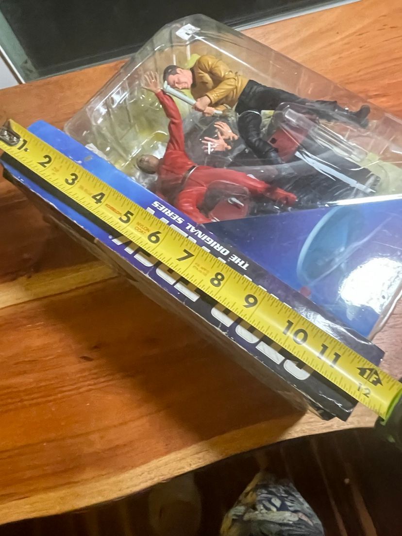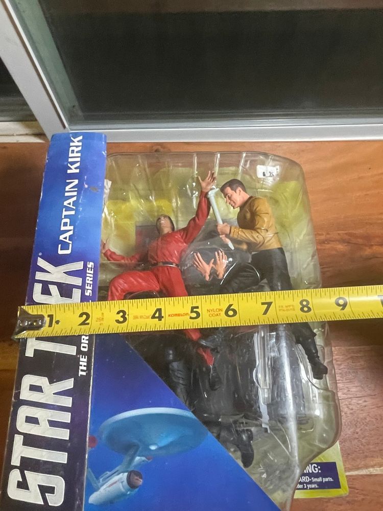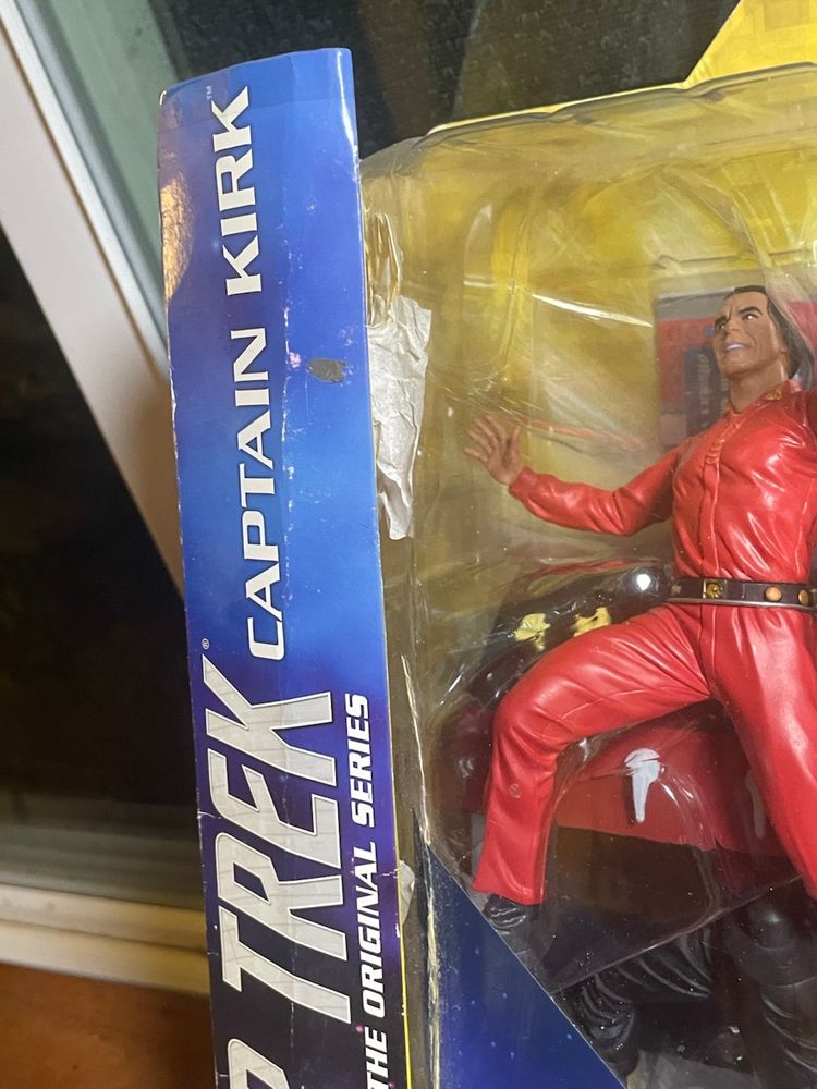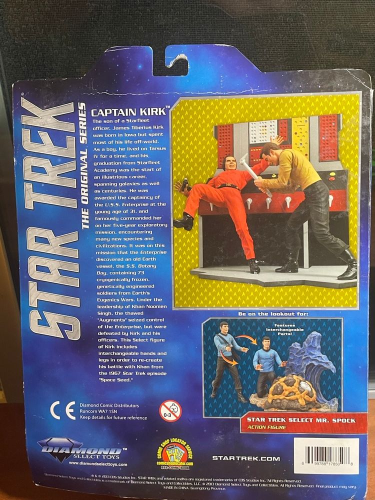 The product is the Star Trek Select Captain Kirk action figure. It is part of a series of figures from Diamond Select Toys. New old stock