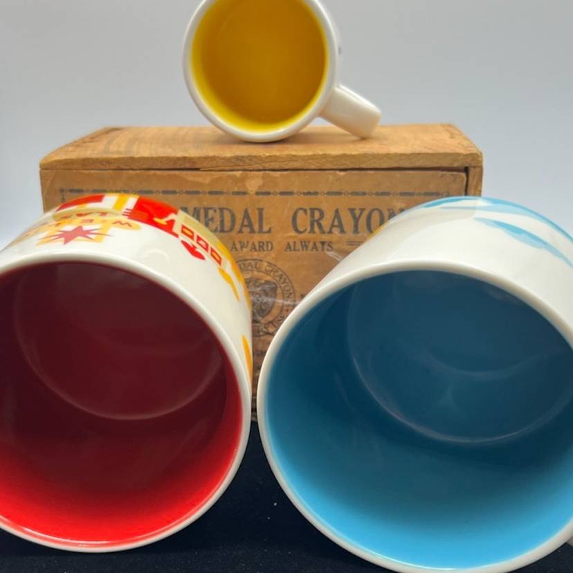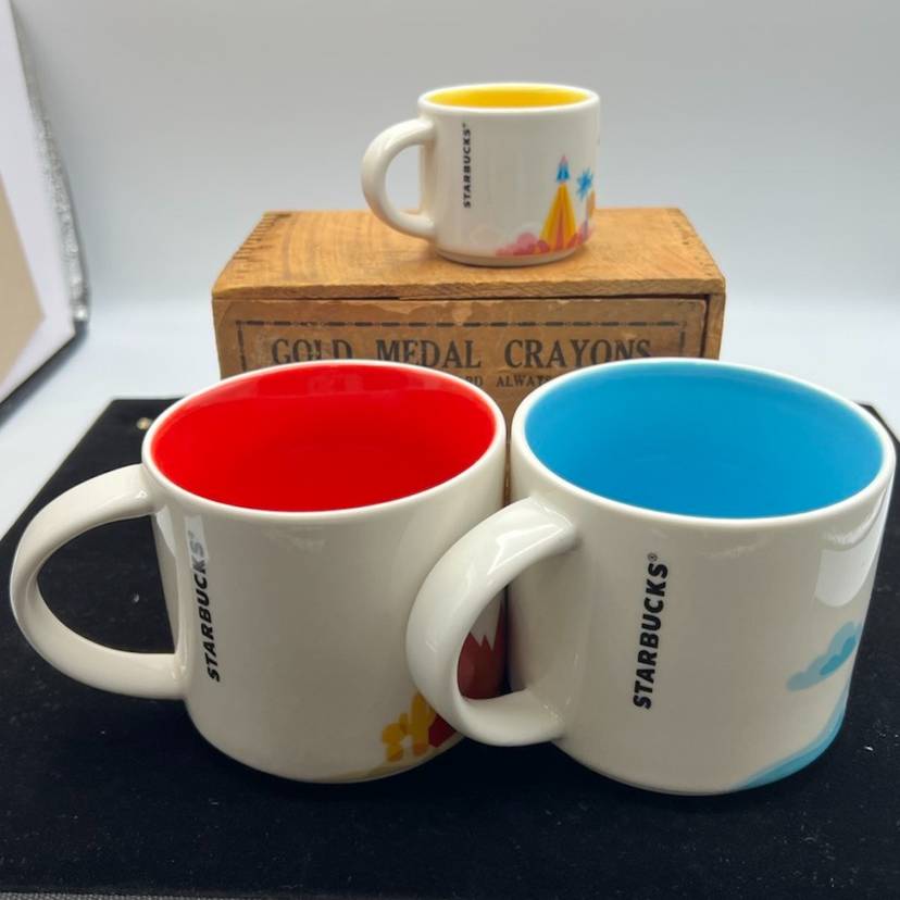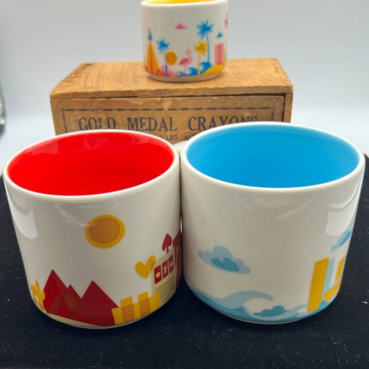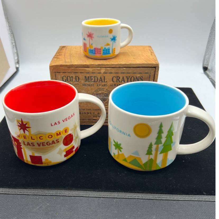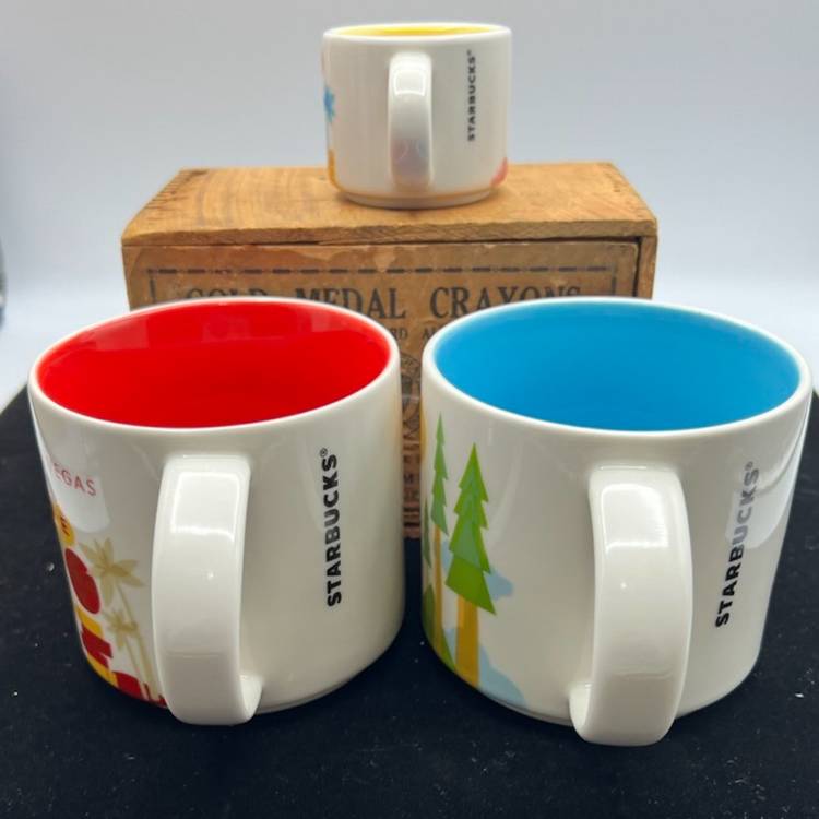 THERE ARE 3 STARBUCKS MUGS IN THIS GROUP: LAS VEGAS IS PART OF THE YOU ARE HERE COLLECTION, DATED 2015 WITH THE FANTASTIC RED COLOR INSIDE IT JUST MAKES YOU WANT TO SALSA BUT DON’T SPILL YOUR COFFEE. CALIFORNIA IS ALSO PART OF THE YOU ARE HERE COLLECTION DATED 2014 IT HAS A BRIGHT AQUA INSIDE AND IS BEAUTIFUL WOULD HAVE TO MAKE YOU HAPPY SEEING THE BEAUTIFUL COLOR COME TO LIFE WITH COFFEE OR TEA. THEN WE HAVE THE LITTLE EXPRESSO CUP WITH IT BRIGHT YELLOW INSIDE IT IS ALSO PART OF THE YOU ARE HERE COLLECTION AND IS DATED 2017. THIS IS A VERY PRETTY COLOR PATTERN.