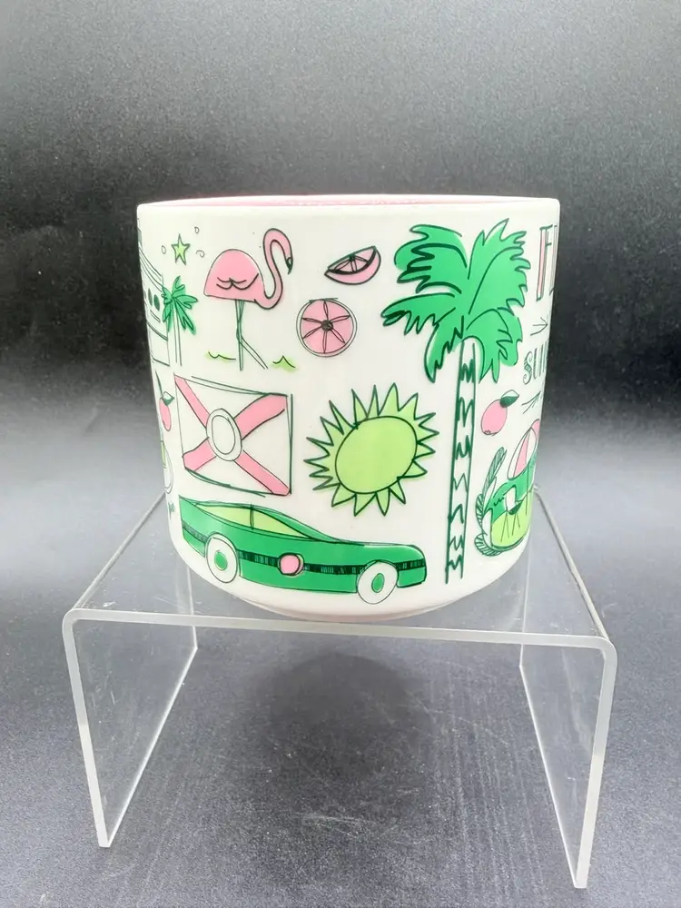 The Starbucks FLORIDA Been There Series coffee mug is a collectible advertising item featuring a pink color scheme. This original piece was created in 2021 and showcases a theme centered around coffee and tea. Made in China, this 14 oz mug is a unique addition to any Starbucks enthusiast's collection, representing the brand's global presence and cultural impact. Perfect for enjoying a beverage while appreciating the artistry and craftsmanship of Starbucks merchandise.