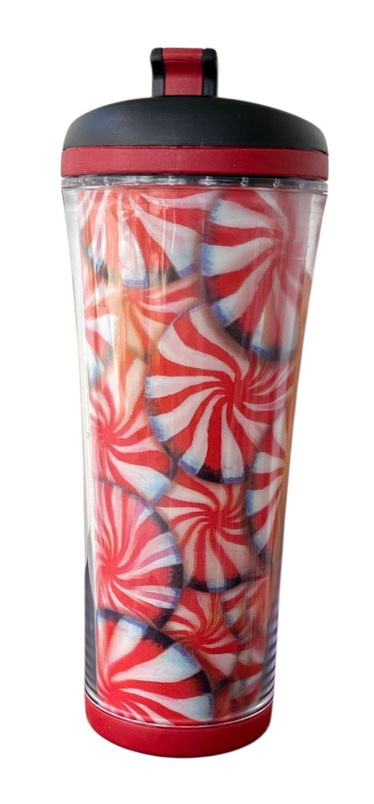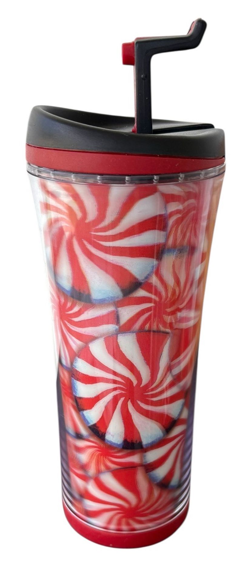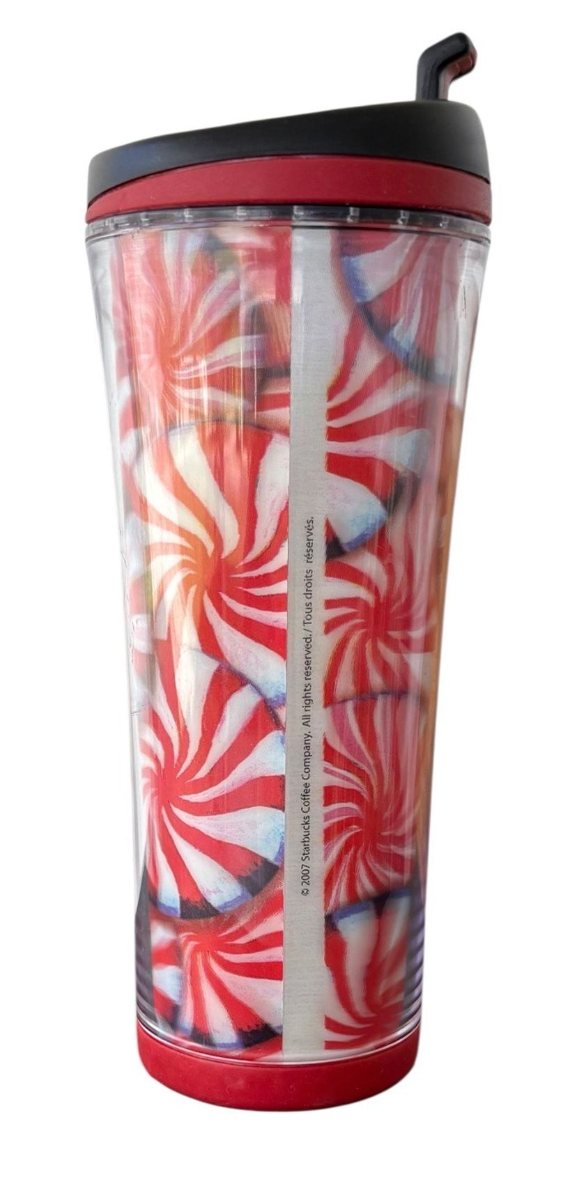 The product is a 2007 Starbucks Holiday Peppermint Candy 16oz holographic travel tumbler, featuring a festive red and white design. This original Starbucks collectible showcases the brand's iconic coffee and tea theme, making it a desirable item for coffee and tea enthusiasts and Starbucks collectors alike. Made in China, this tumbler is a unique and nostalgic piece of advertising memorabilia from Starbucks' holiday promotions.