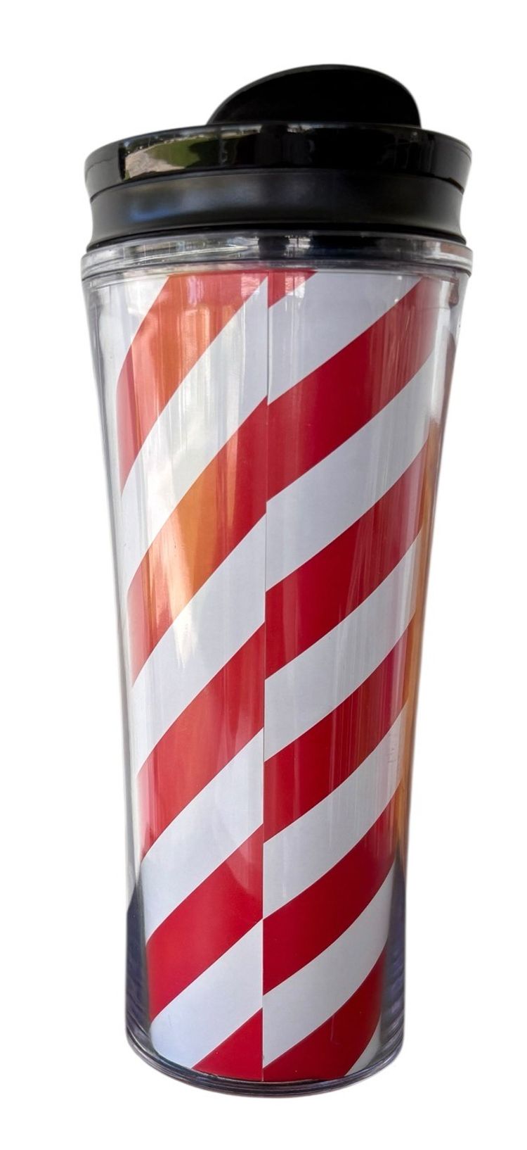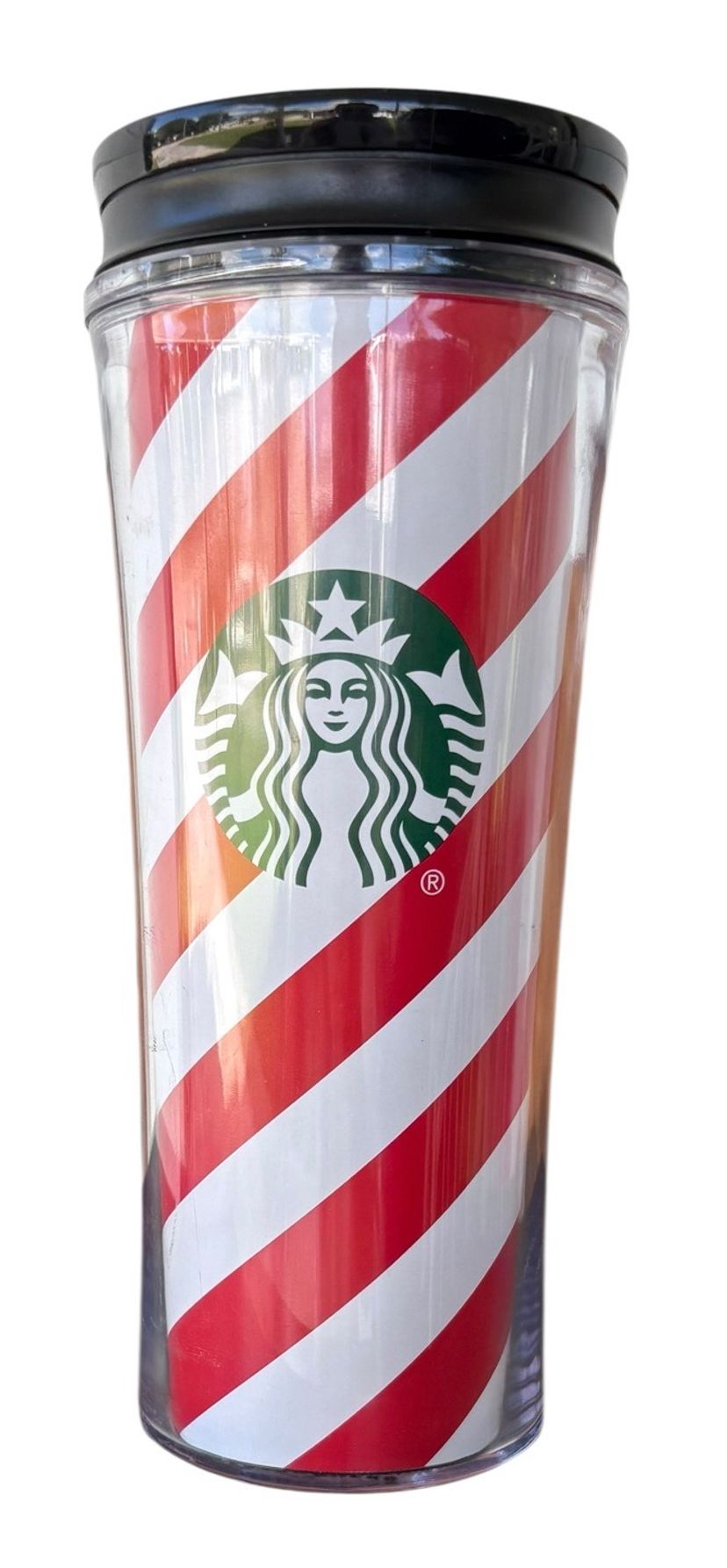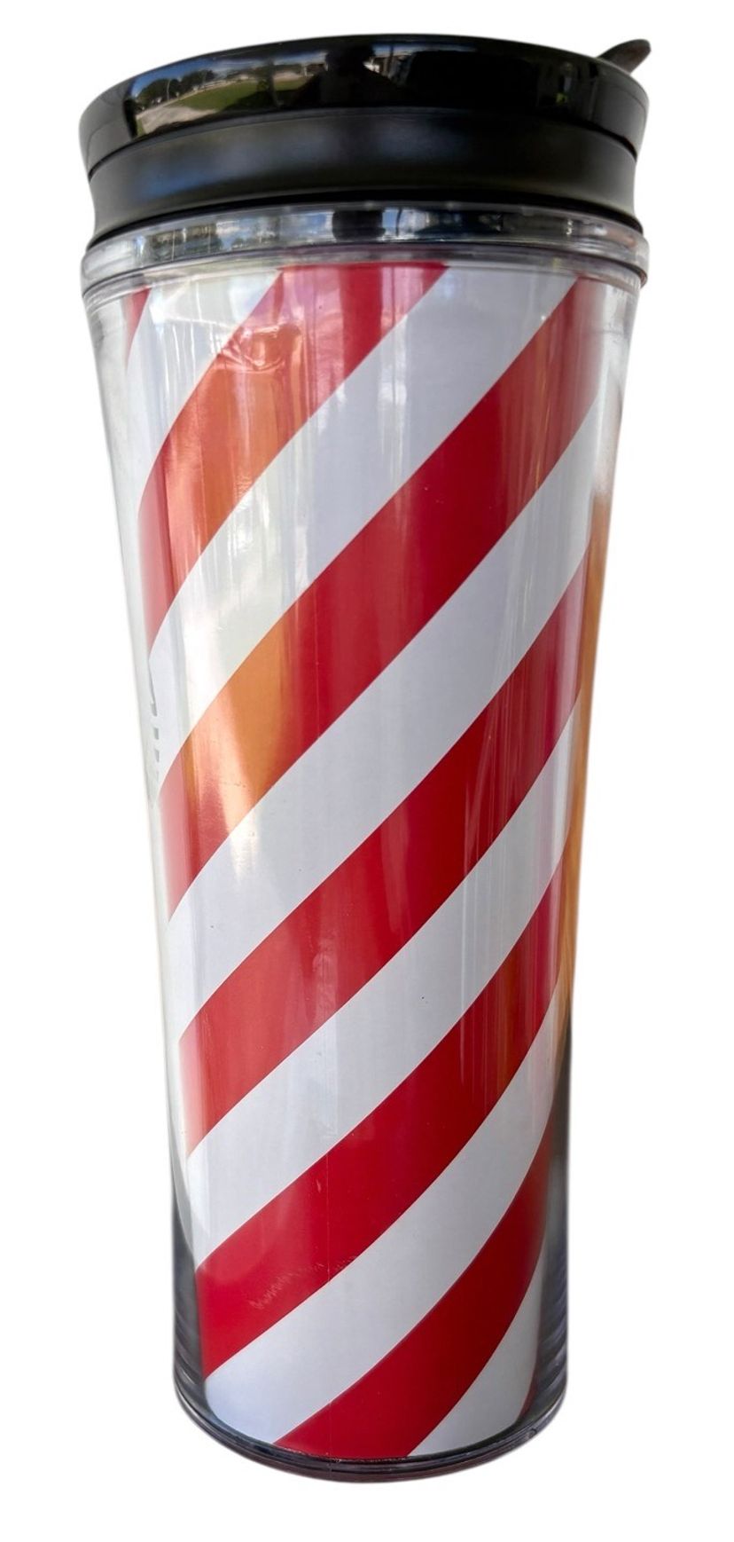 The product is a Starbucks Red & White Striped Candy Cane Tumbler Travel Mug Coffee Cup with a capacity of 16 oz. It is a collectible item featuring the Starbucks brand and holiday-themed advertising. This original coffee and tea themed tumbler is a featured refinement in the Starbucks collection, with a candy cane color design that adds a festive touch to your favorite hot beverages. Made in China, this tumbler is a must-have for Starbucks enthusiasts looking for a unique and stylish way to enjoy their coffee on the go.