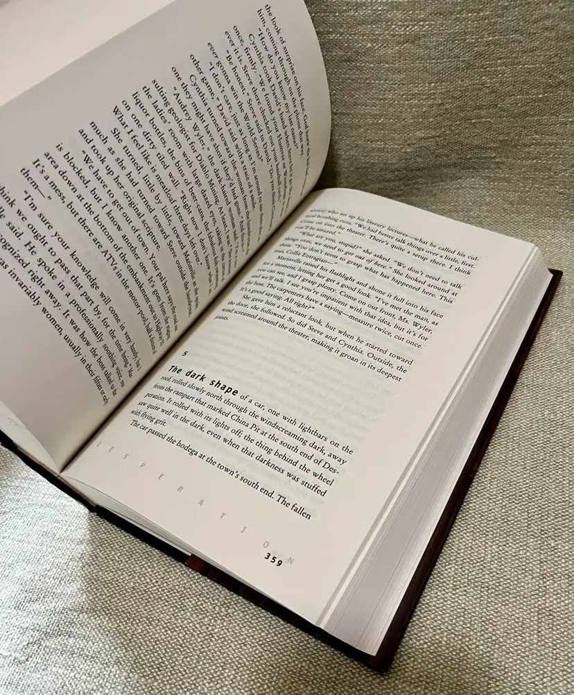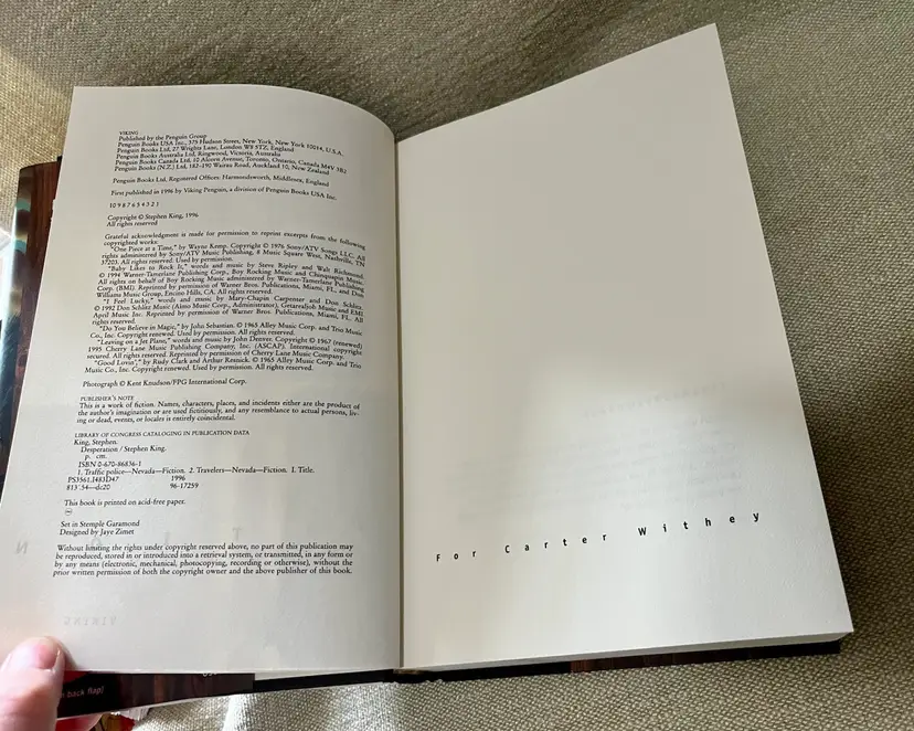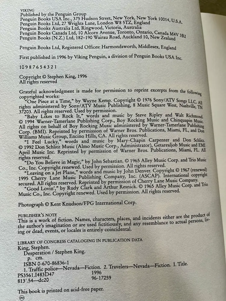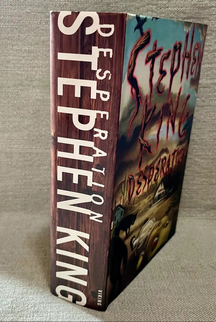 The is a first edition hardcover novel titled "Desperation" by Stephen King, published in 1996 by Penguin Publishing Group, Viking. This horror and supernatural thriller falls under the genre of fiction and is intended for a young adults - adult audience. The novel, with a total of 704 pages, features a dust jacket and is written in English, making it a vintage piece from the 1990s. With its chilling narrative and iconic author, this book is sure to captivate readers with its modernist literary style and gripping storyline.