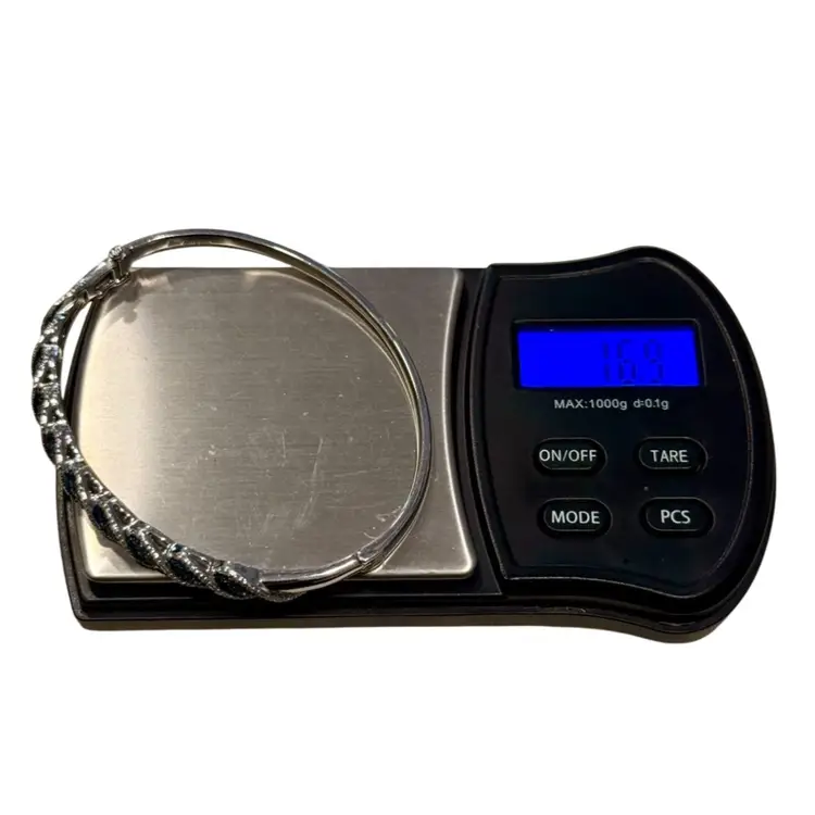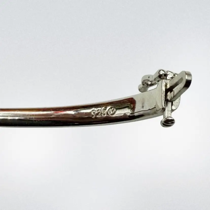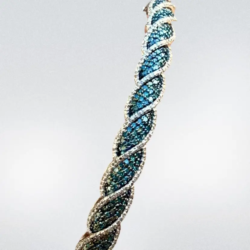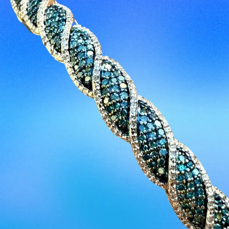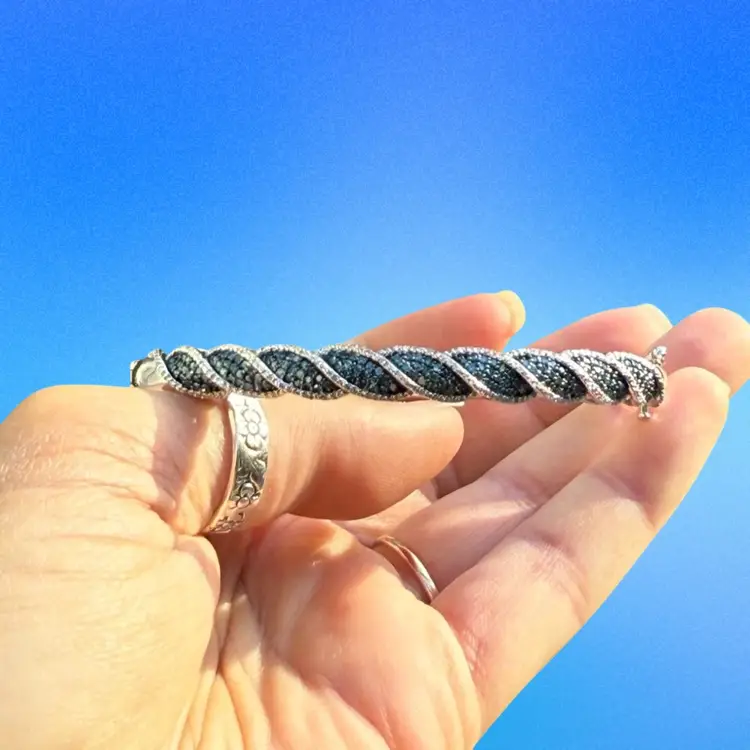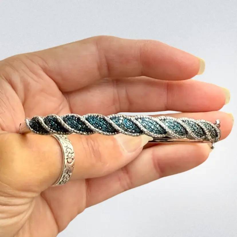 Lovely sterling silver bangle bracelet has an inner circumference of 7 ¼" and features 108 treated blue diamonds with a total carat weight of .60ctw enhanced by 160 white diamonds with a total carat weight of .40ctw. The weight of this piece is 16.9 grams.