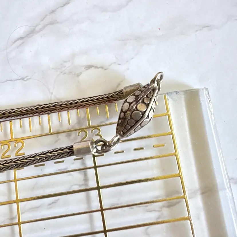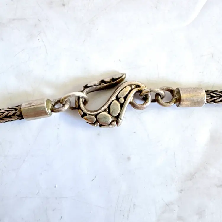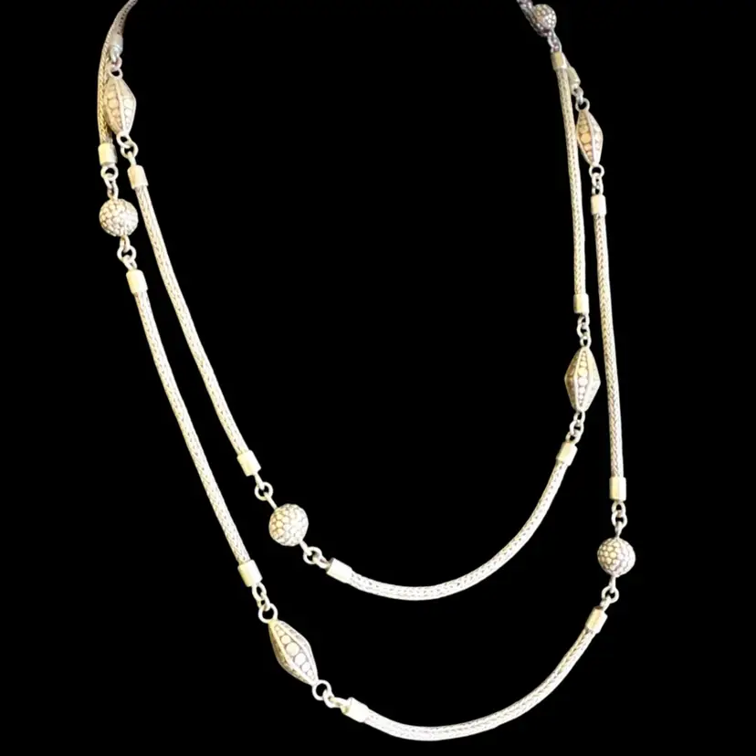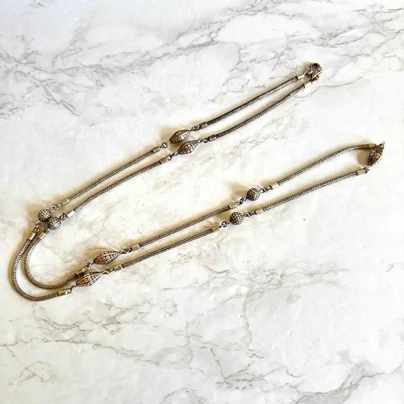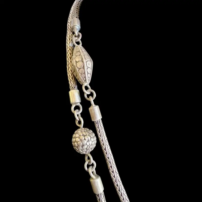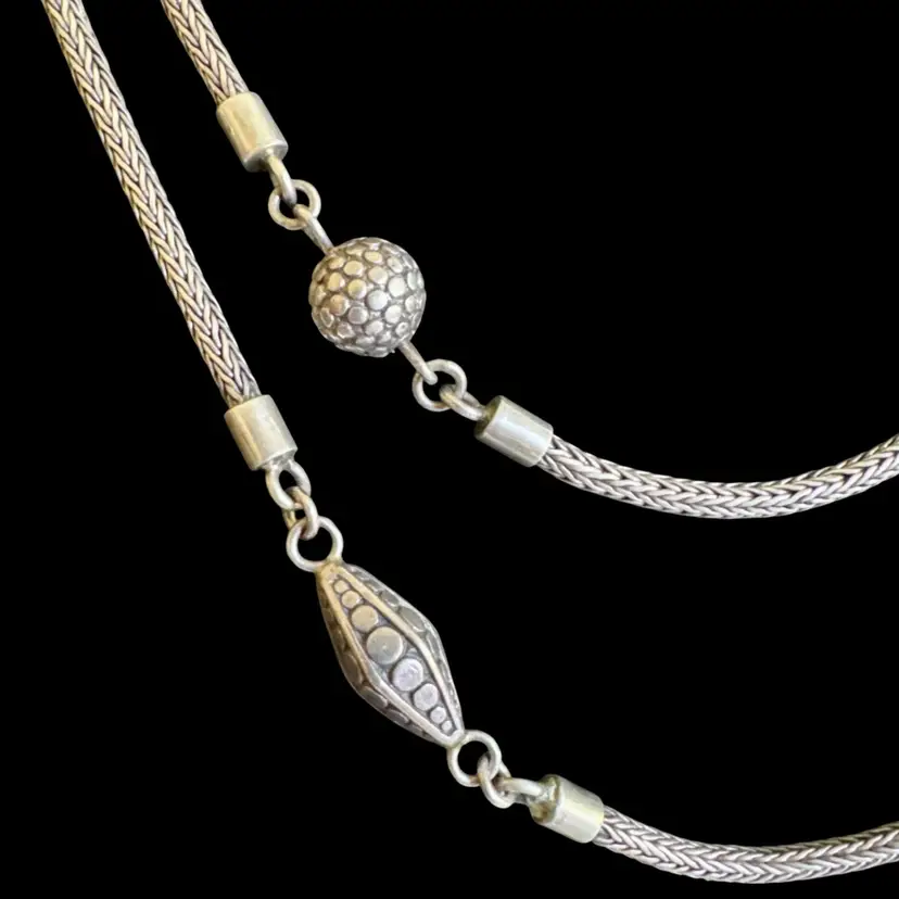 Versatile 48” long sterling silver necklace, tested sterling, featuring a rope-like chain with beads and a detailed clasp, suitable for wearing doubled up. Weighs 78g. Good condition with minor wear and patina. A sturdy, handcrafted piece with timeless appeal!