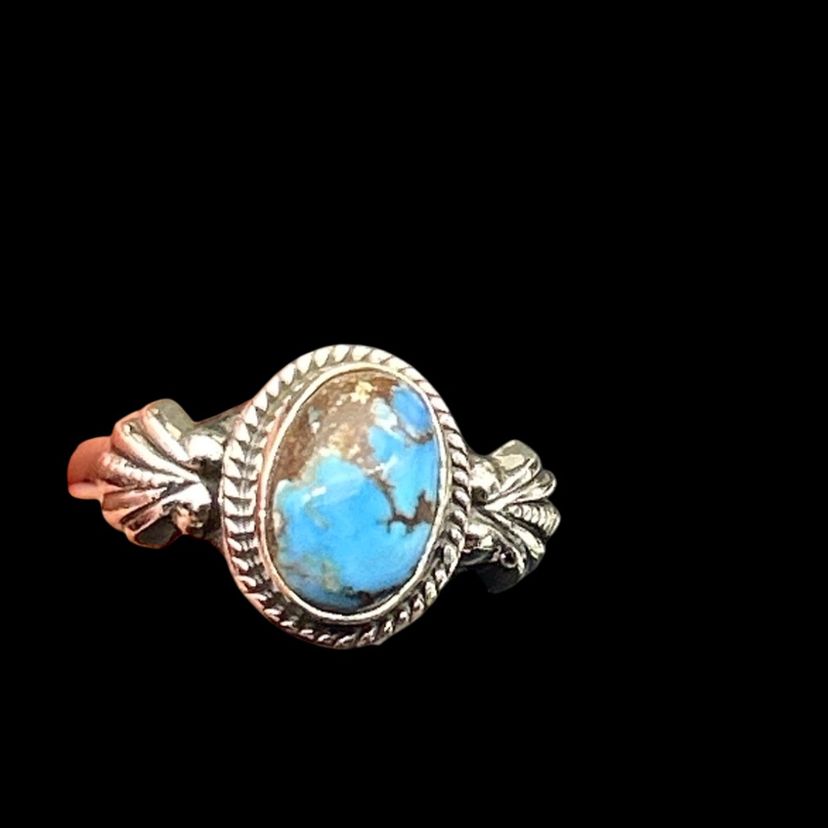This lovely sterling silver ring showcases a natural blue turquoise cabochon with earthy brown matrix veining, framed in a twisted rope bezel. The sides feature a graceful feather and scroll motif, adding to its handcrafted Southwestern character. The setting has a comfortable low profile and a solid shank that makes it perfect for everyday wear or stacking with other silver favorites.