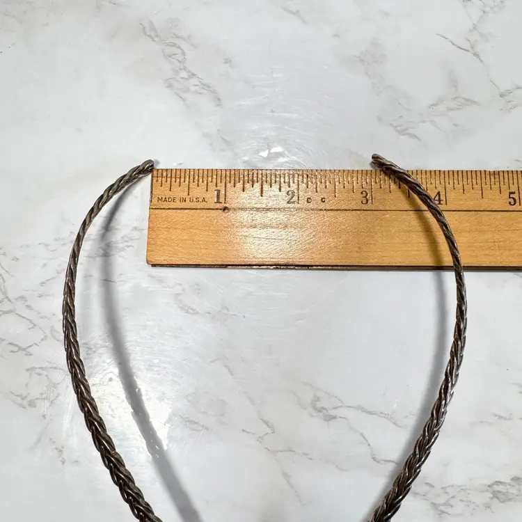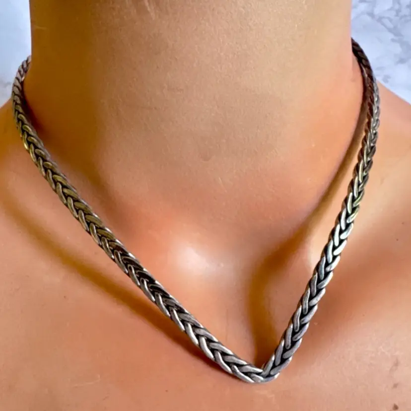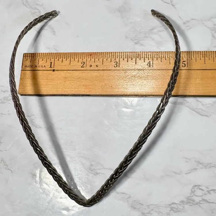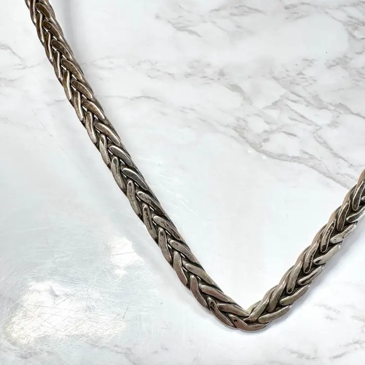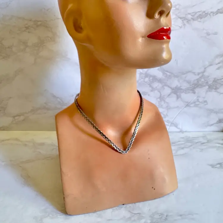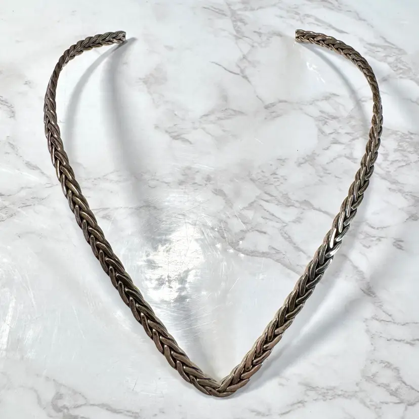 Striking sterling silver braided triangular collar torque choker necklace, tested 925, featuring a textured braided design. Measures 4-3/4” wide x 6” long, weighs 30g, with a 3” flexible opening for slip-on wear. Good condition with minor wear and patina. A unique, handcrafted statement piece!