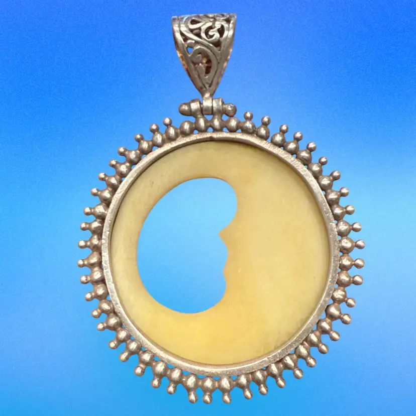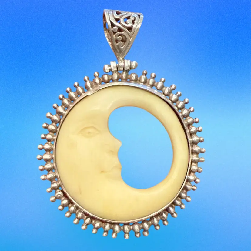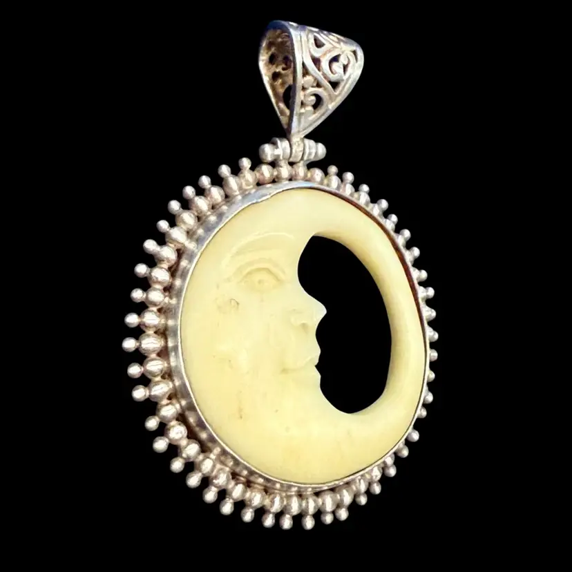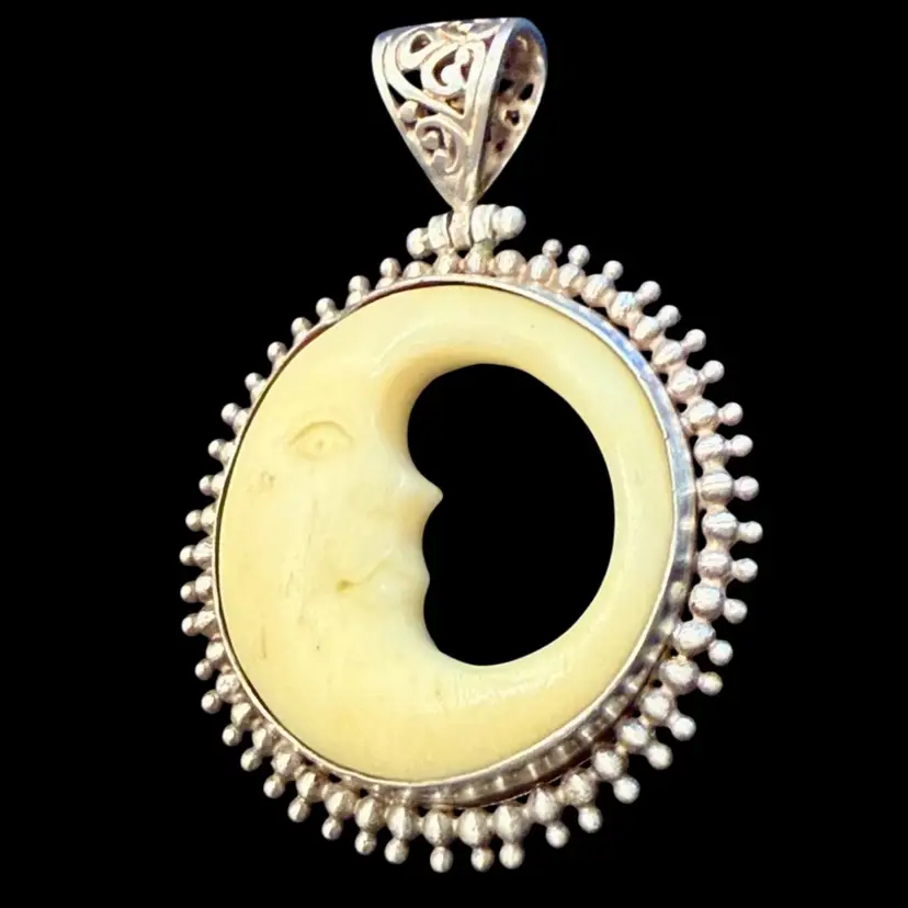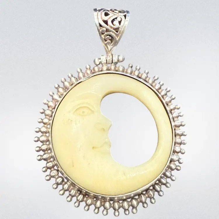 Celestial pendant hand crafted in sterling silver features a carved benevolent faced crescent moon within a granular beaded frame on a moveable hinged large filigree pierced bale. Tested sterling.