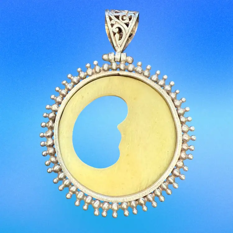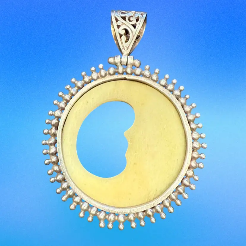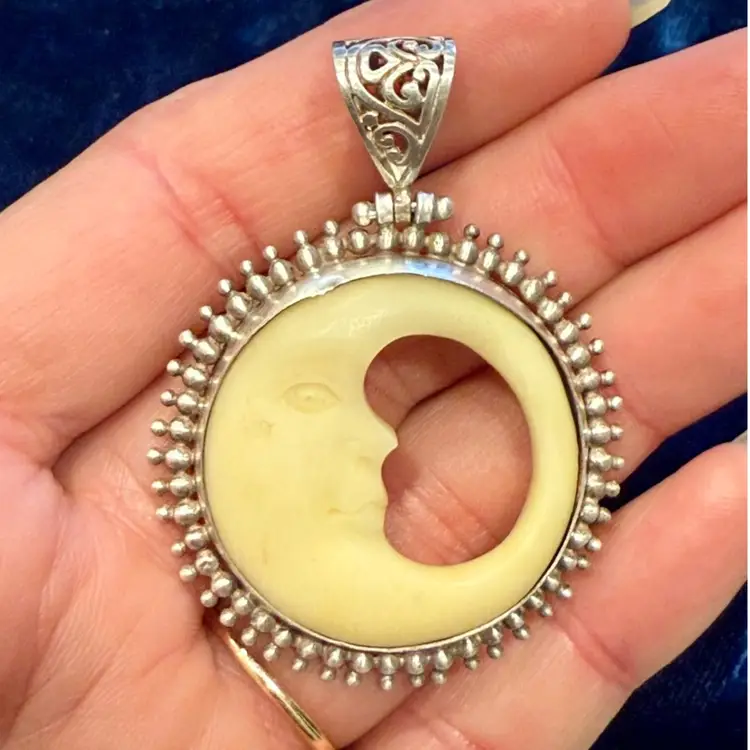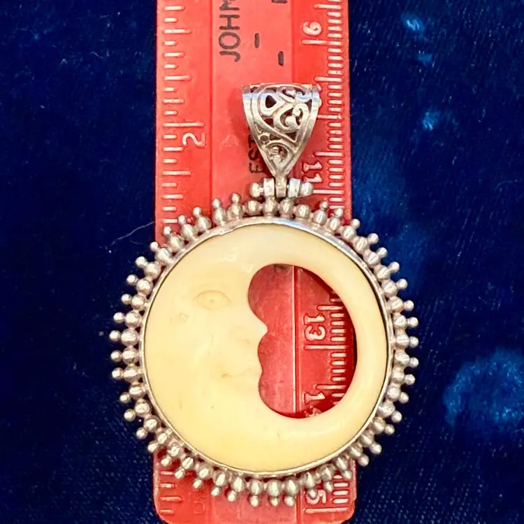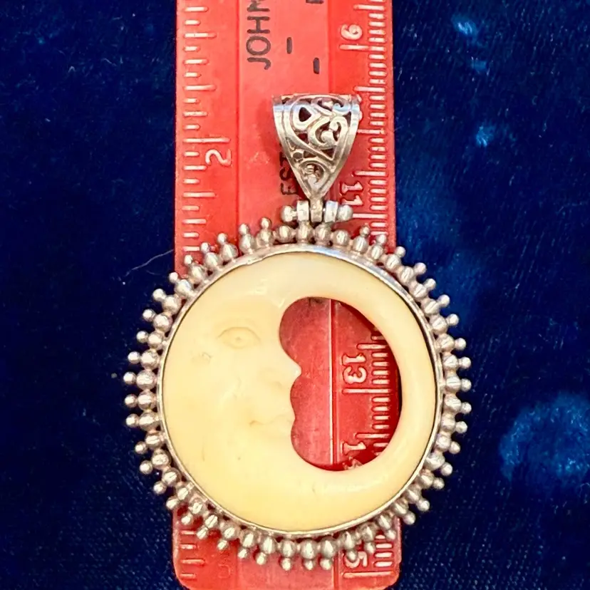 Celestial pendant hand crafted in sterling silver features a carved benevolent faced crescent moon within a granular beaded frame on a moveable hinged large filigree pierced bale. Tested sterling.