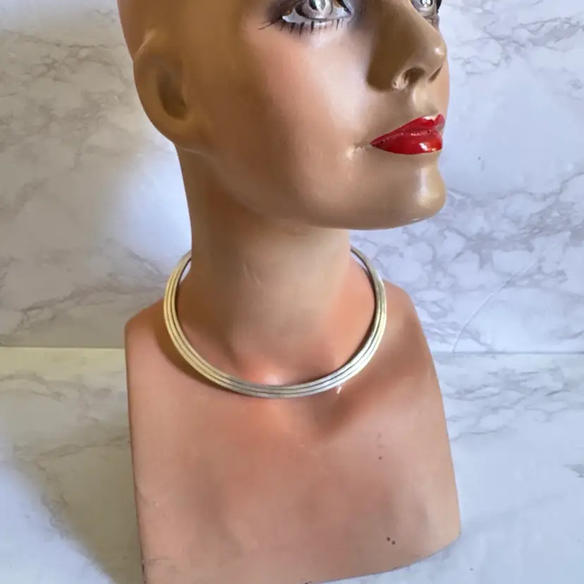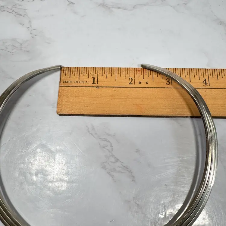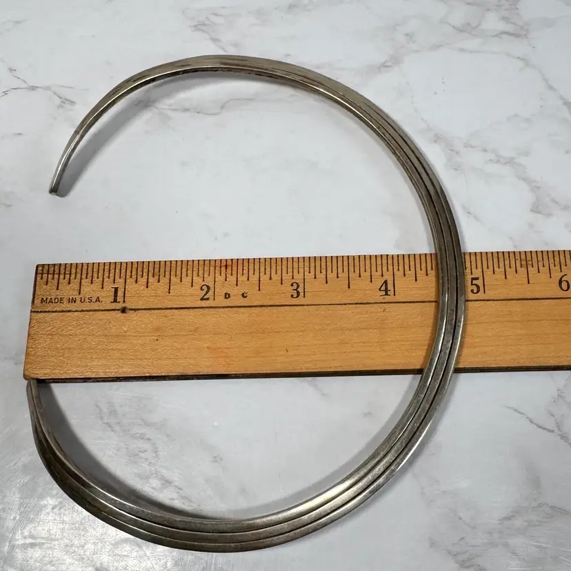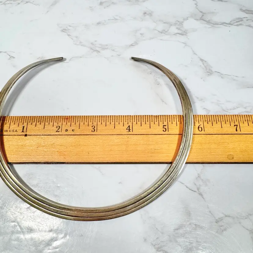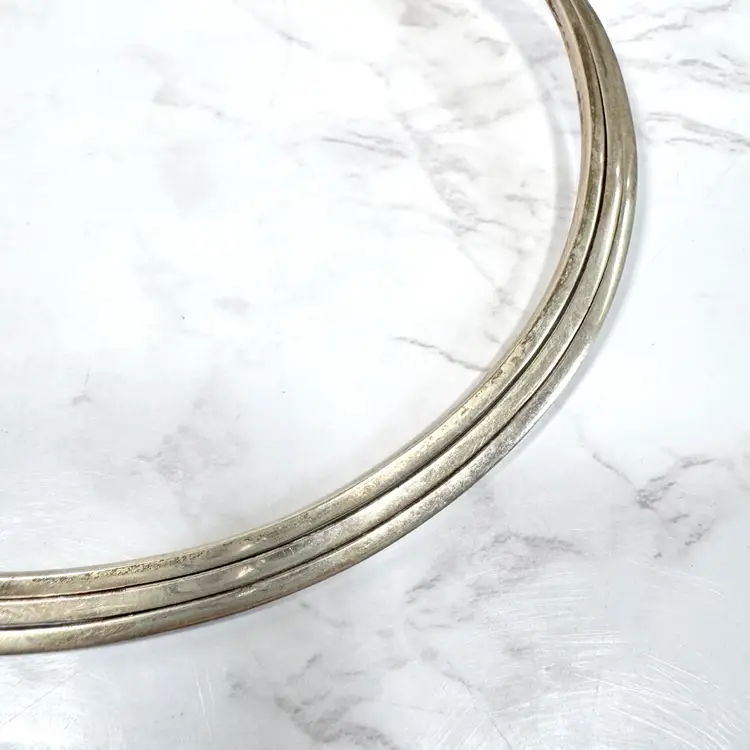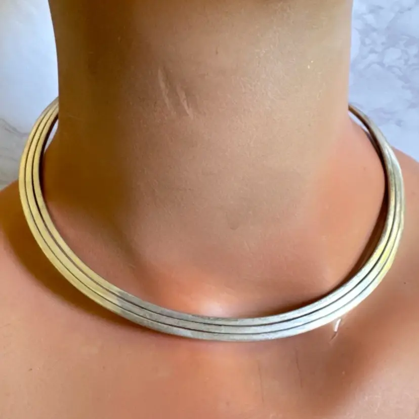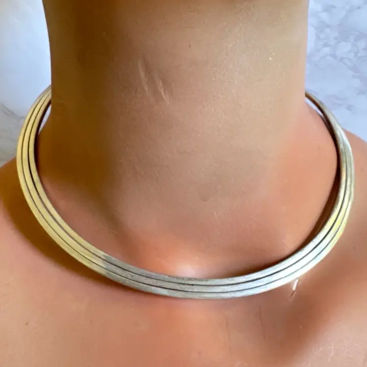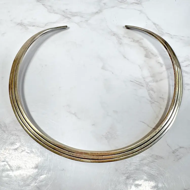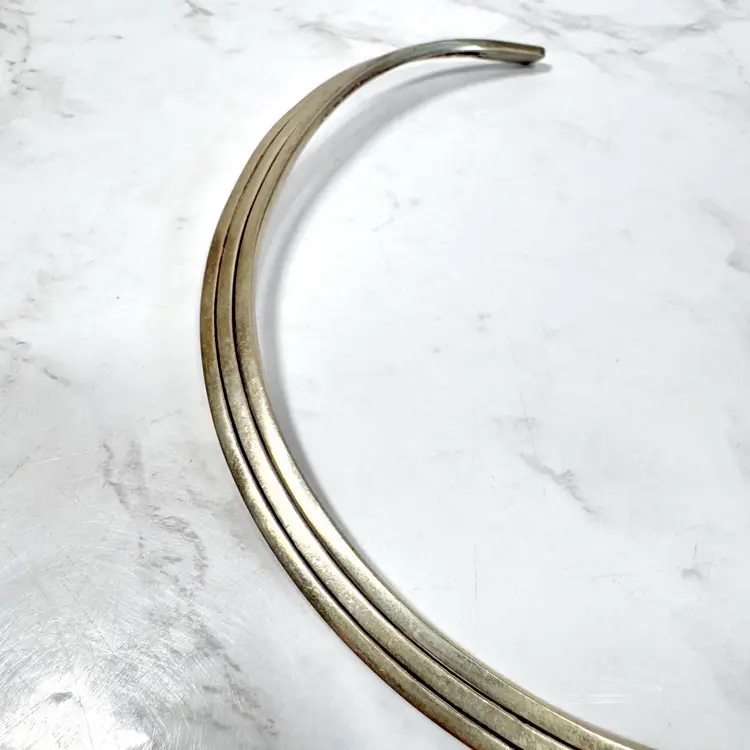 Bold sterling silver tri-strand collar torque choker necklace, tested 925, with three metal strands fused together at the ends. Measures 5-3/4” wide x 4-3/4” high, weighs 54g, with a 2-1/4” flexible opening for slip-on wear. Good condition with minor wear and patina. A striking, handcrafted statement piece!