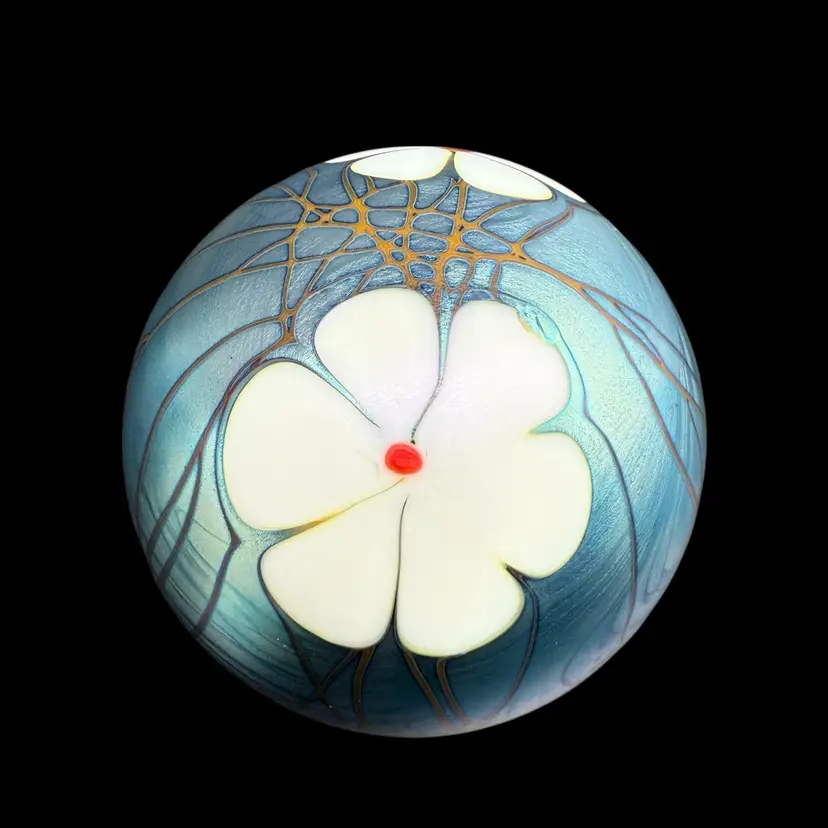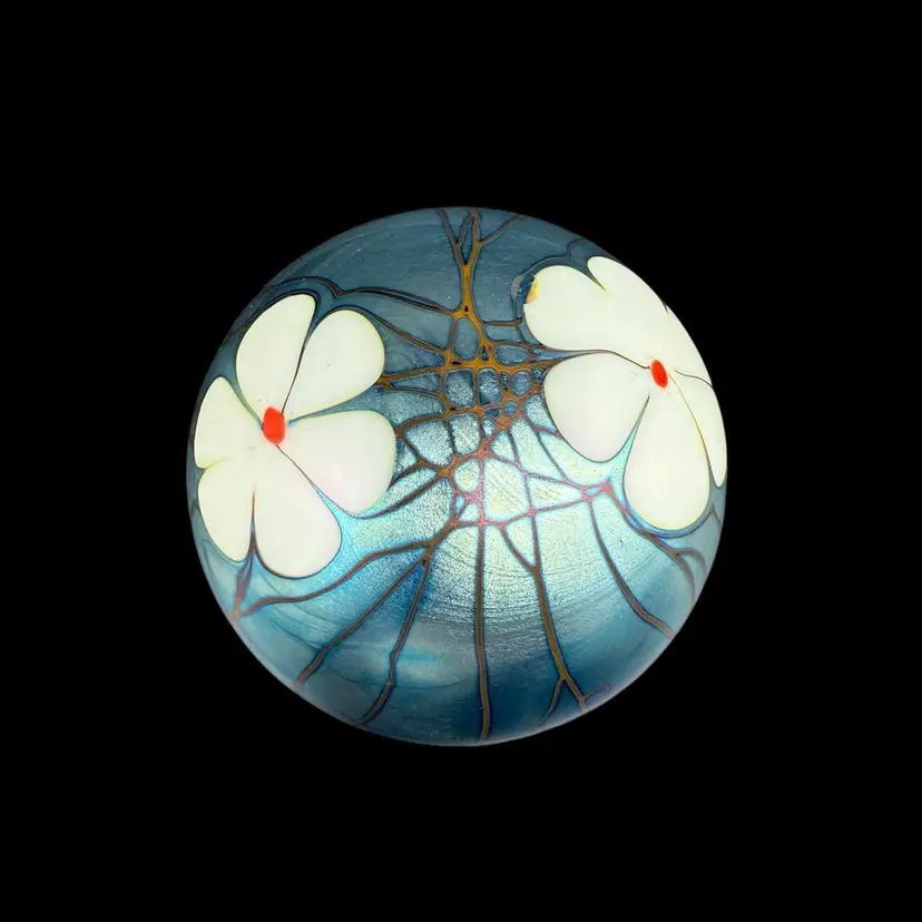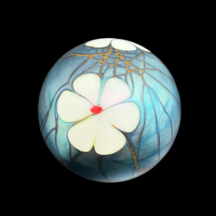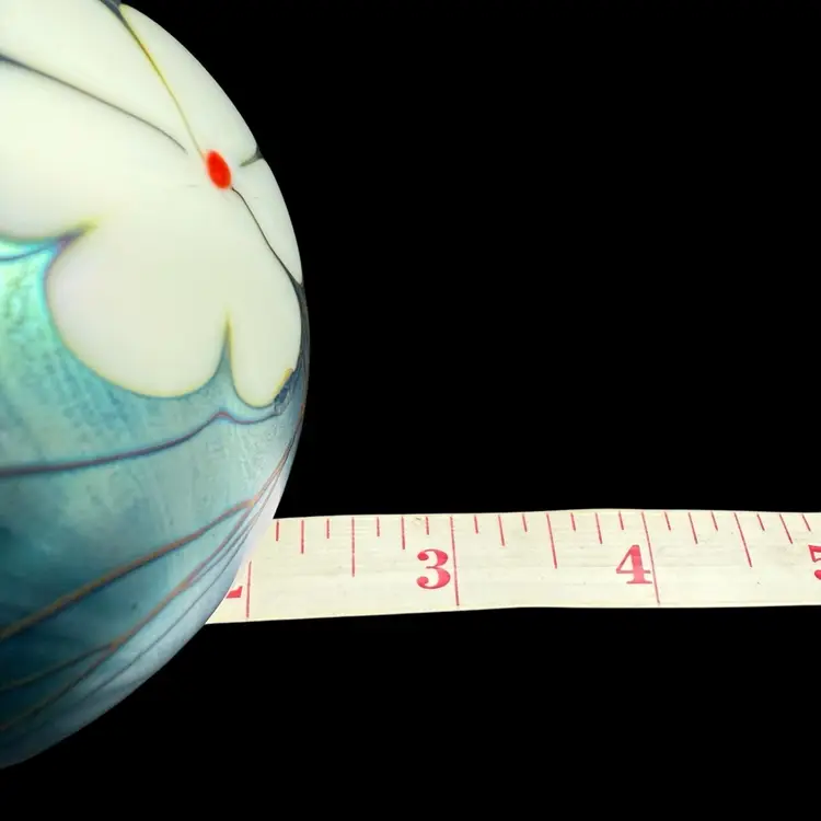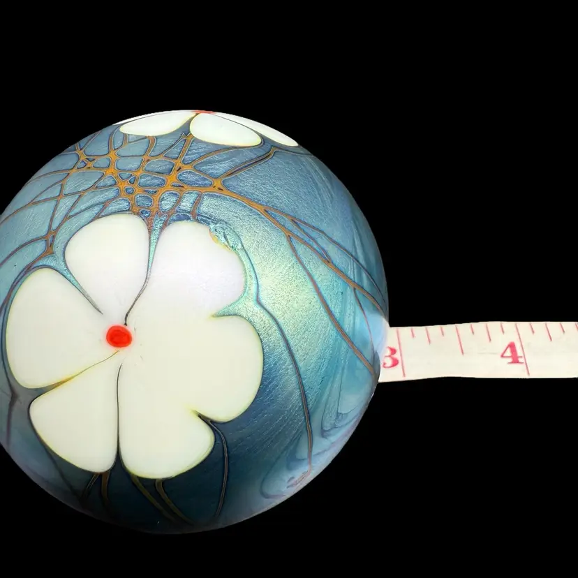 This stunning Steve Smeyers Art Glass Flower Paperweight in iridescent blue is a beautiful and unique piece from 1976, signed and numbered by the artist. This vintage paperweight features a multicolored design with a floral theme, showcasing the artistry and craftsmanship of the late 20th century. Handmade with an iridescent finish, this art glass piece is a collectible item that embodies beauty and creativity, perfect for any art lover or collector.