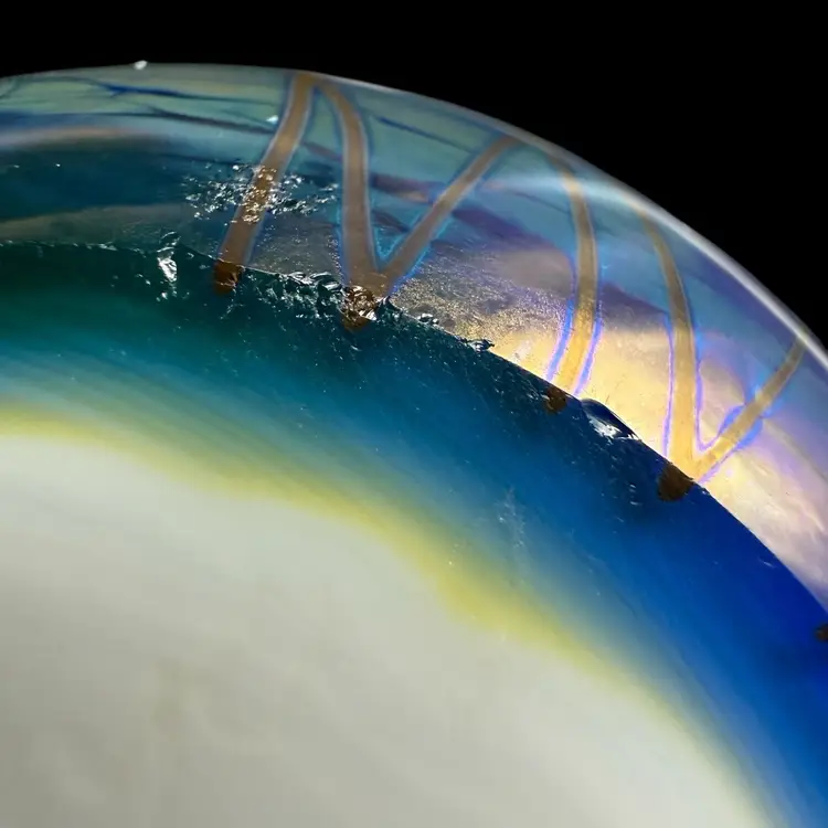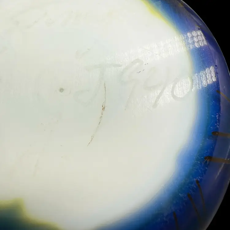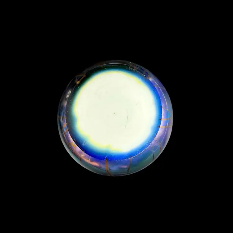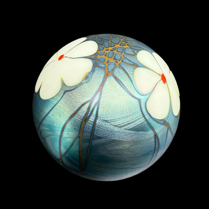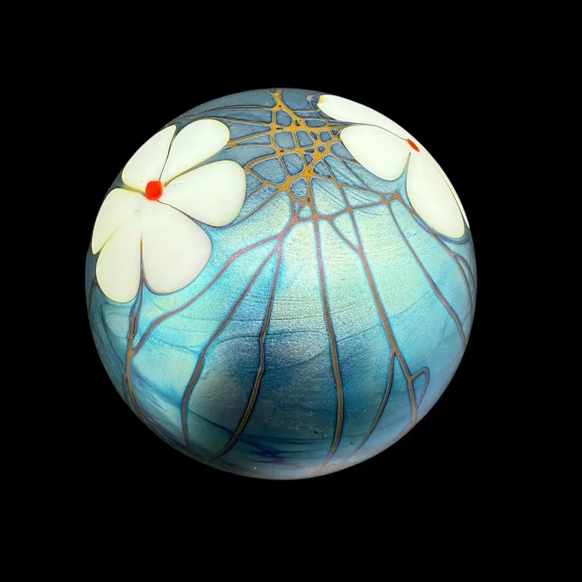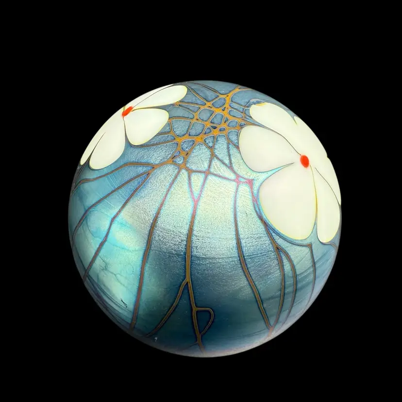 This stunning Steve Smeyers Art Glass Flower Paperweight in iridescent blue is a beautiful and unique piece from 1976, signed and numbered by the artist. This vintage paperweight features a multicolored design with a floral theme, showcasing the artistry and craftsmanship of the late 20th century. Handmade with an iridescent finish, this art glass piece is a collectible item that embodies beauty and creativity, perfect for any art lover or collector.