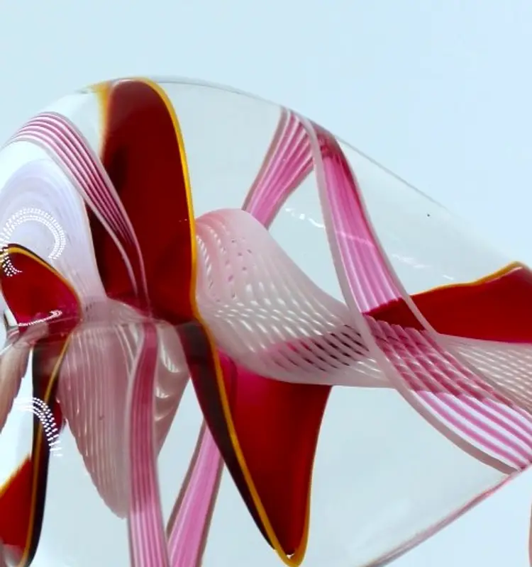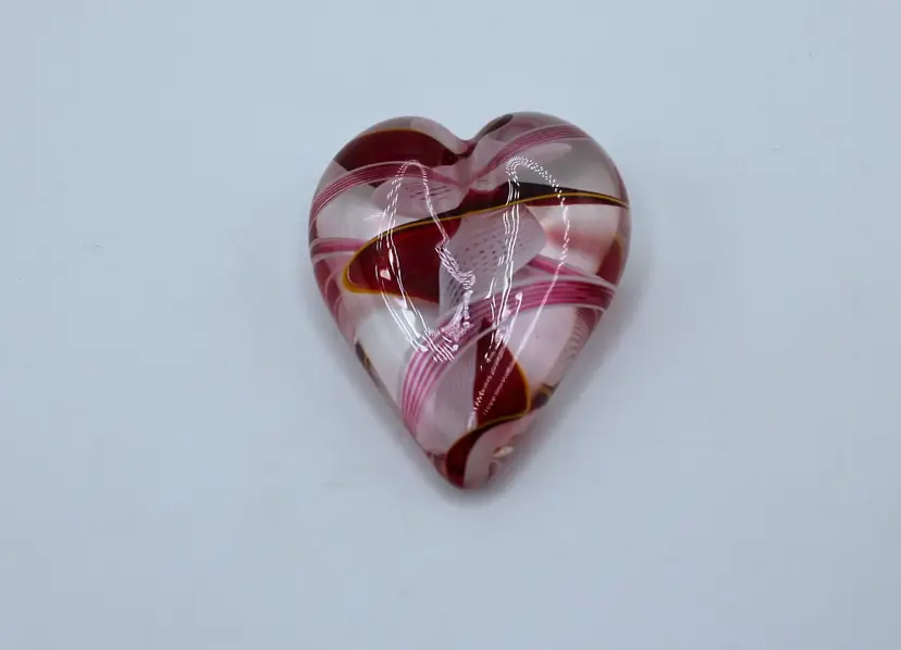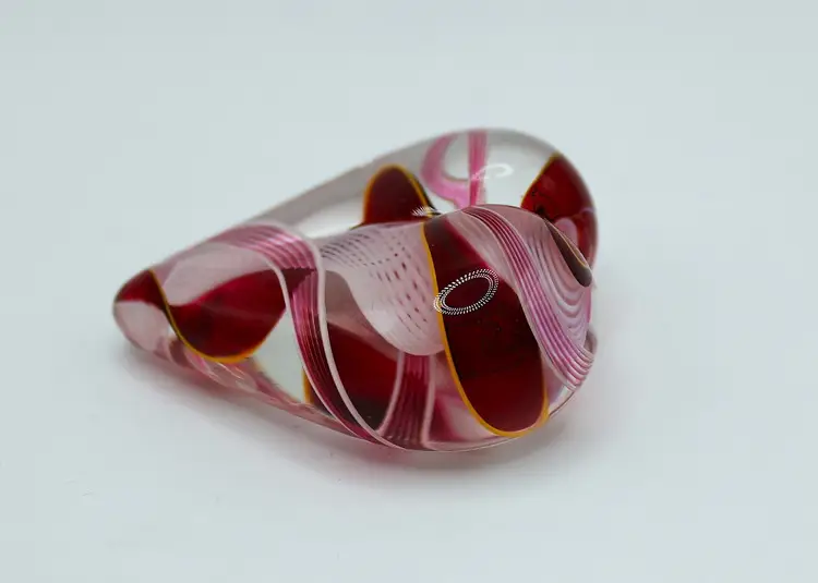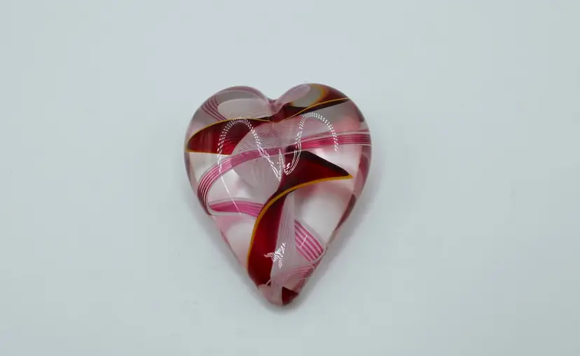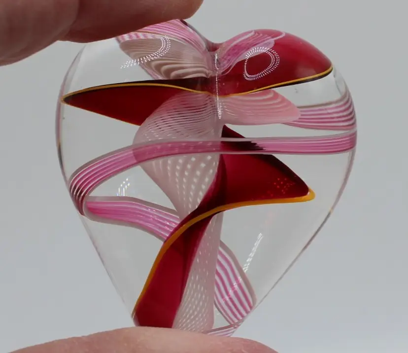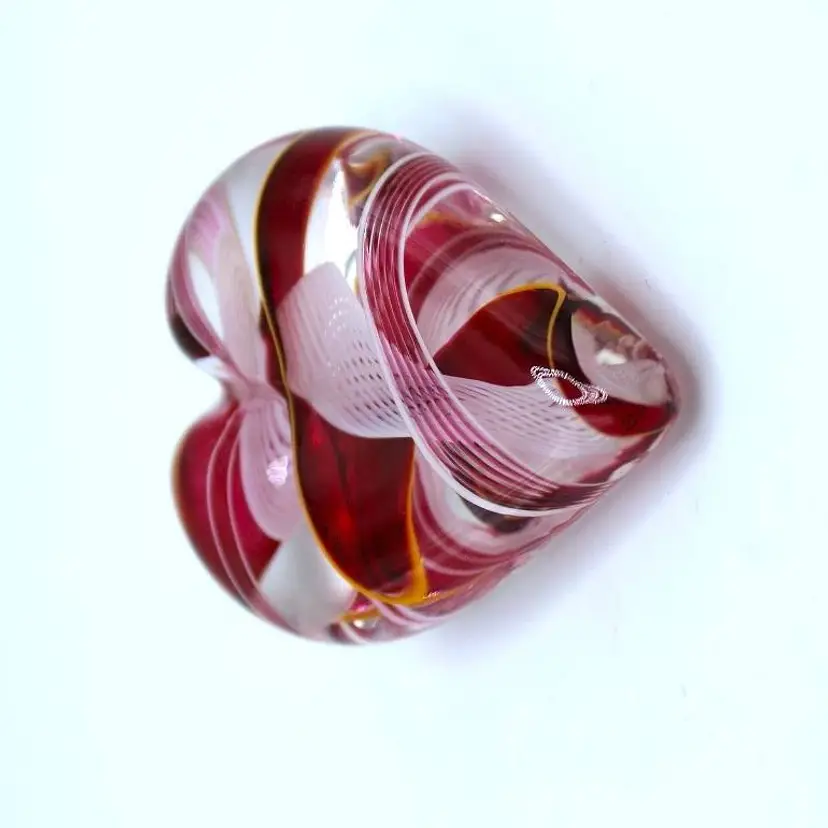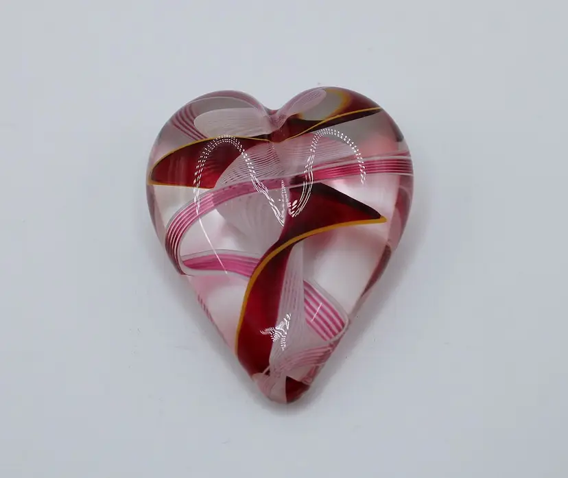 Lovely blown glass heart paperweight created by Steven Maslach at his Cuneo Furnace studio in Seattle, Washington. His technique features blown glass ribbons of red, pink and a hint of yellow with a beautiful white latticinio swirl pattern running through the center. Paperweight measures 2" long x 2.5" wide x 3/4" tall.