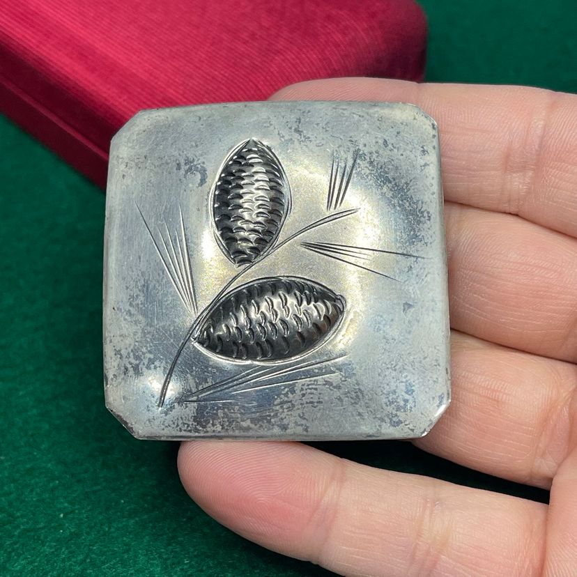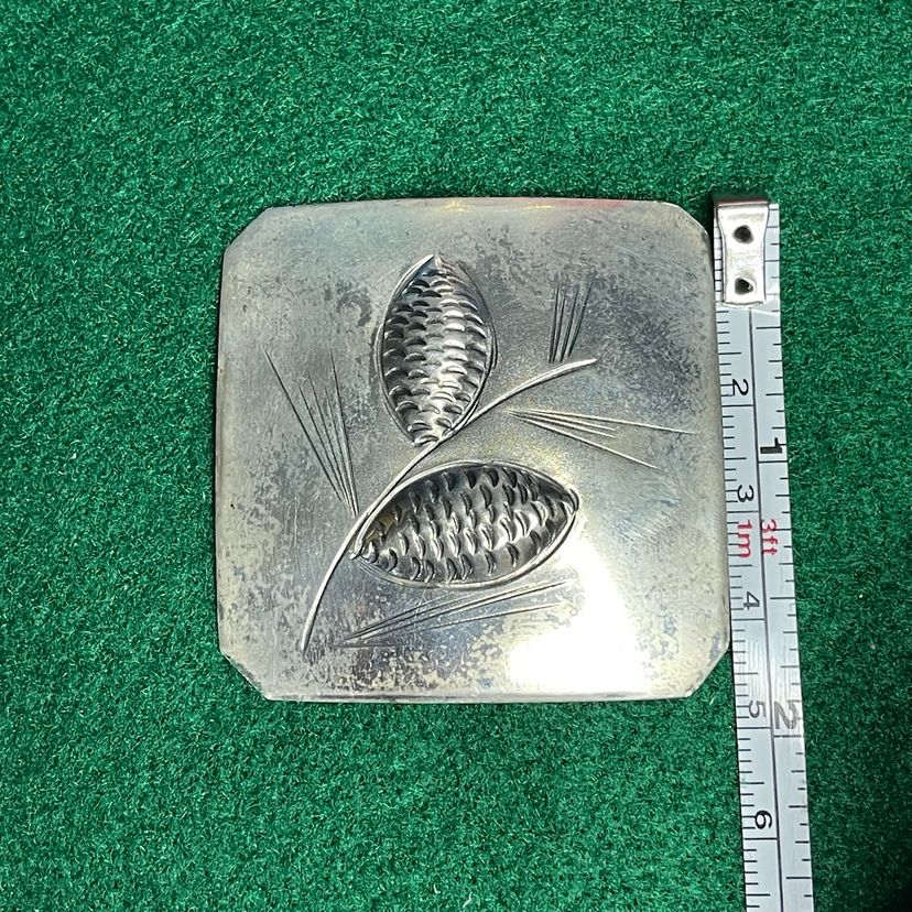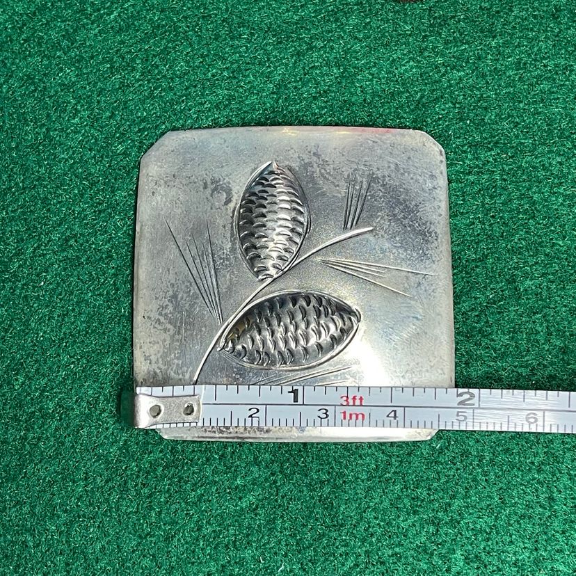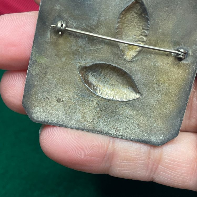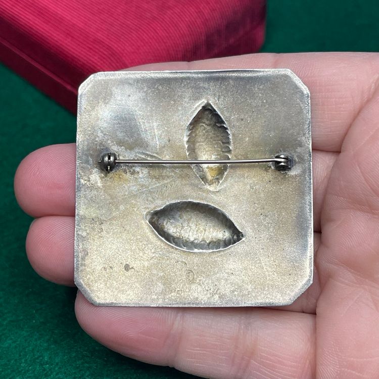 This lovely brooch is in good condition with some minor patina and little to no dents or dings. The stamped mark on the back is quite shallow and can be difficult to see but does indicate the maker. This is tested and marked as Sterling silver and this maker is well known to create this piece in that material. The brooch is about 1-7/8 inches square.