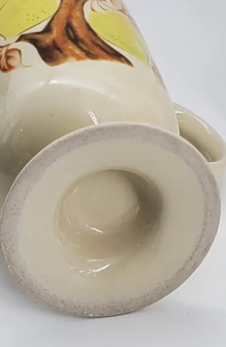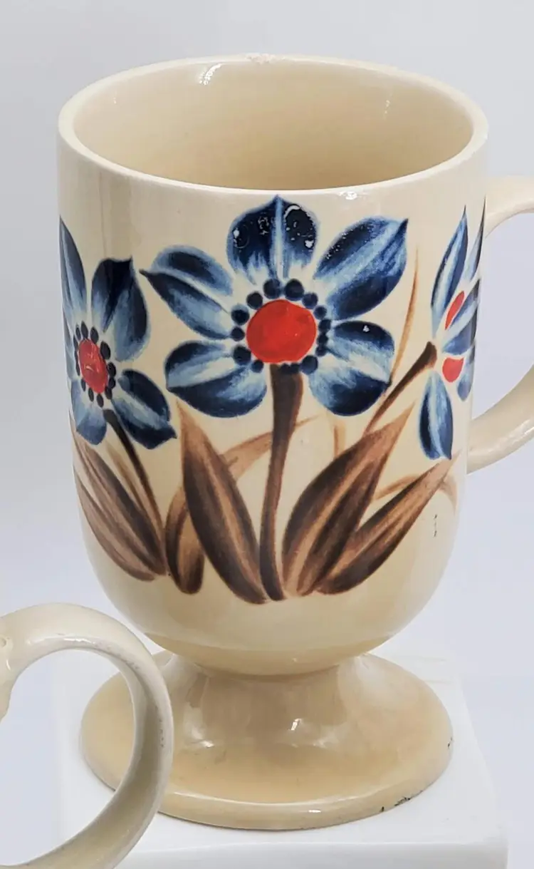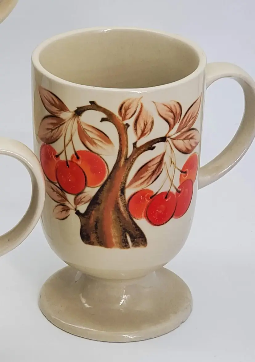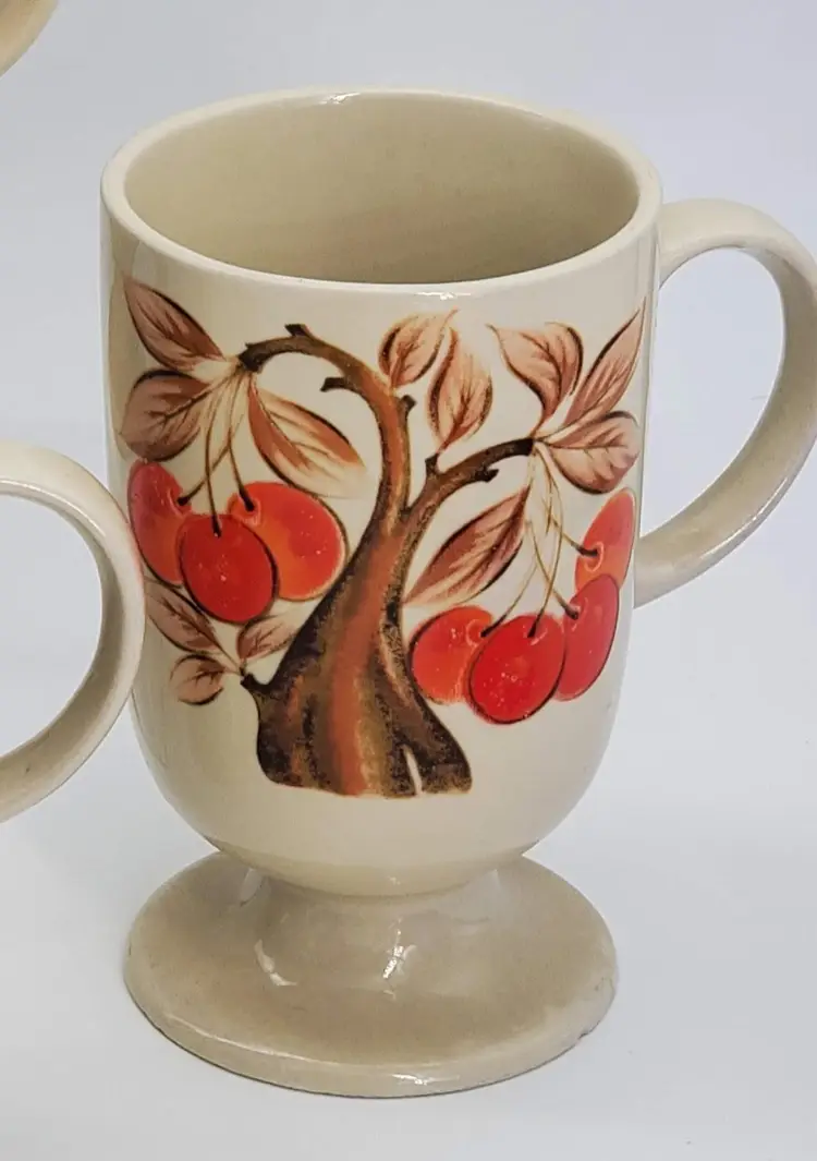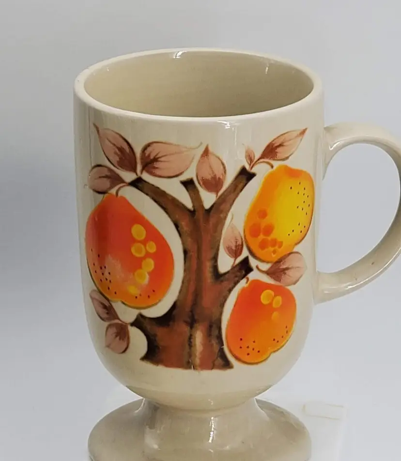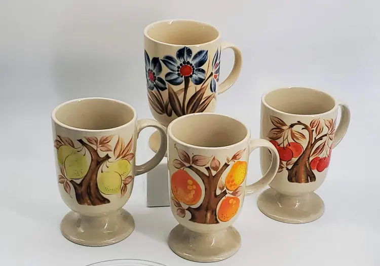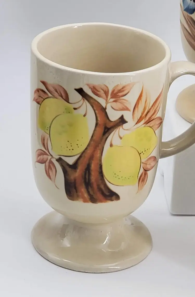 These bright 1960's pedestal mugs are perfect for your morning beverages! The hand painted flower and fruits are in perfect condition.