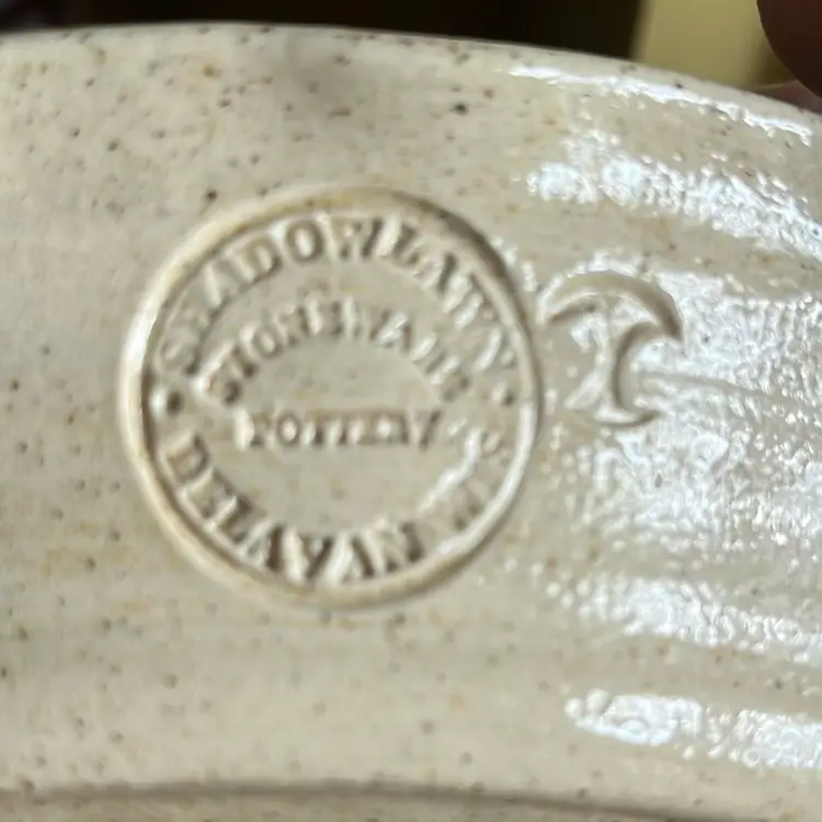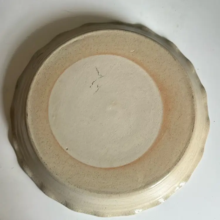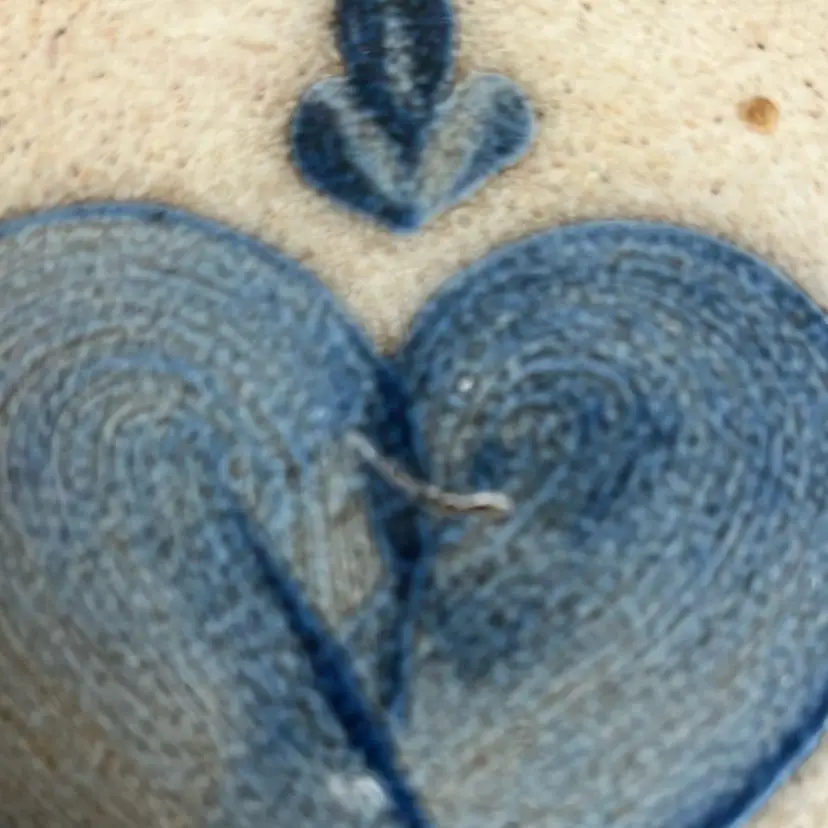 Shadow lawn stoneware pottery from Wisconsin. Salt glazed pie plate with blue heart. Note the “fingernail” slice in second photo.