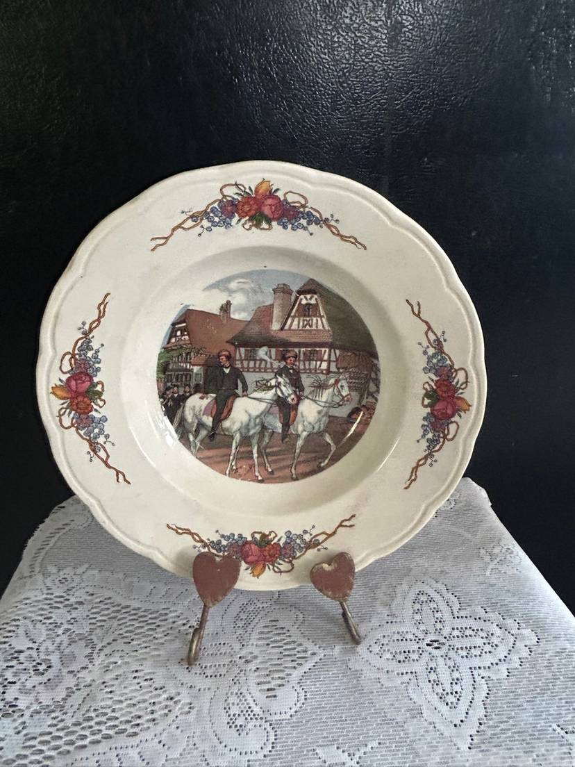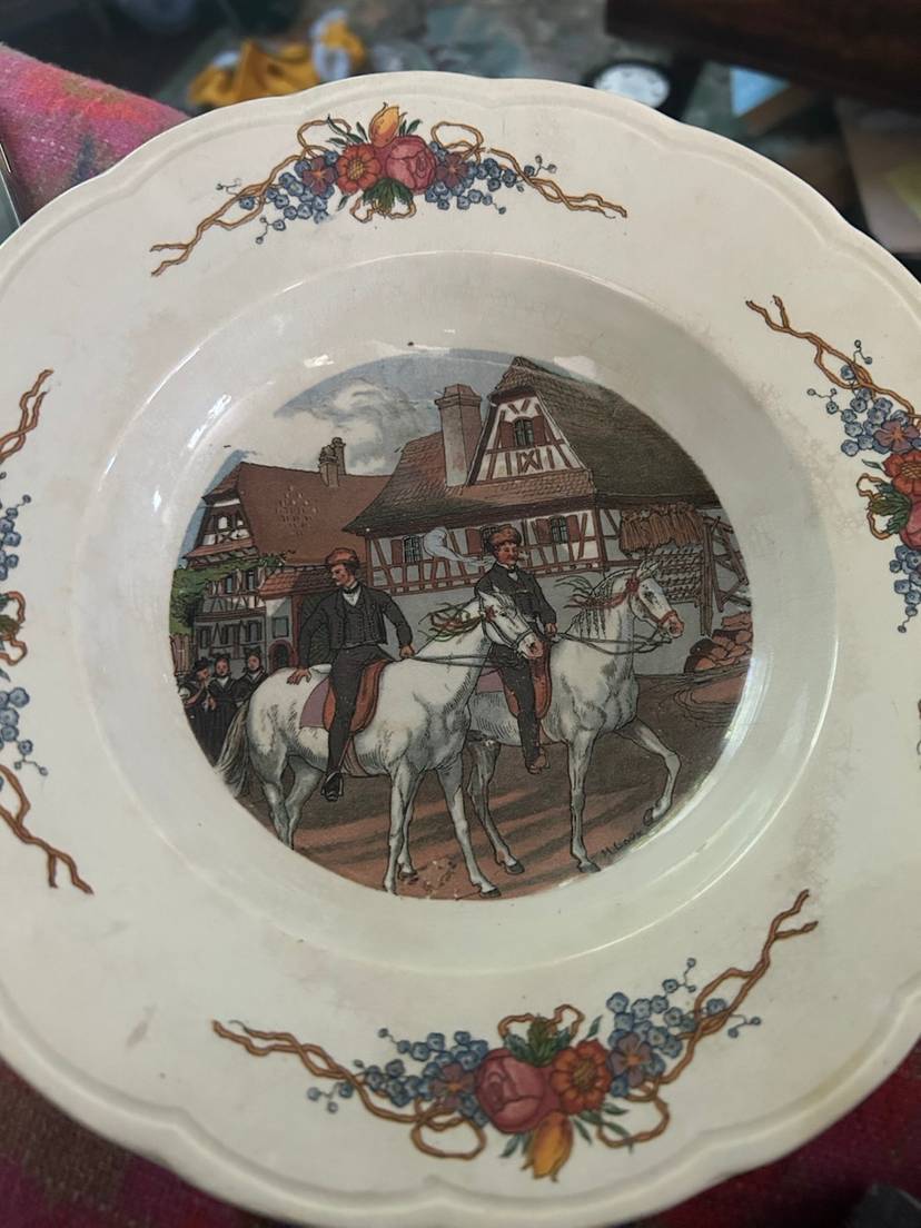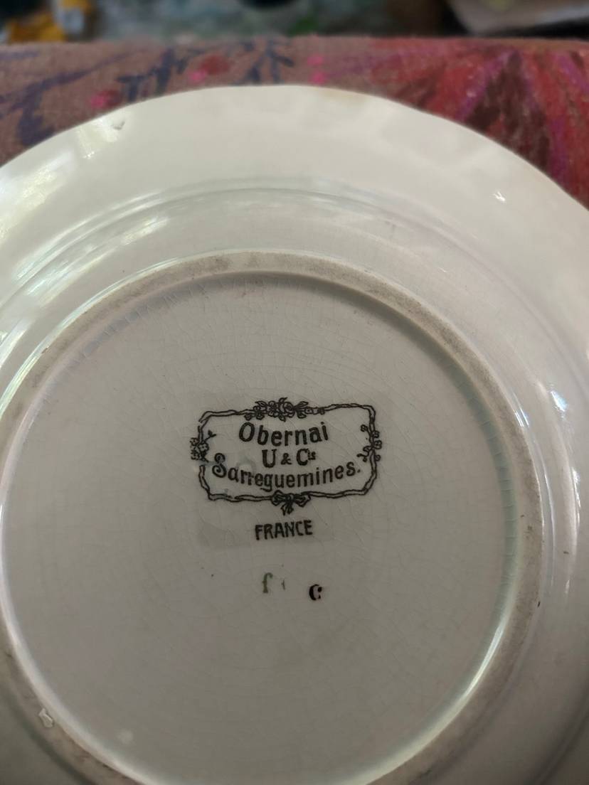 Sarreguemines "Obernai" vegetable bowl. The design, featuring a village scene with horseback riders, was created by Alsatian artist Henri Loux for the Sarreguemines pottery company. The Obernai pattern was produced by Sarreguemines Faienceries in France. The pattern was in production from 1904 to 1940 and again from 1945 to 1967.