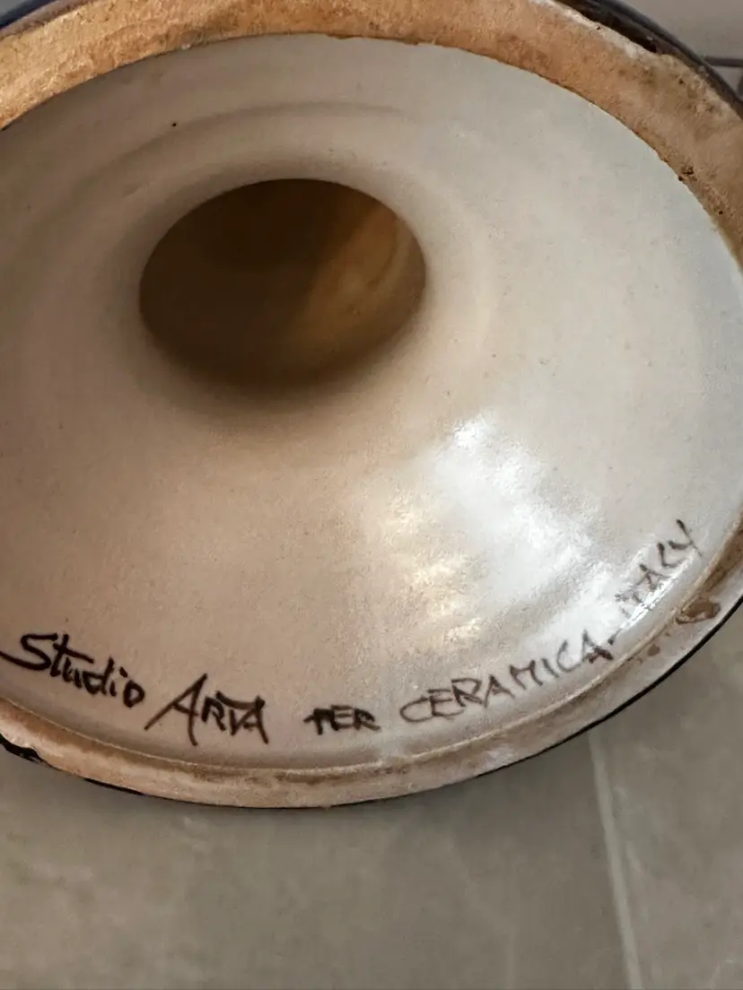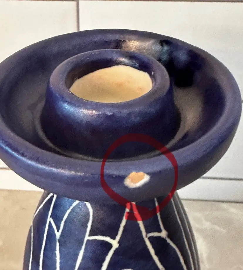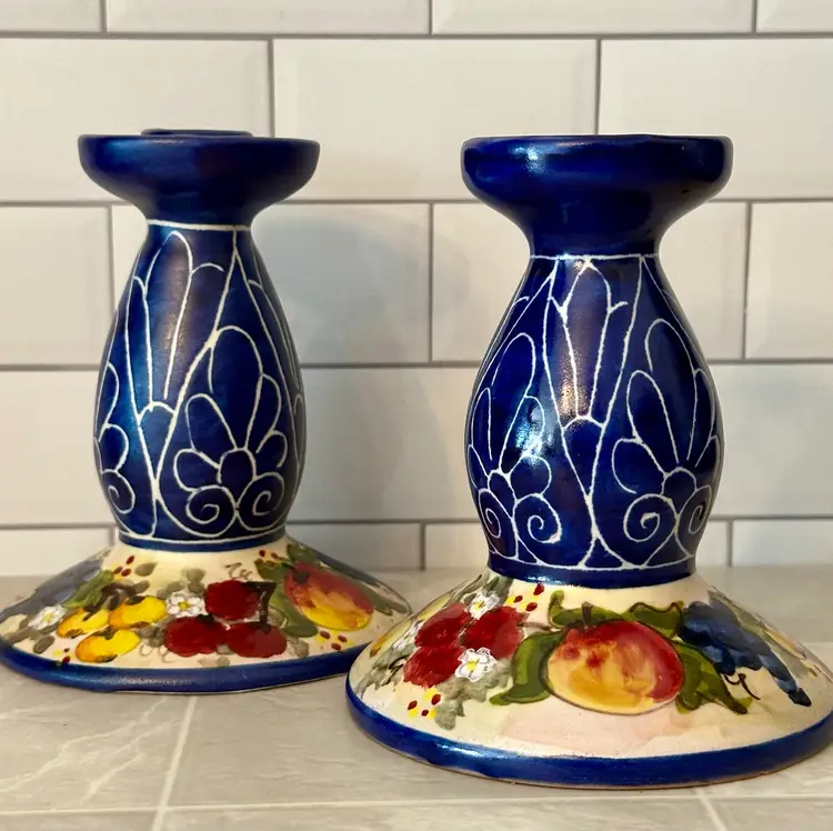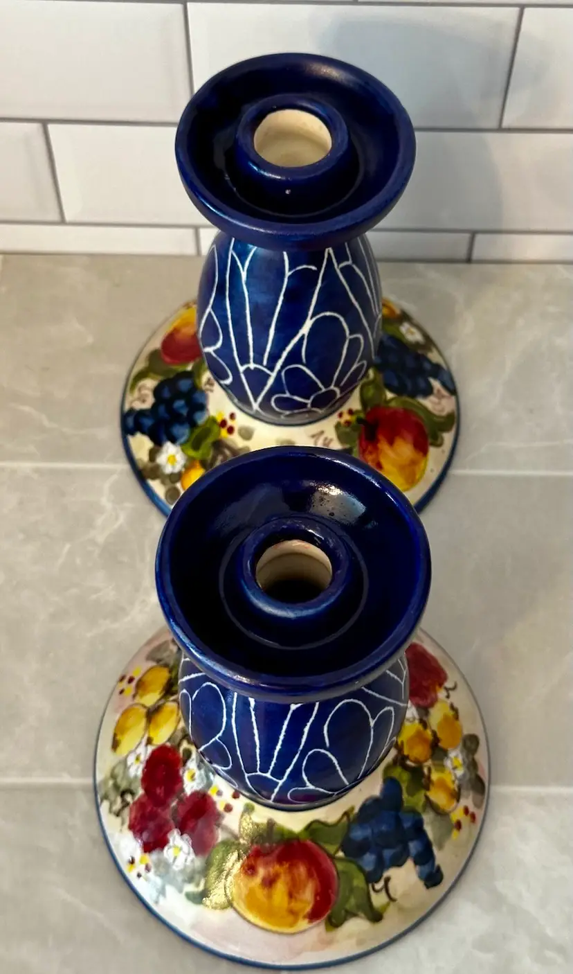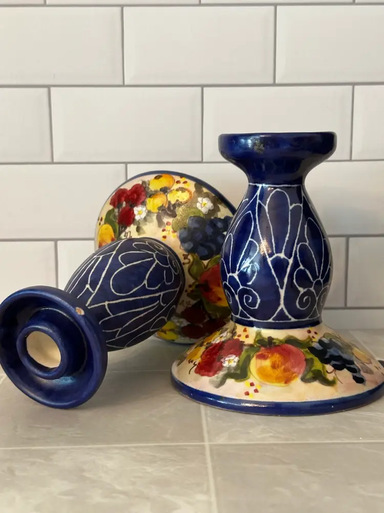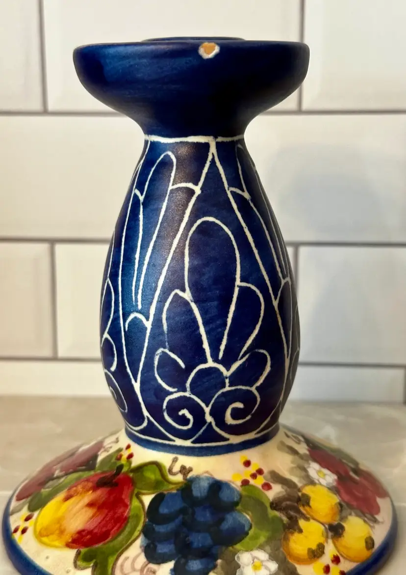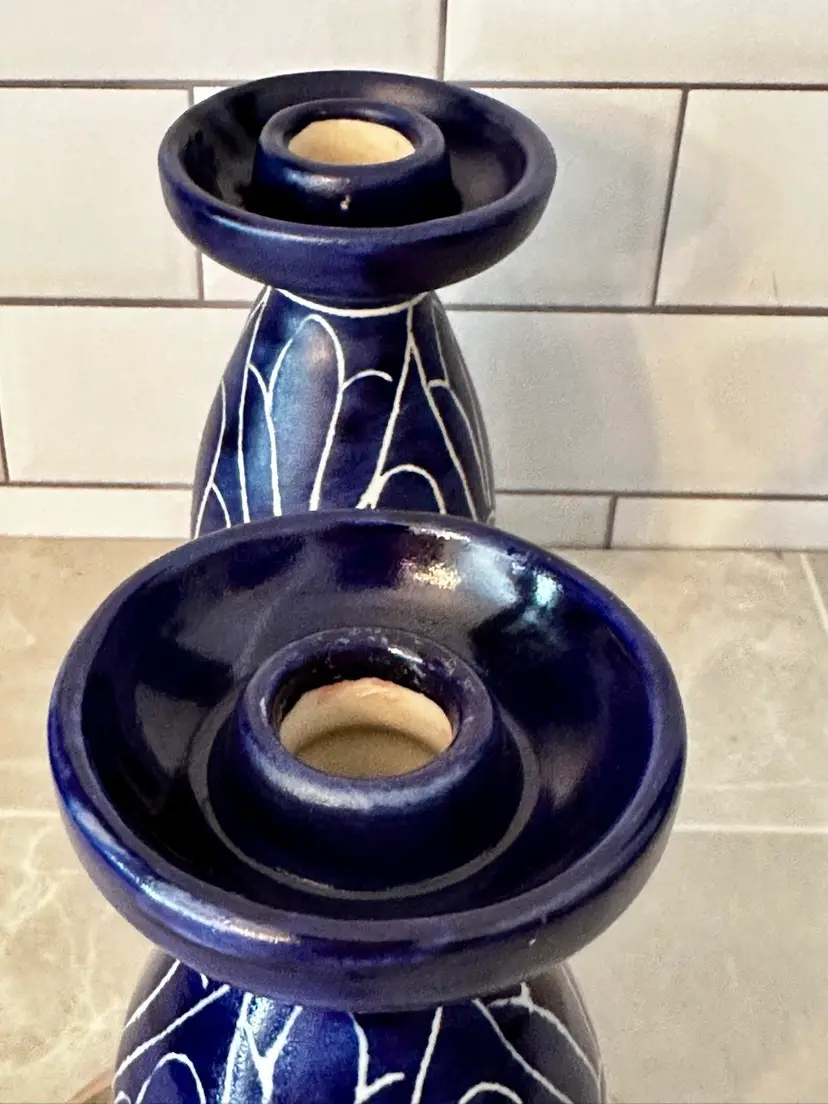 Good Condition. No cracks or crazing. There is one small chip on back side of one of the candleholders. See Photos. Could easily be touched up with cobalt blue paint.