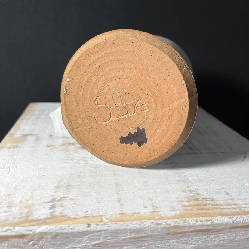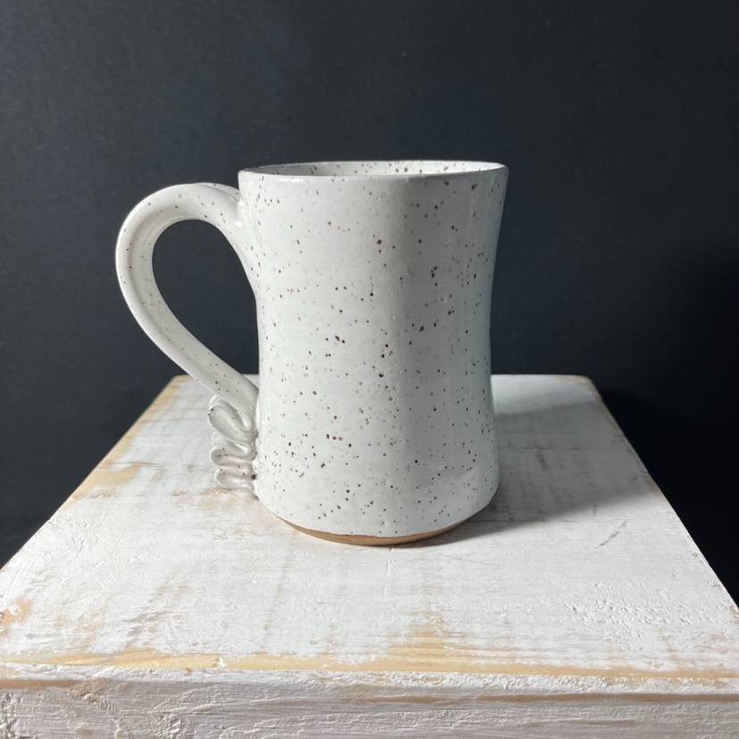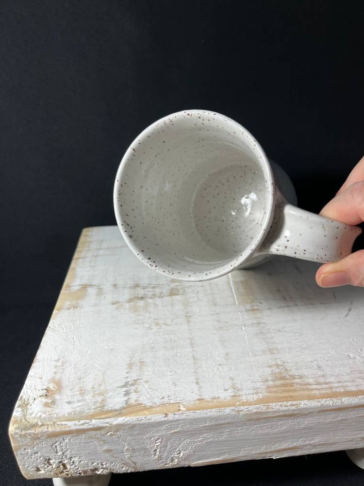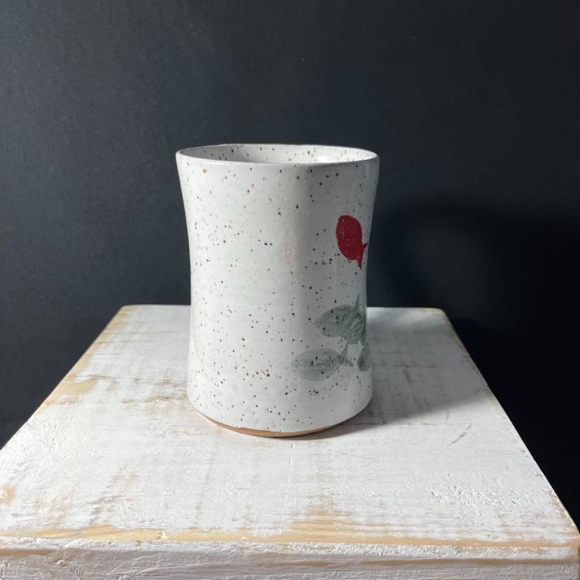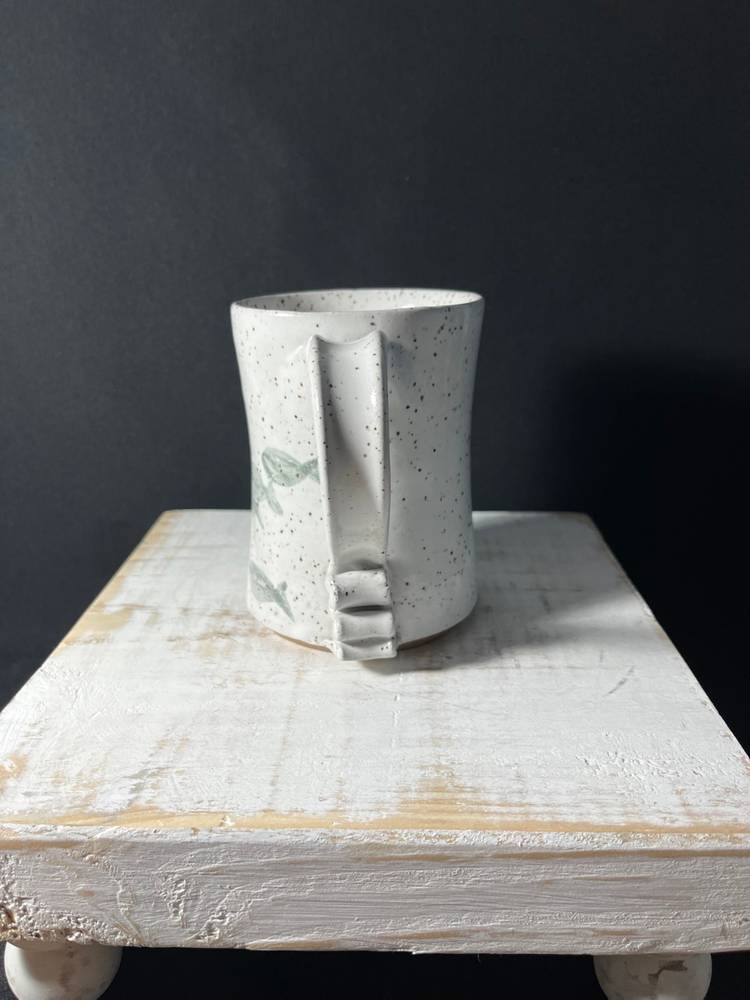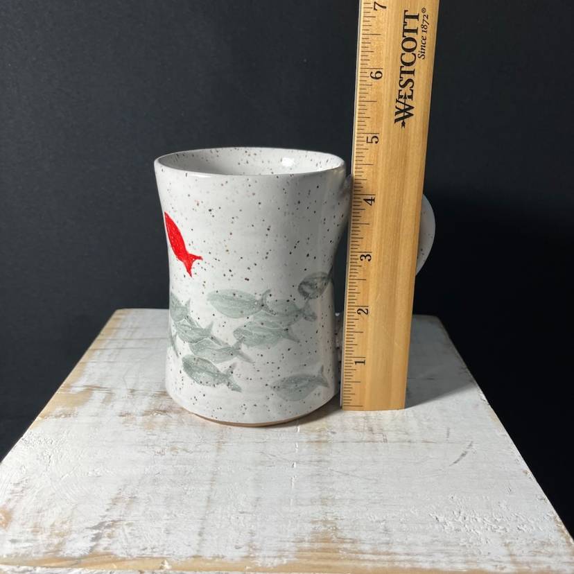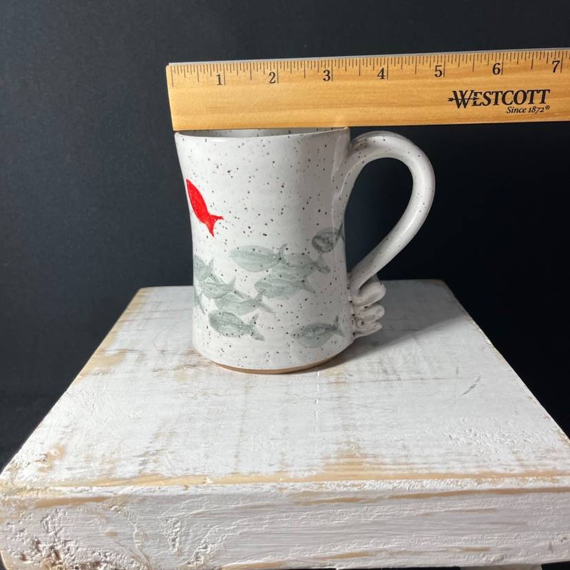 #1034 signed Studio Pottery White speckled Coffee Mug with a school of gray and one red fish on one side. Measures 4.5” tall.